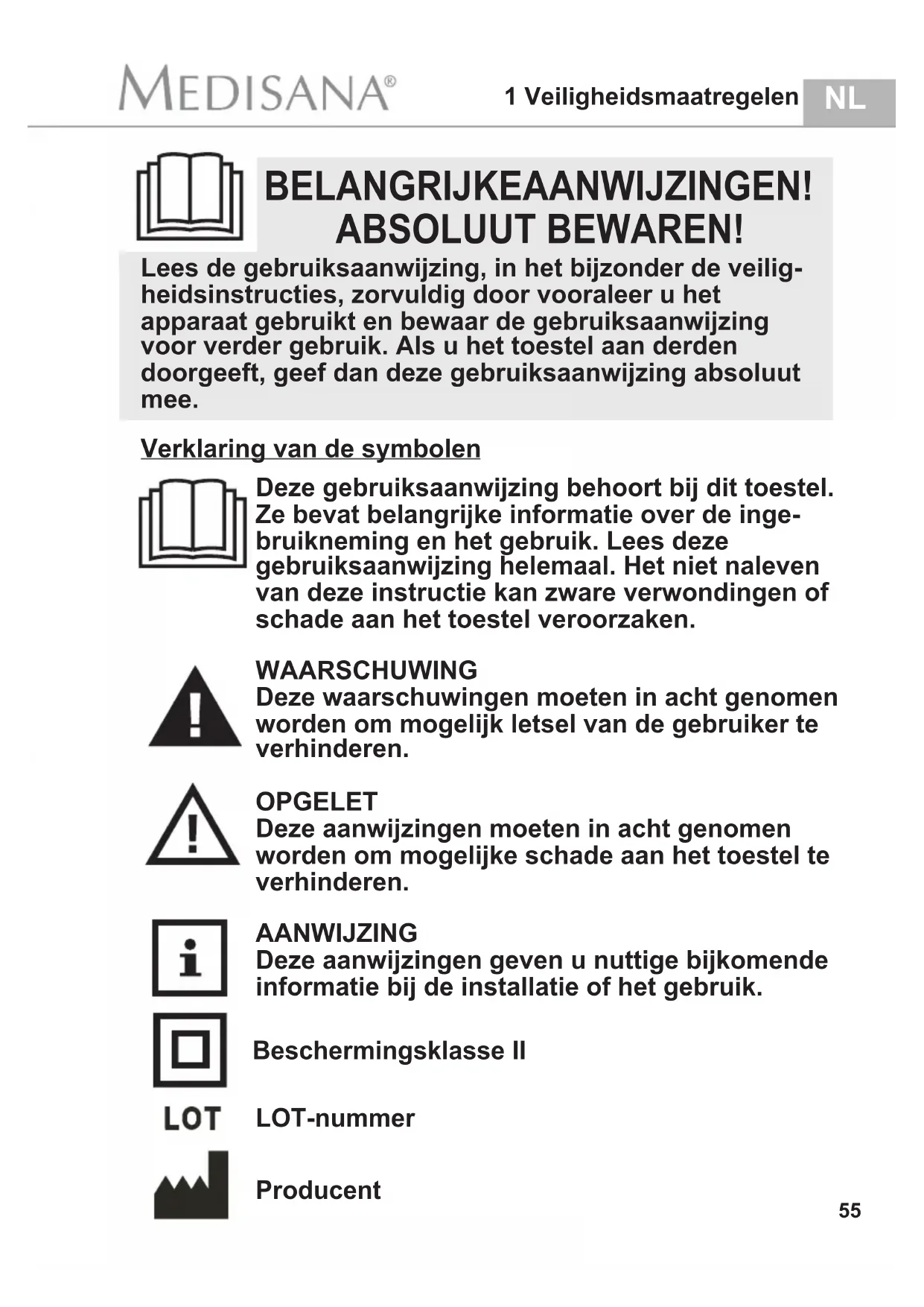 3 Aplicação 54NL 1 Veiligheidsmaatregelen BELANGRIJKEAANWIJZINGEN! ABSOLUUT BEWAREN! Deze gebruiksaanwijzing behoort bij dit toestel. Ze bevat belangrijke informatie over de inge- bruikneming en het gebruik. Lees deze gebruiksaanwijzing helemaal. Het niet naleven van deze instructie kan zware verwondingen of schade aan het toestel veroorzaken. WAARSCHUWING Deze waarschuwingen moeten in acht genomen worden om mogelijk letsel van de gebruiker te verhinderen. OPGELET Deze aanwijzingen moeten in acht genomen worden om mogelijke schade aan het toestel te verhinderen. AANWIJZING Deze aanwijzingen geven u nuttige bijkomende informatie bij de installatie of het gebruik. Verklaring van de symbolen LOT-nummer Producent Lees de gebruiksaanwijzing, in het bijzonder de veilig- heidsinstructies, zorvuldig door vooraleer u het apparaat gebruikt en bewaar de gebruiksaanwijzing voor verder gebruik. Als u het toestel aan derden doorgeeft, geef dan deze gebruiksaanwijzing absoluut mee.