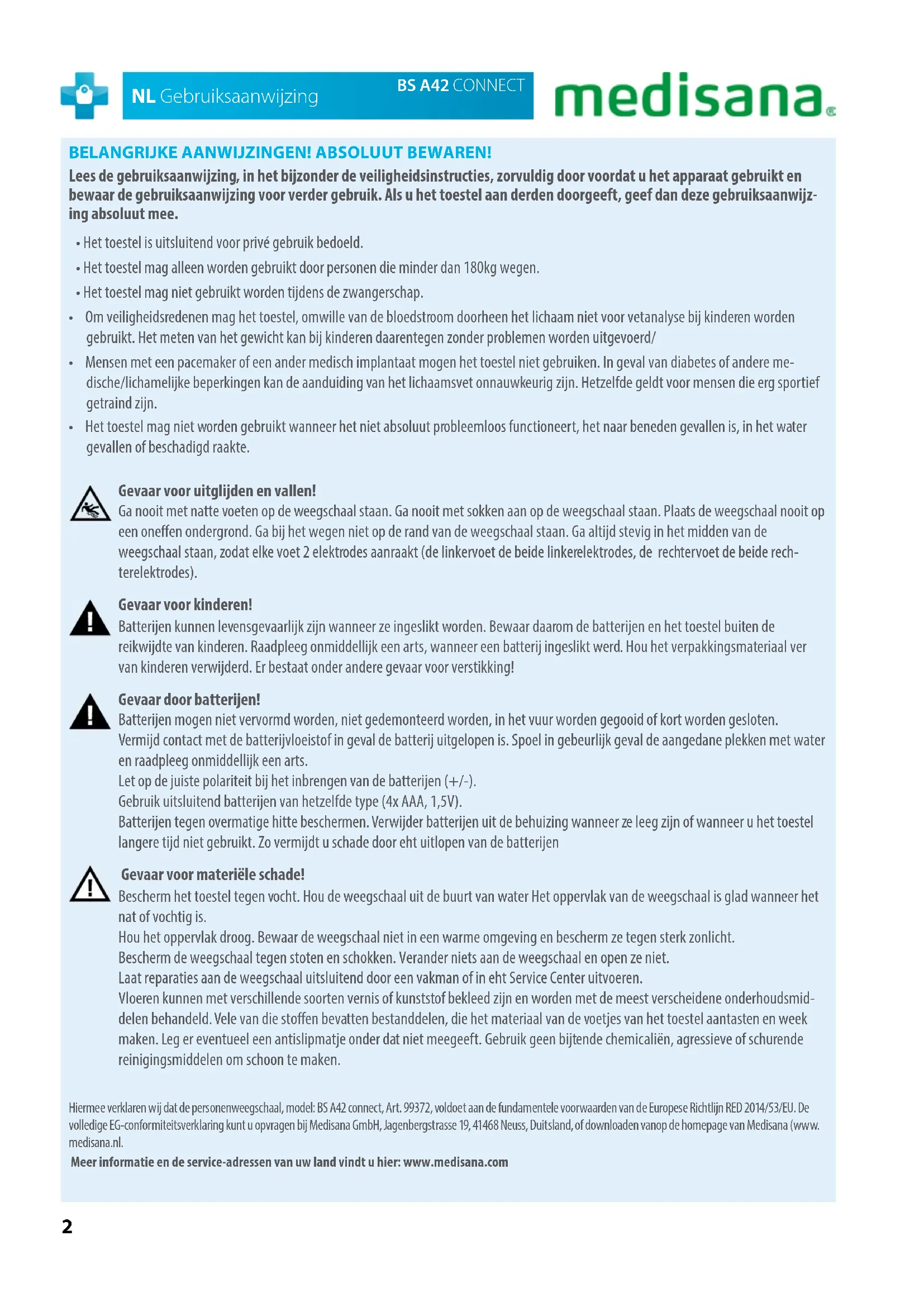 - Het toestel mag niet worden gebruikt wanneer het niet absoluut probleemloos functioneert, het naar beneden gevallen is, in het water gevallen of beschadigd raakte. Gevaar voor uitglijden en vallen! Ga nooit met natte voeten op de weegschaal staan. Ga nooit met sokken aan op de weegschaal staan. Plaats de weegschaal nooit op een oneen ondergrond. Ga bij het wegen niet op de rand van de weegschaal staan. Ga altijd stevig in het midden van de weegschaal staan, zodat elke voet 2 elektrodes aanraakt (de linkervoet de beide linkerelektrodes, de rechtervoet de beide rech- terelektrodes). Gevaar voor kinderen! Batterijen kunnen levensgevaarlijk zijn wanneer ze ingeslikt worden. Bewaar daarom de batterijen en het toestel buiten de reikwijdte van kinderen. Raadpleeg onmiddellijk een arts, wanneer een batterij ingeslikt werd. Hou het verpakkingsmateriaal ver van kinderen verwijderd. Er bestaat onder andere gevaar voor verstikking! Gevaar door batterijen! Batterijen mogen niet vervormd worden, niet gedemonteerd worden, in het vuur worden gegooid of kort worden gesloten. Vermijd contact met de batterijvloeistof in geval de batterij uitgelopen is. Spoel in gebeurlijk geval de aangedane plekken met water en raadpleeg onmiddellijk een arts. Let op de juiste polariteit bij het inbrengen van de batterijen (+/-). Gebruik uitsluitend batterijen van hetzelfde type (4x AAA, 1,5V). Batterijen tegen overmatige hitte beschermen. Verwijder batterijen uit de behuizing wanneer ze leeg zijn of wanneer u het toestel langere tijd niet gebruikt. Zo vermijdt u schade door eht uitlopen van de batterijen Gevaar voor materiële schade! Bescherm het toestel tegen vocht. Hou de weegschaal uit de buurt van water Het oppervlak van de weegschaal is glad wanneer het nat of vochtig is. Hou het oppervlak droog. Bewaar de weegschaal niet in een warme omgeving en bescherm ze tegen sterk zonlicht. Bescherm de weegschaal tegen stoten en schokken. Verander niets aan de weegschaal en open ze niet. Laat reparaties aan de weegschaal uitsluitend door een vakman of in eht Service Center uitvoeren. Vloeren kunnen met verschillende soorten vernis of kunststof bekleed zijn en worden met de meest verscheidene onderhoudsmid- delen behandeld. Vele van die stoen bevatten bestanddelen, die het materiaal van de voetjes van het toestel aantasten en week maken. Leg er eventueel een antislipmatje onder dat niet meegeeft. Gebruik geen bijtende chemicaliën, agressieve of schurende reinigingsmiddelen om schoon te maken. Hiermee verklaren wij dat de personenweegschaal, model: BS A42 connect, Art. 99372, voldoet aan de fundamentele voorwaarden van de Europese Richtlijn RED 2014/53/EU. De volledige EG-conformiteitsverklaring kunt u opvragen bij Medisana GmbH, Jagenbergstrasse 19, 41468 Neuss, Duitsland, of downloaden vanop de homepage van Medisana (www. medisana.nl. Meer informatie en de service-adressen van uw land vindt u hier: www.medisana.com3