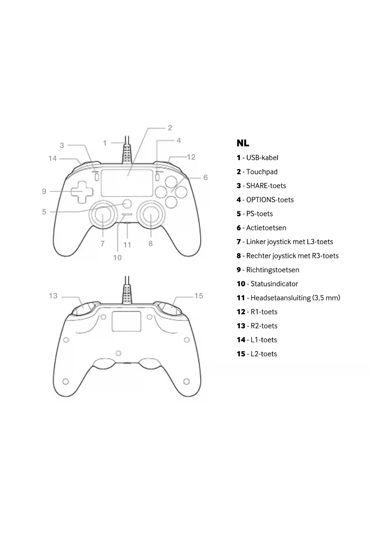 Bedankt voor de aankoop van de NACON WIRED COMPACT CONTROLLER voor het PS4™. Dit product is ontworpen om uw game-ervaring te verbeteren. Bewaar deze handleiding goed om hem later te kunnen raadplegen. Hebt u hulp nodig, neem dan contact op met de technische ondersteuning. GARANTIE Dit product met het handelsmerk NACON heeft een fabrieksgarantie van 2 jaar vanaf het moment van aankoop en zal gedurende deze periode kosteloos worden vervangen door hetzelfde of een vergelijkbaar model, door ons te bepalen, als er een defect optreedt als gevolg van ondeugdelijk materiaal of productiefouten. Deze garantie is niet van toepassing op defecten die het gevolg zijn van onopzettelijke schade, onjuist gebruik of slijtage en is uitsluitend beschikbaar voor de oorspronkelijke koper van het product. Dit is niet van invloed op uw wettelijke rechten. GEBRUIK Sluit de USB-stekker van uw WIRED COMPACT CONTROLLER aan op een van de vrije aansluitingen van uw console. Opmerking: Merk op dat de volgende functies van de DUALSHOCK®4 draadloze controller niet worden ondersteund door deze controller: geïntegreerde luidspreker, lichtbalk en SIXAXIS™ bewegingssensor. Om het functioneren van dit product te verbeteren, kunnen rmware-updates worden gepubliceerd op onze website www.nacongaming.com. Controleer deze website regelmatig. Deze controller kan ook worden gebruikt met Games on Windows®-pc’s