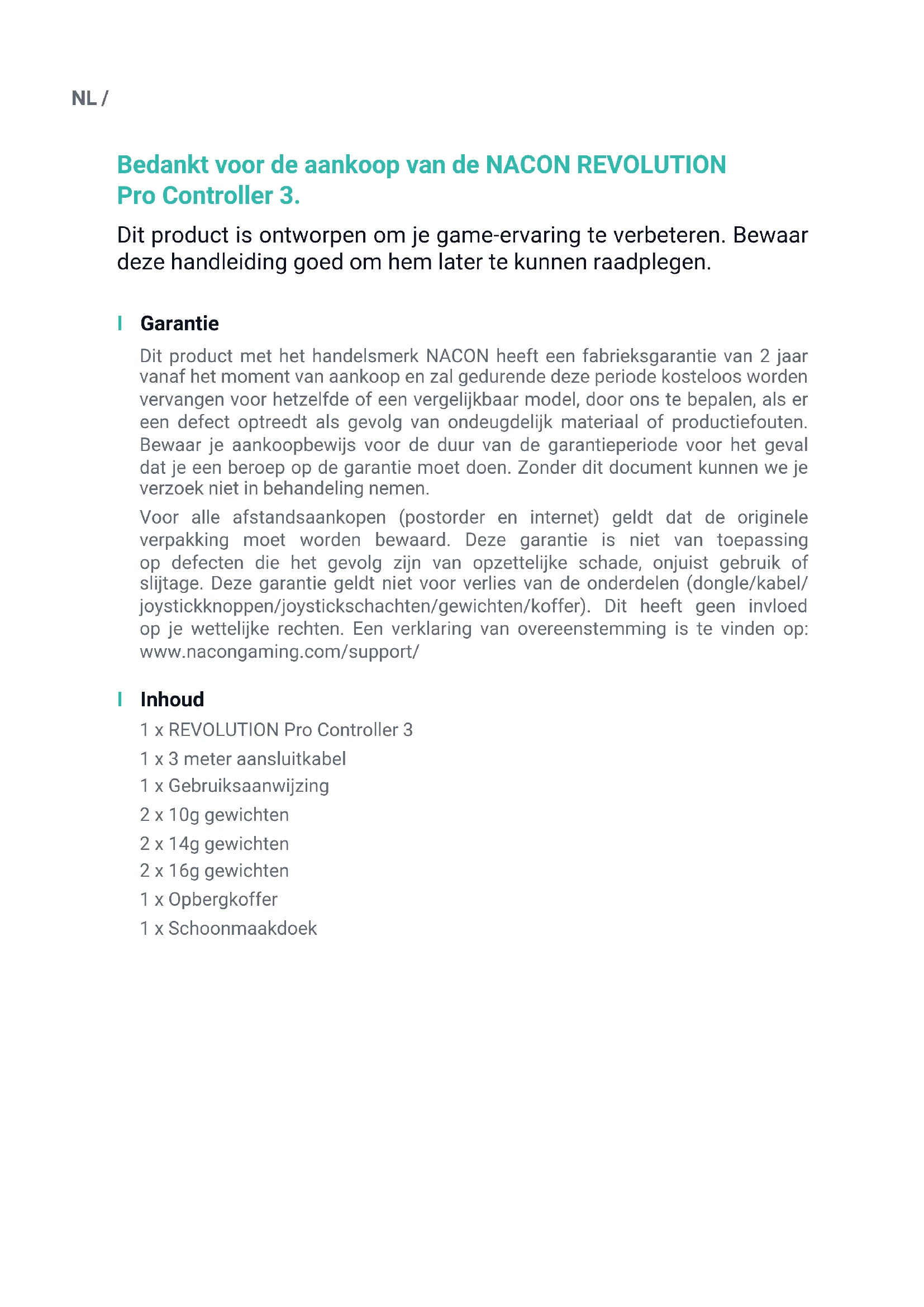 Recycling Dit product mag niet worden weggegooid met het normale huishoudelijke afval. Lever het in bij een speciaal inzamelpunt. Recycling is belangrijk en helpt het milieu beschermen door de beperking van de hoeveelheid afval. Uitsluitend EU en Turkije. I Belangrijke veiligheids- en voorzorgsmaatregelen 1/ Dit product is uitsluitend bedoeld voor gebruik binnenshuis. Stel het nooit bloot aan rechtstreeks zonlicht of natte weersomstandigheden. 2/ Stel het product niet bloot aan spatwater, regen of vocht. Dompel het product niet onder in water. 3/ Stel het product niet bloot aan stof, hoge vochtigheid, hoge temperaturen of mechanische schokken. 4/ Gebruik of open het product niet als het beschadigd is. Probeer het niet zelf te repareren. 5/ Gebruik enkel een zachte, schone en vochtige doek om de buitenkant te reinigen. Het gebruik van reinigingsmiddelen kan de behuizing mogelijk beschadigen naar binnen lekken. 6/ Til het product nooit op aan het snoer 7/ Dit apparaat is niet ontworpen om te worden gebruikt door personen (waaronder kinderen) met een verminderd lichamelijk, zintuiglijk of geestelijk vermogen, of door personen die de nodige ervaring en kennis niet bezitten tenzij ze vooraf begeleiding of instructies hebben gekregen met betrekking tot het gebruik van dit apparaat van iemand die verantwoordelijk is voor hun veiligheid. Laat het product niet onbeheerd achter en houd het buiten bereik van kinderen. Niet geschikt voor kinderen jonger dan 7 jaar, het snoer kan zich rond de nek wikkelen. I Ergonomie Als je je hand lange tijd in dezelfde positie houdt, kan dit leiden tot pijnklachten. Raadpleeg een arts als dit vaker gebeurt. We raden je aan uit voorzorg elk uur een kwartier pauze te nemen.NL / I Klantendienst Voor meer informatie kan je contact opnemen met de Hotline. Zorg ervoor dat je zoveel mogelijk informatie hebt verzameld over het product en het probleem voordat je contact opneemt. Email : support.nl@nacongaming.com In Nederland gedistribueerd door: Bigben Interactive Nederland B.V ’s-Gravelandseweg 80 1217 EW Hilversum, Nederland Website: www.nacongaming.com In België: E-mail : support.be@nacongaming.com Website: www.nacongaming.com Adres : Bigben Interactive Belgium s.a./n.v. Waterloo Ofce Park / Bâtiment H Drève Richelle 161 bte 15, 1410 Waterloo, Belgium (België)ES / Gracias por comprar el NACON™ REVOLUTION Pro Controller 3. Este producto ha sido diseñado para mejorar su experiencia en videojuegos. Conserve este manual de instrucciones para futuras consultas. I Garantía Este producto, de la marca comercial NACON, está garantizado por el fabricante durante un período de 2 año a partir de la fecha de compra. Ante un defecto de materiales o de fabricación durante este tiempo, será reemplazado por el mismo modelo o por uno similar a su elección sin cargo. Para cualquier solicitud de garantía o reclamación, guarde el recibo de compra mientras esté en vigor la garantía. Sin este documento no podremos procesar su solicitud. Guarde el embalaje original de todas las compras que realice a distancia (bien sea por correo o por Internet). La garantía no cubre defectos derivados de daños accidentales, uso incorrecto o desgaste natural. Esta garantía no cubre la pérdida de piezas (cable/pesas/funda de almacenamiento). Esto no afecta a sus derechos legales. Para acceder a la declaración de conformidad, vaya a: www.nacongaming.com/es/my-nacon/soporte/ I Contenido 1 x REVOLUTION Pro Controller 3 1 x cable de conexión de 3m 1 x manual de instrucciones 2 x pesos de 10g 2 x pesos de 14g 2 x pesos de 16g 1 x funda 1 x paño de limpiezaES / I Descripción de elementos