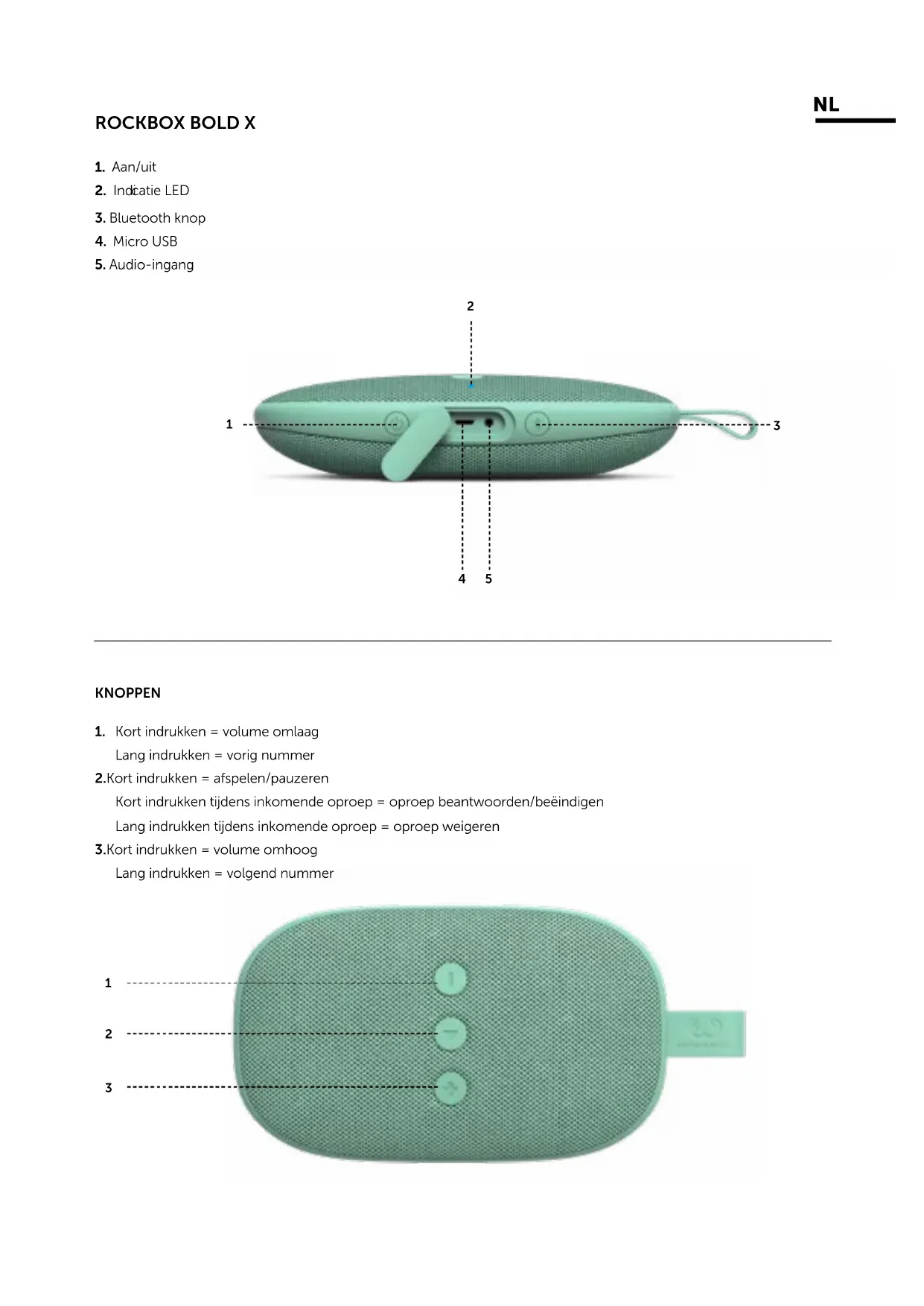 De LED indicator bovenop de speaker kleurt rood als de speaker wordt opgeladen en gaat uit wanneer de speaker volledig is opgeladen.2. Zet de speaker aan.Je hoort een watergeluid zodra de speaker opstart ende indicatie LED wordt wit.4. Maak verbinding met je telefoon/tablet/laptop etc.Schakel Bluetooth in op jouw apparaat en selecteer‘Rockbox Bold X’ in de lijst met beschikbare apparaten.Het LED lichtje wordt wit wanneer de Bluetoothverbinding is gemaakt.3. Druk op de Bluetooth knop.Wanneer de indicatie LED langzaam blauw knippert, is jespeaker klaar om via Bluetooth te verbinden.Schakel voordat je begint Bluetooth op je telefoon/laptop/tablet even uit en check of beide speakers zijn uitgeschakeld.1. Zet de eerste speaker aan Aan de zijkant van de speaker, vind je de aan/uit knop. Zet de eerste speaker aan. Het LED lichtje moet nu langzaam blauw knipperen (als er geen apparaat is verbonden of een 3.5mm kabel is aangesloten).2. Zet de tweede speaker aan Aan de zijkant van de speaker, vind je de aan/uit knop. Zet nu ook de tweede speaker aan.3. Verbind de tweede speaker met de eerste Druk twee keer op de Bluetooth knop van de tweede speaker. Het lichtje moet nu langzaam paars knipperen. Je hoort nu een “bleep” ter confirmatie dat beide speakers met elkaar in verbinding staan.4. Zet nu de Bluetooth aan op je telefoon/laptop/tablet Activeer Bluetooth en selecteer in het Bluetooth menu de beschikbare speaker. Je hoort nogmaals een “bleep” als je apparaat is verbonden.NU KUN JE LUISTEREN IN “DOUBLE FUN MODE”!