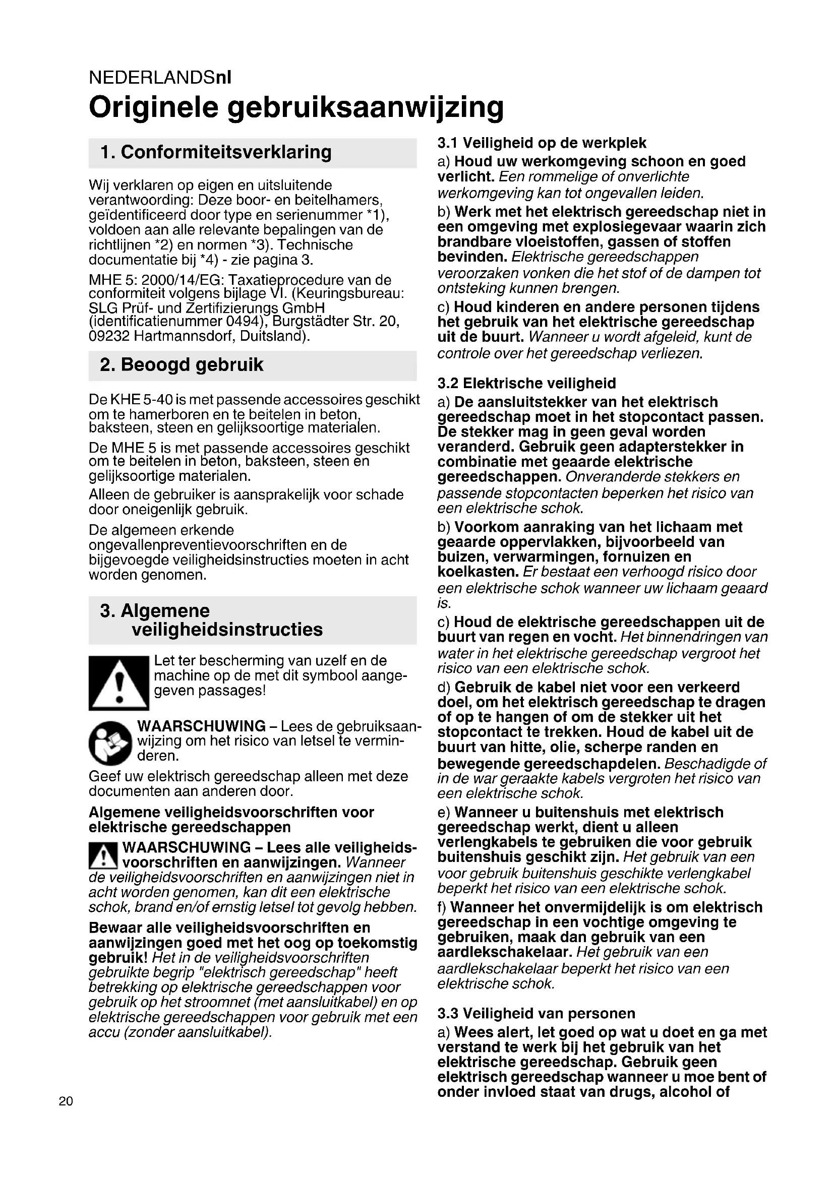 Originele gebruiksaanwijzing Wij verklaren op eigen en uitsluitende verantwoording: Deze boor- en beitelhamers, geïdentificeerd door type en serienummer *1), voldoen aan alle relevante bepalingen van de richtlijnen *2) en normen *3). Technische documentatie bij *4) - zie pagina 3. MHE 5: 2000/14/EG: Taxatieprocedure van de conformiteit volgens bijlage VI. (Keuringsbureau: SLG Prüf- und Zertifizierungs GmbH (identificatienummer 0494), Burgstädter Str. 20, 09232 Hartmannsdorf, Duitsland). De KHE 5-40 is met passende accessoires geschikt om te hamerboren en te beitelen in beton, baksteen, steen en gelijksoortige materialen. De MHE 5 is met passende accessoires geschikt om te beitelen in beton, baksteen, steen en gelijksoortige materialen. Alleen de gebruiker is aansprakelijk voor schade door oneigenlijk gebruik. De algemeen erkende ongevallenpreventievoorschriften en de bijgevoegde veiligheidsinstructies moeten in acht worden genomen. Let ter bescherming van uzelf en de machine op de met dit symbool aange- geven passages! WAARSCHUWING – Lees de gebruiksaan- wijzing om het risico van letsel te vermin- deren. Geef uw elektrisch gereedschap alleen met deze documenten aan anderen door. Algemene veiligheidsvoorschriften voor elektrische gereedschappen WAARSCHUWING – Lees alle veiligheids- voorschriften en aanwijzingen. Wanneer de veiligheidsvoorschriften en aanwijzingen niet in acht worden genomen, kan dit een elektrische schok, brand en/of ernstig letsel tot gevolg hebben. Bewaar alle veiligheidsvoorschriften en aanwijzingen goed met het oog op toekomstig gebruik! Het in de veiligheidsvoorschriften gebruikte begrip "elektrisch gereedschap" heeft betrekking op elektrische gereedschappen voor gebruik op het stroomnet (met aansluitkabel) en op elektrische gereedschappen voor gebruik met een accu (zonder aansluitkabel).