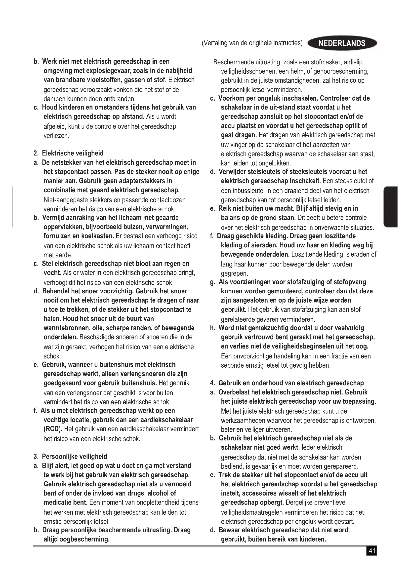 a. Houd uw werkomgeving schoon en goed verlicht. Op rommelige of donkere plekken zullen sneller ongelukken gebeuren.41 (Vertaling van de originele instructies) NEDERLANDS b. Werk niet met elektrisch gereedschap in een omgeving met explosiegevaar, zoals in de nabijheid van brandbare vloeistoffen, gassen of stof. Elektrisch gereedschap veroorzaakt vonken die het stof of de dampen kunnen doen ontbranden. c. Houd kinderen en omstanders tijdens het gebruik van elektrisch gereedschap op afstand. Als u wordt afgeleid, kunt u de controle over het gereedschap verliezen.