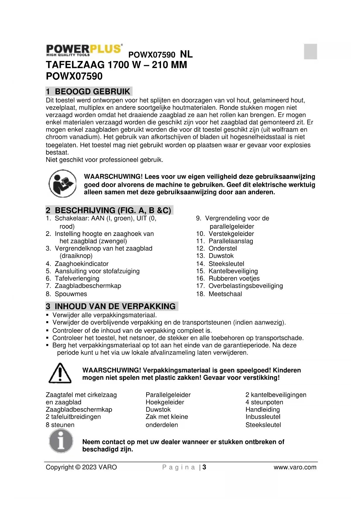 - Berg het verpakkingsmateriaal op tot aan het einde van de garantieperiode. Na deze periode kunt u het via uw lokale afvalinzameling laten verwijderen. WAARSCHUWING! Verpakkingsmateriaal is geen speelgoed! Kinderen mogen niet spelen met plastic zakken! Gevaar voor verstikking! Zaagtafel met cirkelzaag en zaagblad Zaagbladbeschermkap 2 tafeluitbreidingen 8 steunen Parallelgeleider Hoekgeleider Duwstok Zak met kleine onderdelen 2 kantelbeveiligingen 4 steunpoten Handleiding Inbussleutel Steeksleutel Neem contact op met uw dealer wanneer er stukken ontbreken of beschadigd zijn.POWX07590 NL Copyright © 2023 VARO P a g i n a | 4 www.varo.com