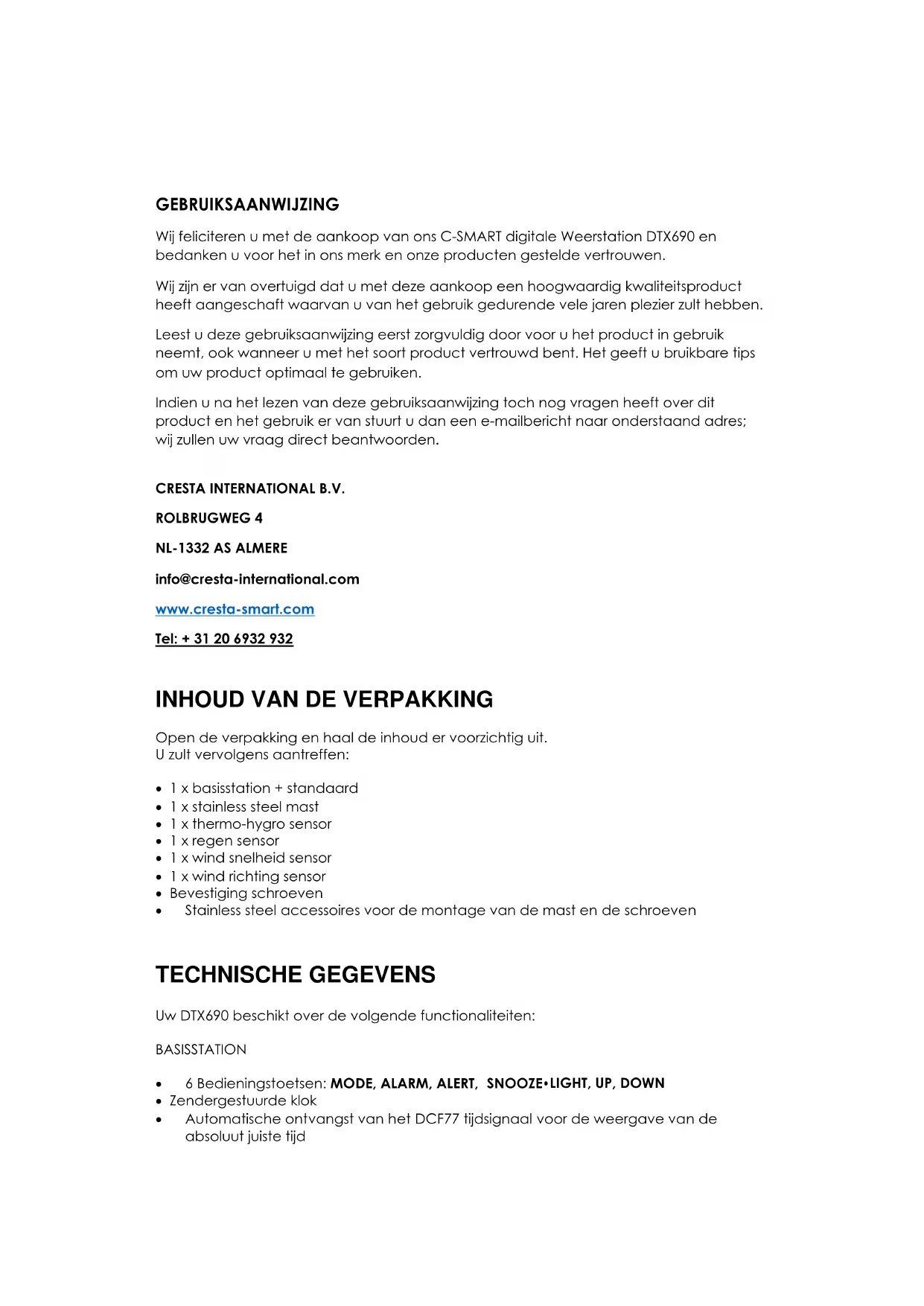 Wij feliciteren u met de aankoop van ons C-SMART digitale Weerstation DTX690 en bedanken u voor het in ons merk en onze producten gestelde vertrouwen.