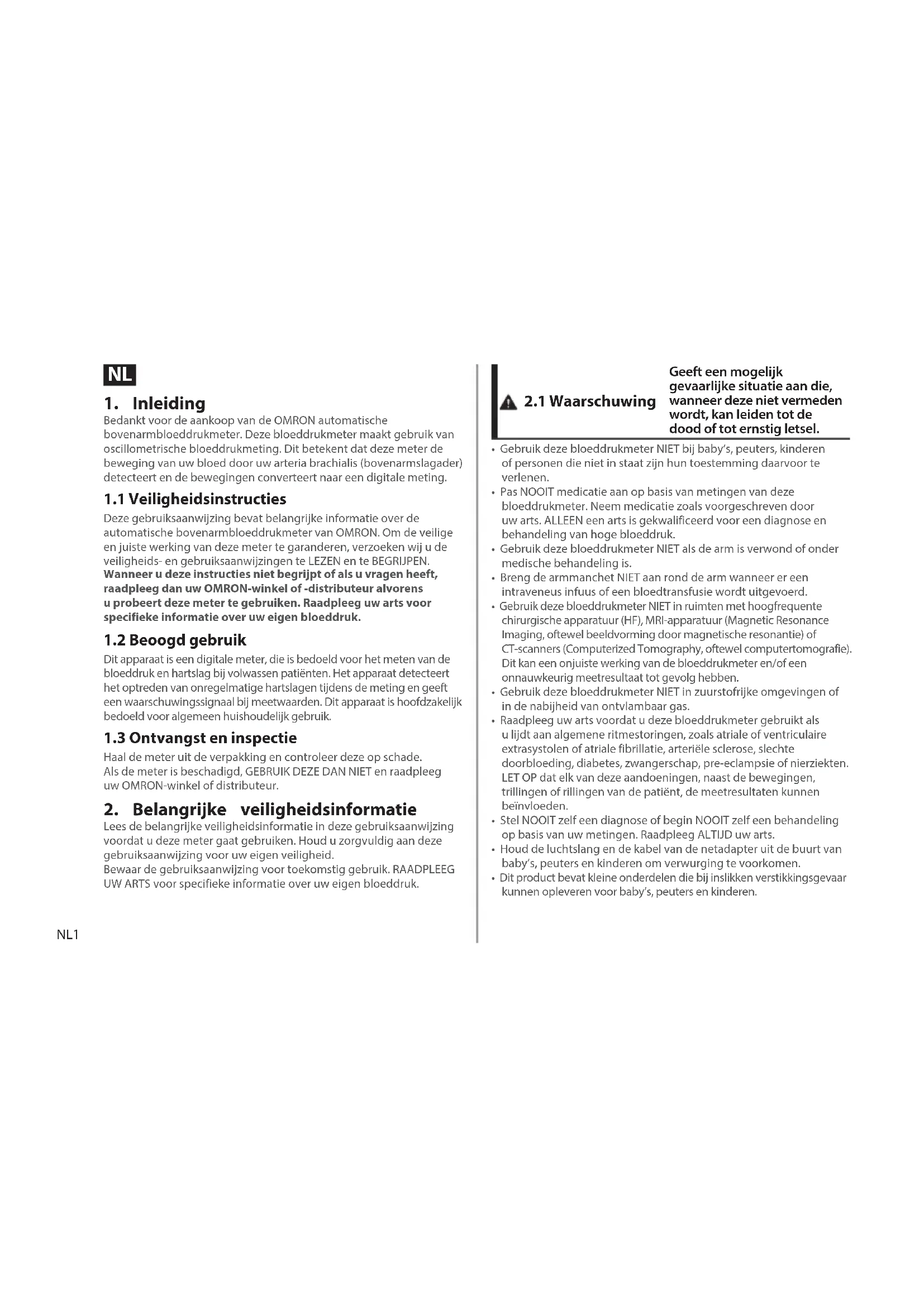 Lees de belangrijke veiligheidsinformatie in deze gebruiksaanwijzing voordat udeze meter gaat gebruiken. Houd uzorgvuldig aan deze gebruiksaanwijzing voor uw eigen veiligheid. Bewaar de gebruiksaanwijzing voor toekomstig gebruik. RAADPLEEG UW ARTS voor specifieke informatie over uw eigen bloeddruk.