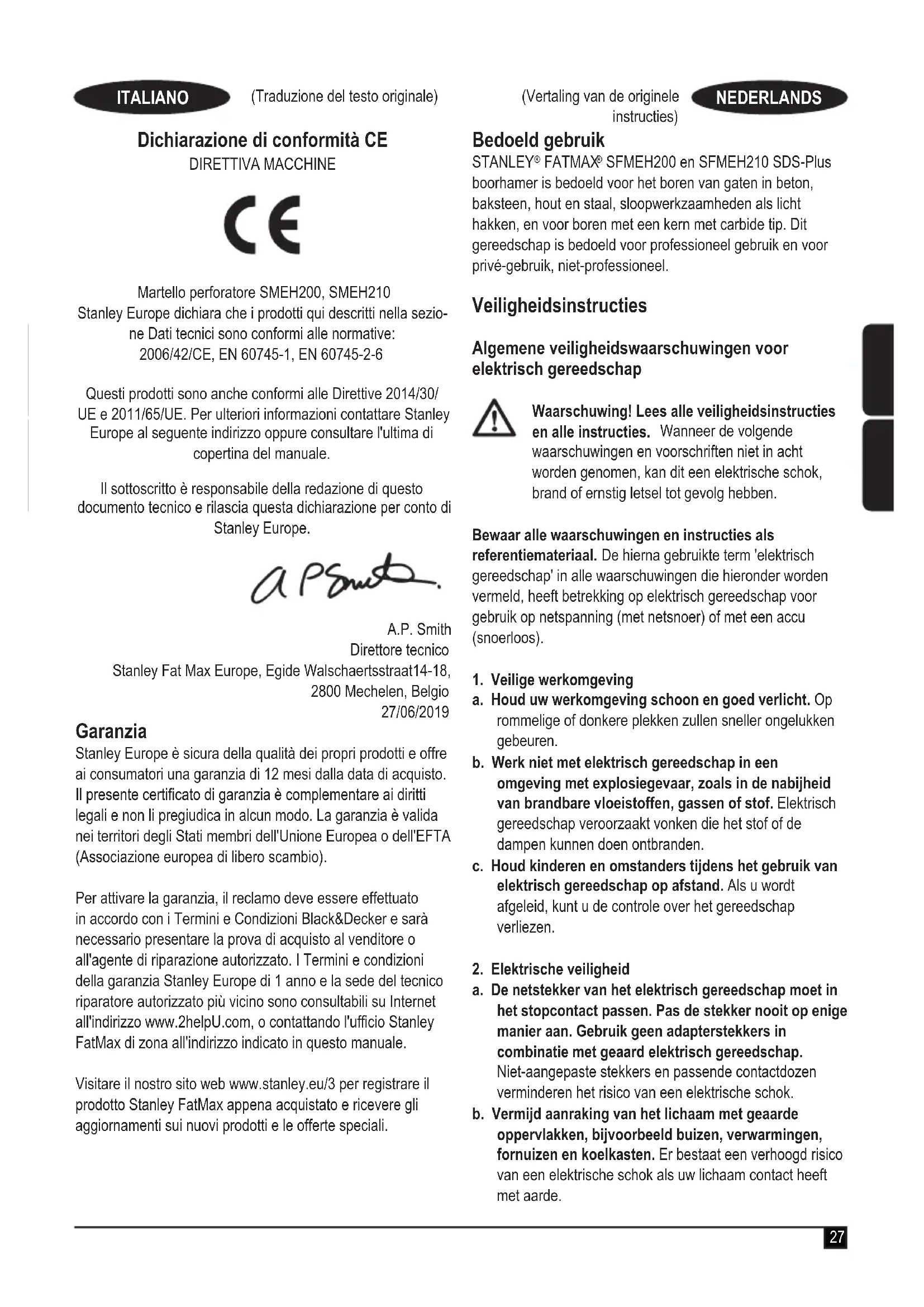 SMEH200, SMEH210 Hamerboormachine Stanley Europe verklaart dat deze producten, beschreven onder "Technische gegevens", voldoen aan: 2006/42/EG, EN 60745-1, EN 60745-2-6 Deze producten voldoen ook aan richtlijn 2014/30/EU en 2011/65/EU. Neem voor meer informatie contact op met Stanley Europe op het volgende adres of raadpleeg de achterzijde van de handleiding. Ondergetekende is verantwoordelijk voor de compilatie van het technische bestand en geeft deze verklaring namens Stanley Europe af. A.P. Smith Technical Director Stanley Fat Max Europe, Egide Walschaertsstraat14-18, 2800 Mechelen, België 27-6-201934 (Traducción de las instrucciones originales) ESPAÑOL Uso previsto Los martillos rotativos FATMAX