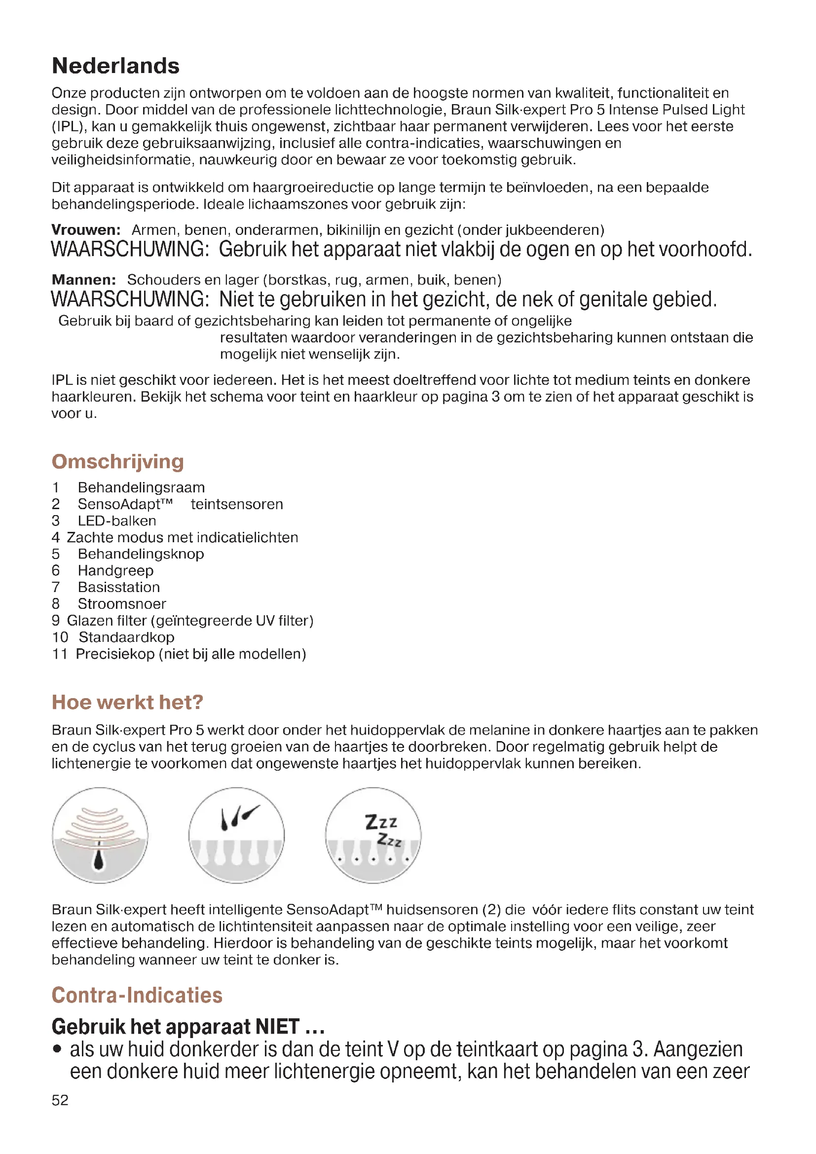 è inoltre possibile consegnare gratuitamente, senza obbligo di acquisto, i prodotti elettronici da smaltire con dimensioni inferiori a 25 cm. L’adeguata raccolta differenziata per l’avvio successivo dell’apparecchiatura dismessa al riciclaggio, al trattamento e allo smaltimento ambientalmente compatibile contribuisce ad evitare possibili effetti negativi sull’ambiente e sulla salute e favorisce il reimpiego e/o riciclo dei materiali di cui è composta l’apparecchiatura. Soggetto a modifica senza preavviso. Garanzia Braun fornisce una garanzia valevole per la durata di 2 anni dalla data di acquisto. Nel periodo di garanzia verranno eliminati, gratuitamente, i guasti dell’apparecchio conseguenti a difetti di fabbrica o di materiali, sia riparando il prodotto sia sostituendo, se necessario, l’intero apparecchio. Tale garanzia non copre: danni derivanti dall’uso improprio del prodotto, la normale usura conseguente al funzionamento dello stesso, i difetti che hanno un effetto trascurabile sul valore o sul funzionamento dell’apparecchio. La garanzia decade se vengono effettuate riparazioni da soggetti non autorizzati o con parti non originali Braun. Per accedere al servizio durante il periodo di garanzia, è necessario consegnare o far pervenire il prodotto integro, insieme allo scontrino di acquisto, ad un Centro di Assistenza autorizzato Braun. Contattare www.service.braun.com o il numero 800 440 017 per avere informazioni sul Centro di Assistenza autorizzato Braun più vicino. 91816146_Victoria_Pro5_Euro_01.indd 5191816146_Victoria_Pro5_Euro_01.indd 51 28.06.18 14:4928.06.18 14:49 Business Use - P&G AUTHORIZED POA-00053643 Rev 001 Effective Date 2018-07-02 Printed 2018-07-25 Page 51 of 9452 Nederlands Onze producten zijn ontworpen om te voldoen aan de hoogste normen van kwaliteit, functionaliteit en design. Door middel van de professionele lichttechnologie, Braun Silk·expert Pro 5 Intense Pulsed Light (IPL), kan u gemakkelijk thuis ongewenst, zichtbaar haar permanent verwijderen. Lees voor het eerste gebruik deze gebruiksaanwijzing, inclusief alle contra-indicaties, waarschuwingen en veiligheidsinformatie, nauwkeurig door en bewaar ze voor toekomstig gebruik. Dit apparaat is ontwikkeld om haargroeireductie op lange termijn te beïnvloeden, na een bepaalde behandelingsperiode. Ideale lichaamszones voor gebruik zijn: Vrouwen: Armen, benen, onderarmen, bikinilijn en gezicht (onder jukbeenderen) WAARSCHUWING: Gebruik het apparaat niet vlakbij de ogen en op het voorhoofd. Mannen: Schouders en lager (borstkas, rug, armen, buik, benen) WAARSCHUWING: Niet te gebruiken in het gezicht, de nek of genitale gebied. Gebruik bij baard of gezichtsbeharing kan leiden tot permanente of ongelijke resultaten waardoor veranderingen in de gezichtsbeharing kunnen ontstaan die mogelijk niet wenselijk zijn. IPL is niet geschikt voor iedereen. Het is het meest doeltreffend voor lichte tot medium teints en donkere haarkleuren. Bekijk het schema voor teint en haarkleur op pagina 3 om te zien of het apparaat geschikt is voor u. Omschrijving 1 Behandelingsraam 2 SensoAdapt™ teintsensoren 3 LED-balken 4 Zachte modus met indicatielichten 5 Behandelingsknop 6 Handgreep 7 Basisstation 8 Stroomsnoer 9 Glazen filter (geïntegreerde UV filter) 10 Standaardkop 11 Precisiekop (niet bij alle modellen) Hoe werkt het? Braun Silk·expert Pro 5 werkt door onder het huidoppervlak de melanine in donkere haartjes aan te pakken en de cyclus van het terug groeien van de haartjes te doorbreken. Door regelmatig gebruik helpt de lichtenergie te voorkomen dat ongewenste haartjes het huidoppervlak kunnen bereiken. Braun Silk·expert heeft intelligente SensoAdapt