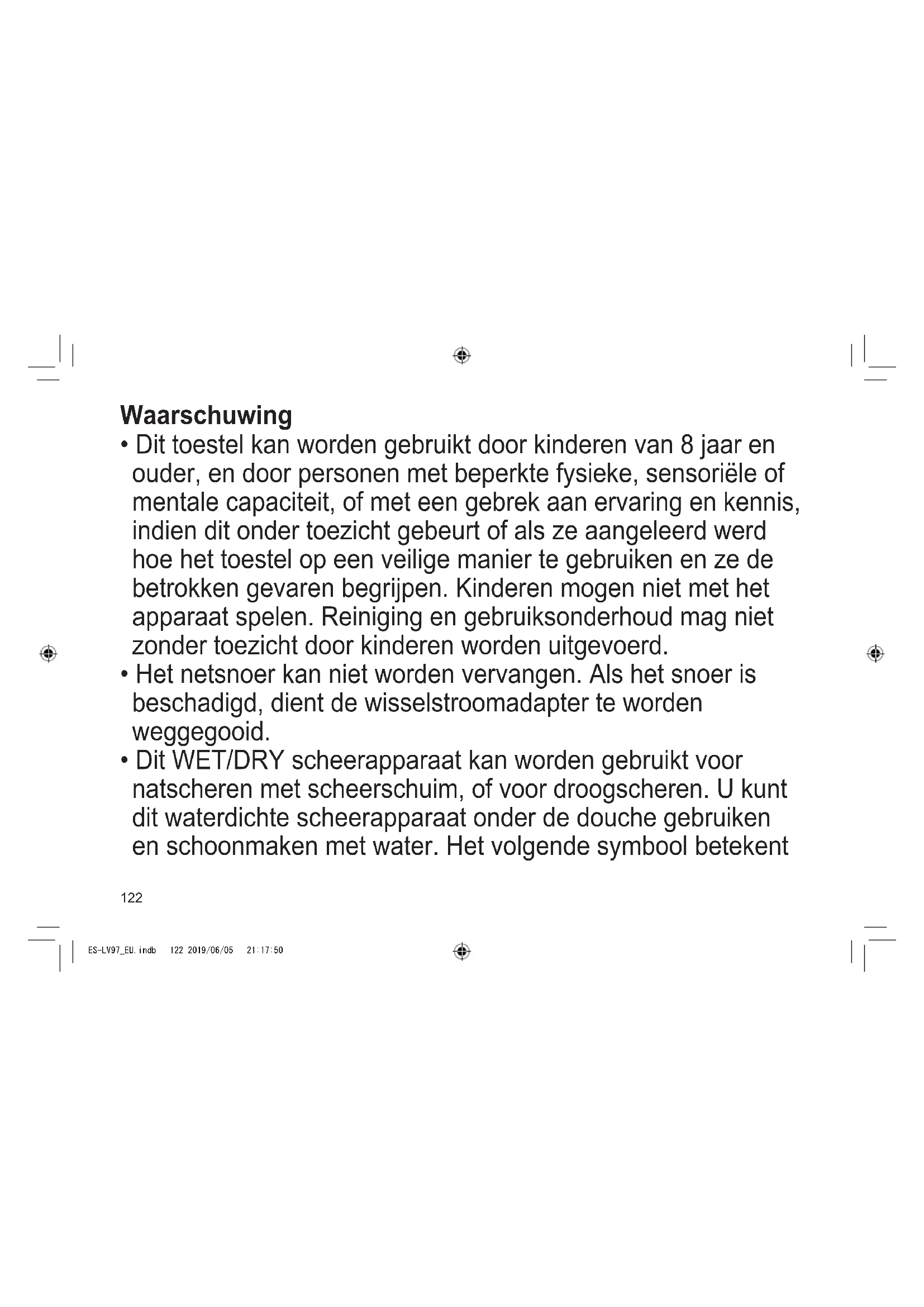 - Dit WET/DRY scheerapparaat kan worden gebruikt voor natscheren met scheerschuim, of voor droogscheren. U kunt dit waterdichte scheerapparaat onder de douche gebruiken en schoonmaken met water. Het volgende symbool betekent ES-LV97_EU.indb 122 2019/06/05 21:17:50123 TR RO H SK CZ PL FIN S N P DK E NL I F D GB geschikt voor gebruik in bad of onder de douche.