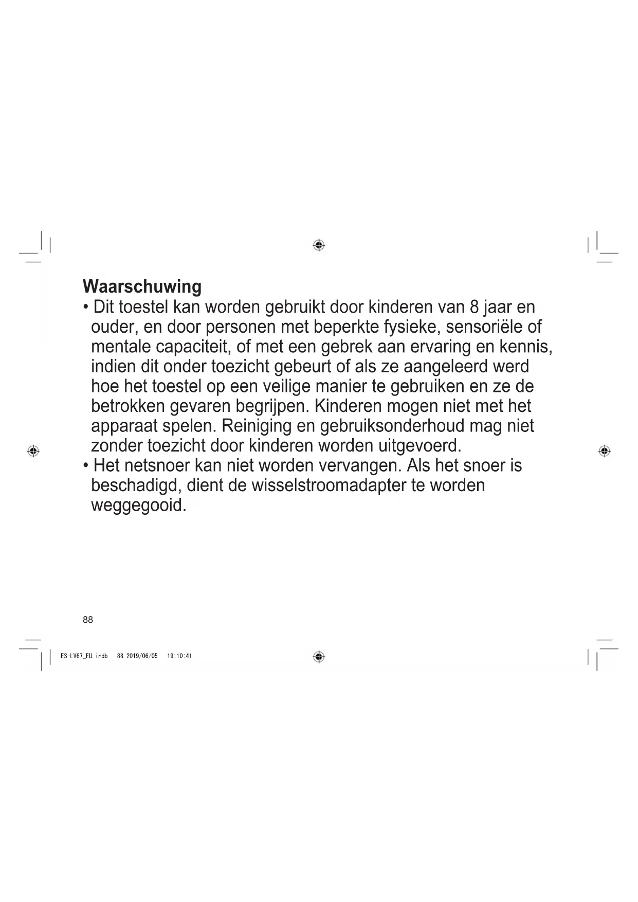 - Het netsnoer kan niet worden vervangen. Als het snoer is beschadigd, dient de wisselstroomadapter te worden weggegooid. ES-LV67_EU.indb 88 2019/06/05 19:10:4189 TR RO H SK CZ PL FIN S N P DK E NL I F D GB