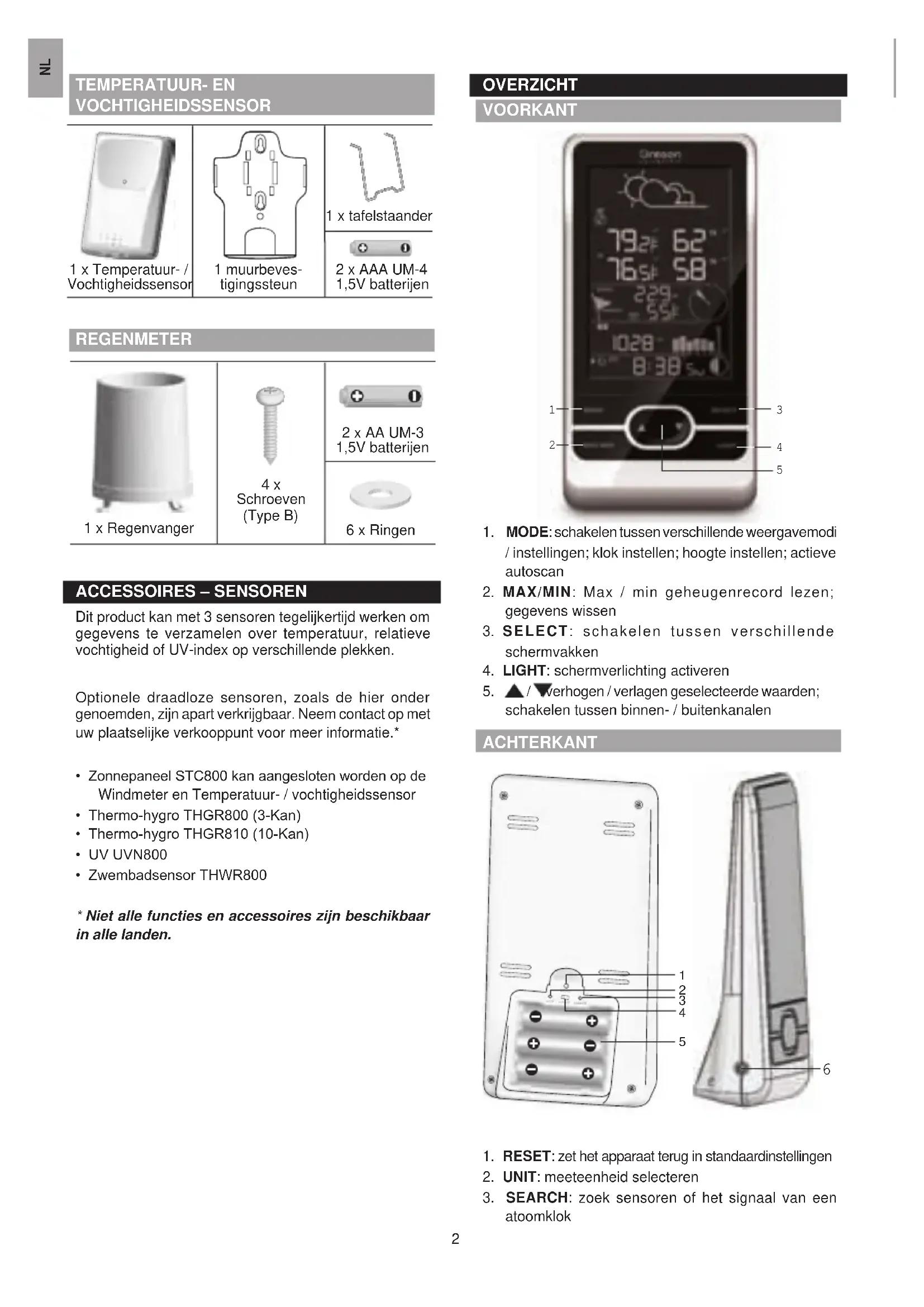 TEMPERATUUR- EN VOCHTIGHEIDSSENSOR REGENMETER ACCESSOIRES – SENSOREN Dit product kan met 3 sensoren tegelijkertijd werken om gegevens te verzamelen over temperatuur, relatieve vochtigheid of UV-index op verschillende plekken. Optionele draadloze sensoren, zoals de hier onder genoemden, zijn apart verkrijgbaar. Neem contact op met uw plaatselijke verkooppunt voor meer informatie.*