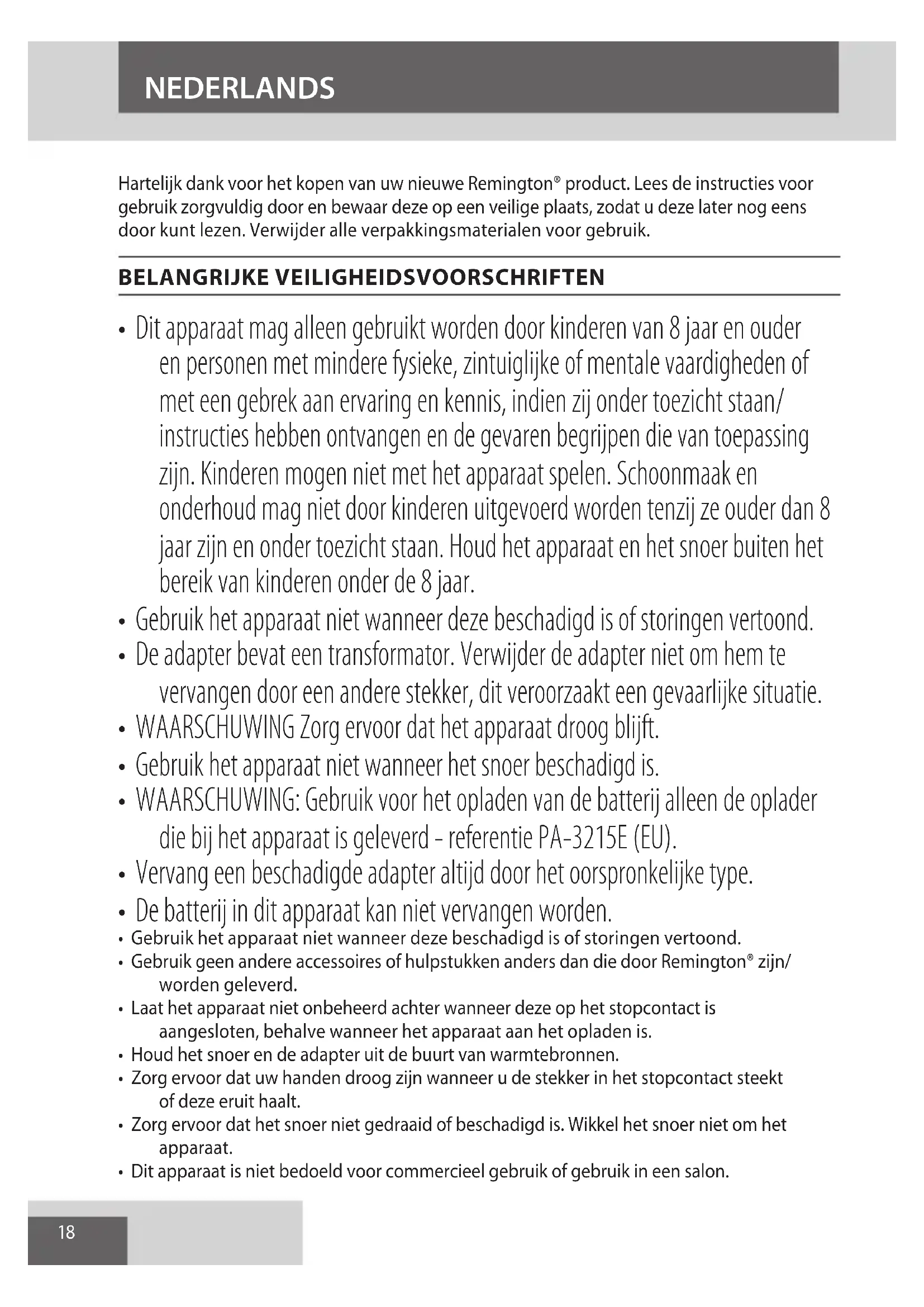 - Gebruik geen andere accessoires of hulpstukken anders dan die door Remington® zijn/ worden geleverd.