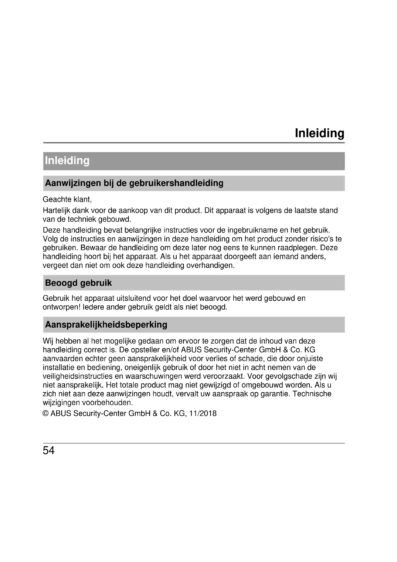 Inleiding Aanwijzingen bij de gebruikershandleiding Geachte klant, Hartelijk dank voor de aankoop van dit product. Dit apparaat is volgens de laatste stand van de techniek gebouwd. Deze handleiding bevat belangrijke instructies voor de ingebruikname en het gebruik. Volg de instructies en aanwijzingen in deze handleiding om het product zonder risico's te gebruiken. Bewaar de handleiding om deze later nog eens te kunnen raadplegen. Deze handleiding hoort bij het apparaat. Als u het apparaat doorgeeft aan iemand anders, vergeet dan niet om ook deze handleiding overhandigen. Beoogd gebruik Gebruik het apparaat uitsluitend voor het doel waarvoor het werd gebouwd en ontworpen! Iedere ander gebruik geldt als niet beoogd. Aansprakelijkheidsbeperking Wij hebben al het mogelijke gedaan om ervoor te zorgen dat de inhoud van deze handleiding correct is. De opsteller en/of ABUS Security-Center GmbH & Co. KG aanvaarden echter geen aansprakelijkheid voor verlies of schade, die door onjuiste installatie en bediening, oneigenlijk gebruik of door het niet in acht nemen van de veiligheidsinstructies en waarschuwingen werd veroorzaakt. Voor gevolgschade zijn wij niet aansprakelijk. Het totale product mag niet gewijzigd of omgebouwd worden. Als u zich niet aan deze aanwijzingen houdt, vervalt uw aanspraak op garantie. Technische wijzigingen voorbehouden. © ABUS Security-Center GmbH & Co. KG, 11/2018Veiligheidsinstructies