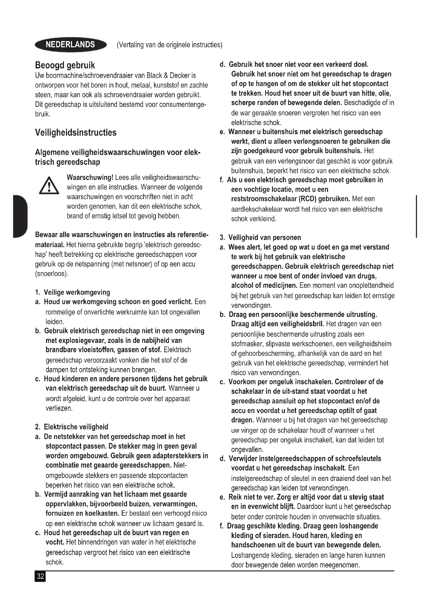 Kevin Hewitt Vice-President Global Engineering Black & Decker Europe, 210 Bath Road, Slough, Berkshire, SL1 3YD Verenigd Koninkrijk 20/01/2014 13/25 16/2839 (Vertaling van de originele instructies) NEDERLANDS Garantie Black & Decker heeft vertrouwen in haar producten en biedt een uitstekende garantie. Deze garantiebepalingen vormen een aanvulling op uw wettelijke rechten en beperken deze niet. De garantie geldt in de lidstaten van de Europese Unie en de Europese Vrijhandelsassociatie. Mocht uw Black & Decker product binnen 24 maanden na de datum van aankoop defect raken ten gevolge van materi- aal- of constructiefouten, dan garanderen wij de kosteloze vervanging van defecte onderdelen, de reparatie van het product of de vervanging van het product, tenzij: u Het product is gebruikt voor handelsdoeleinden, profes- sionele toepassingen of verhuurdoeleinden. u Het product onoordeelkundig is gebruikt. u Het product is beschadigd door invloeden van buitenaf of door een ongeval. u Reparaties zijn uitgevoerd door anderen dan onze serv- icecentra of Black & Decker-personeel. Om een beroep te doen op de garantie, dient u een aankoopbewijs te overhandigen aan de verkoper of een van onze servicecentra. U kunt het adres van het dichtstbijzijnde Black & Decker-servicecentrum opvragen via de adressen op de achterzijde van deze handleiding. U kunt ook een lijst van Black & Decker-servicecentra en meer informatie m.b.t. onze klantenservice vinden op het volgende internetadres: www.2helpU.com Bezoek onze website www.blackanddecker.nl om uw nieuwe Black & Decker-product te registreren en voor informatie over nieuwe producten en speciale aanbiedingen. Verdere informatie over het merk Black & Decker en onze producten vindt u op www.blackanddecker.nl.40 (Traducción de las instrucciones originales) ESPAÑOL Uso previsto El taladro/destornillador Black & Decker se ha diseñado para atornillar y para taladrar madera, metal, plásticos y mampost- ería ligera. Esta herramienta está pensada únicamente para uso doméstico. Instrucciones de seguridad Advertencias de seguridad generales para herrami- entas eléctricas