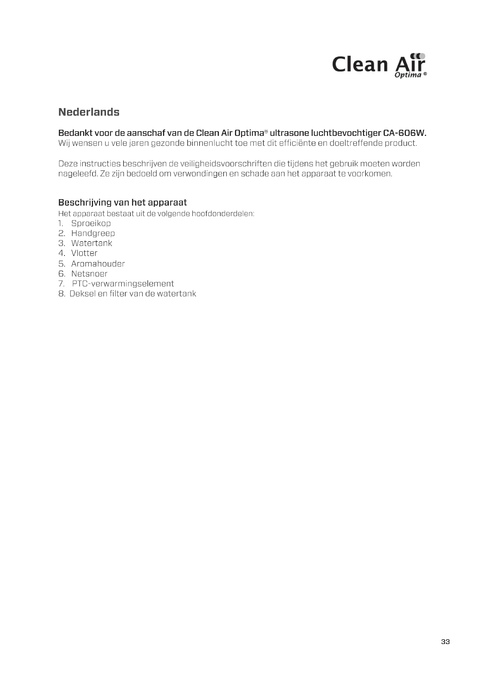 Bedankt voor de aanschaf van de Clean Air Optima® ultrasone luchtbevochtiger CA-606W. Wij wensen u vele jaren gezonde binnenlucht toe met dit efficiënte en doeltreffende product.