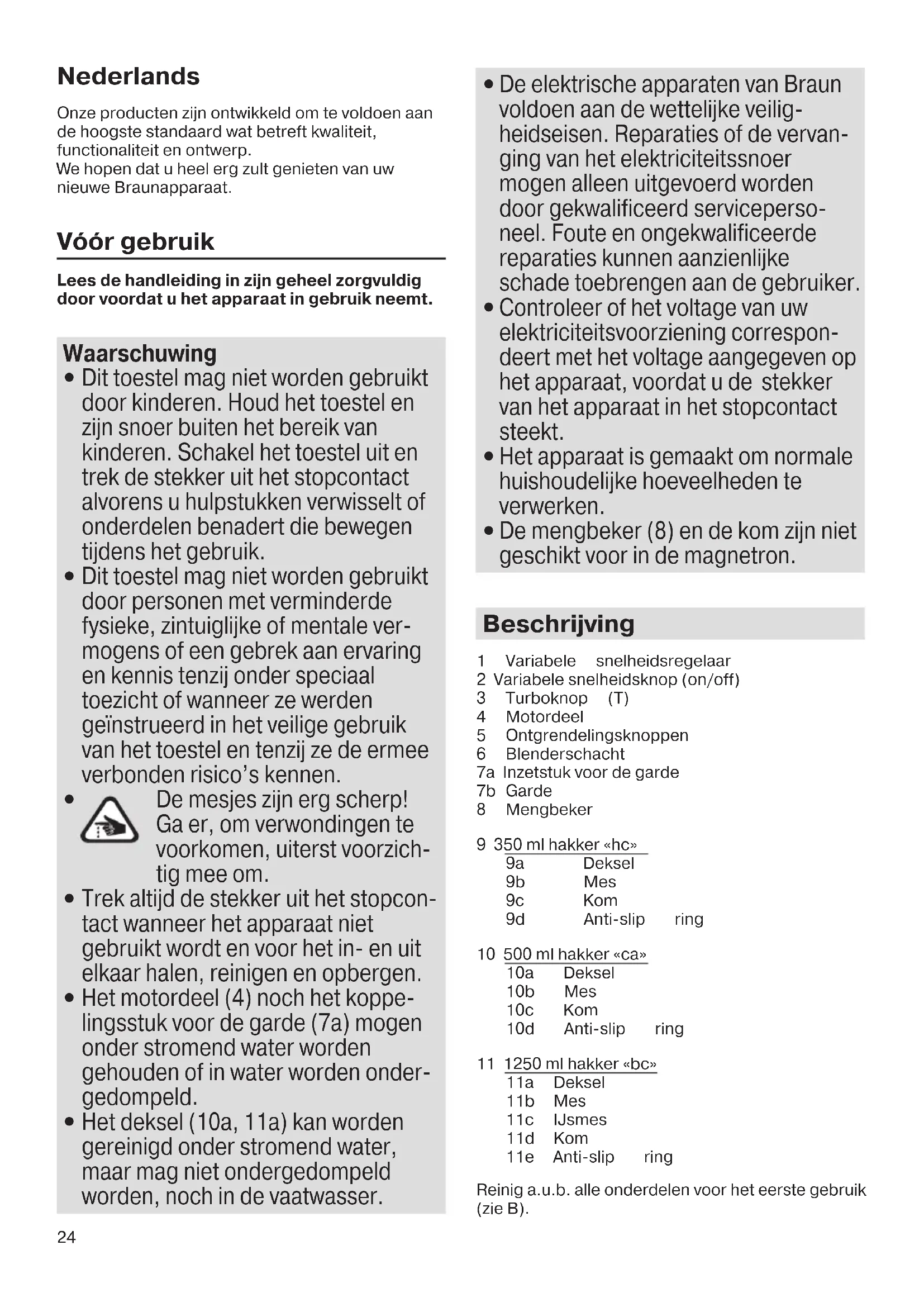 De elektrische apparaten van Braun voldoen aan de wettelijke veilig- heidseisen. Reparaties of de vervan- ging van het elektriciteitssnoer mogen alleen uitgevoerd worden door gekwalificeerd serviceperso- neel. Foute en ongekwalificeerde reparaties kunnen aanzienlijke schade toebrengen aan de gebruiker.