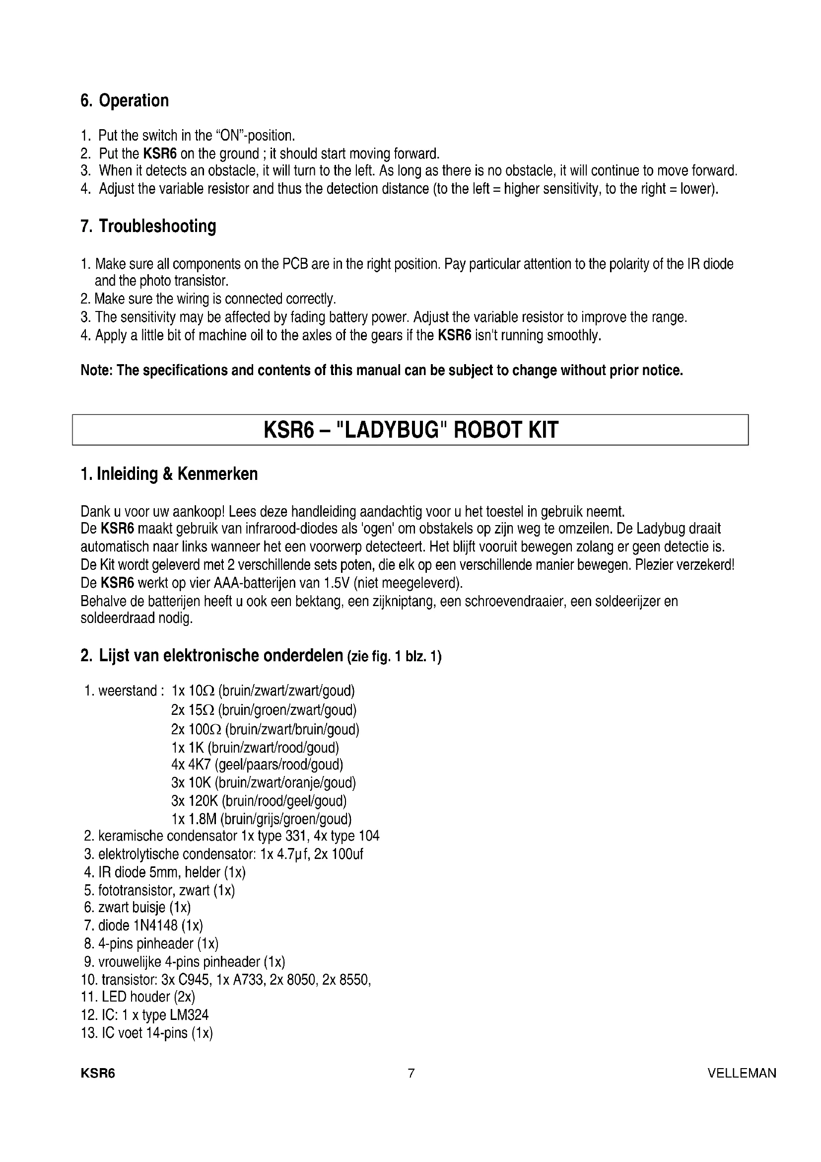 Dank u voor uw aankoop! Lees deze handleiding aandachtig voor u het toestel in gebruik neemt. De KSR6 maakt gebruik van infrarood-diodes als 'ogen' om obstakels op zijn weg te omzeilen. De Ladybug draait automatisch naar links wanneer het een voorwerp detecteert. Het blijft vooruit bewegen zolang er geen detectie is. De Kit wordt geleverd met 2 verschillende sets poten, die elk op een verschillende manier bewegen. Plezier verzekerd! De KSR6 werkt op vier AAA-batterijen van 1.5V (niet meegeleverd). Behalve de batterijen heeft u ook een bektang, een zijkniptang, een schroevendraaier, een soldeerijzer en soldeerdraad nodig.