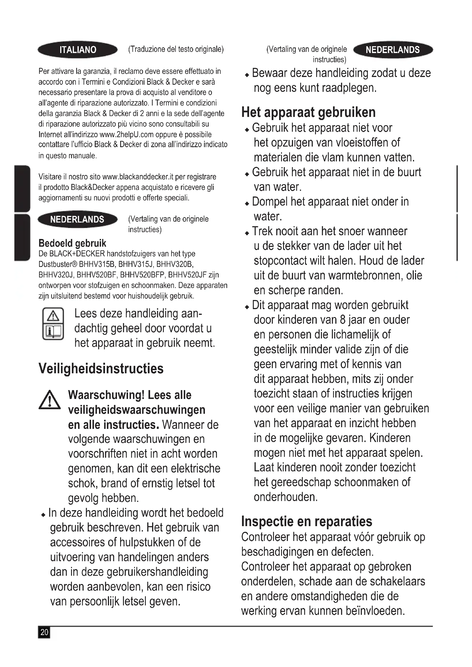 Voor een garantie-aanssprak要去 uw aanssprak in overeenstemming zich met de Voorwaarden en Condities van Black & Decker en要去 u een bewijs van aankoop overlegeen aan de verkoper of aan een geauthoriseerde reparatiemonteur. Voorwaarden en condities van de 2-jarige garantie van Black & Decker en het adres van de vestiging van het geauthoriseerde reparatiecentrum bij u in de buurt, kunt u vinden op internet op www.2helpU.com, of door contact op te nemen met het Black & Decker-kantoor terplaatse, op het adres dat in deze handeiding worden vermeld.