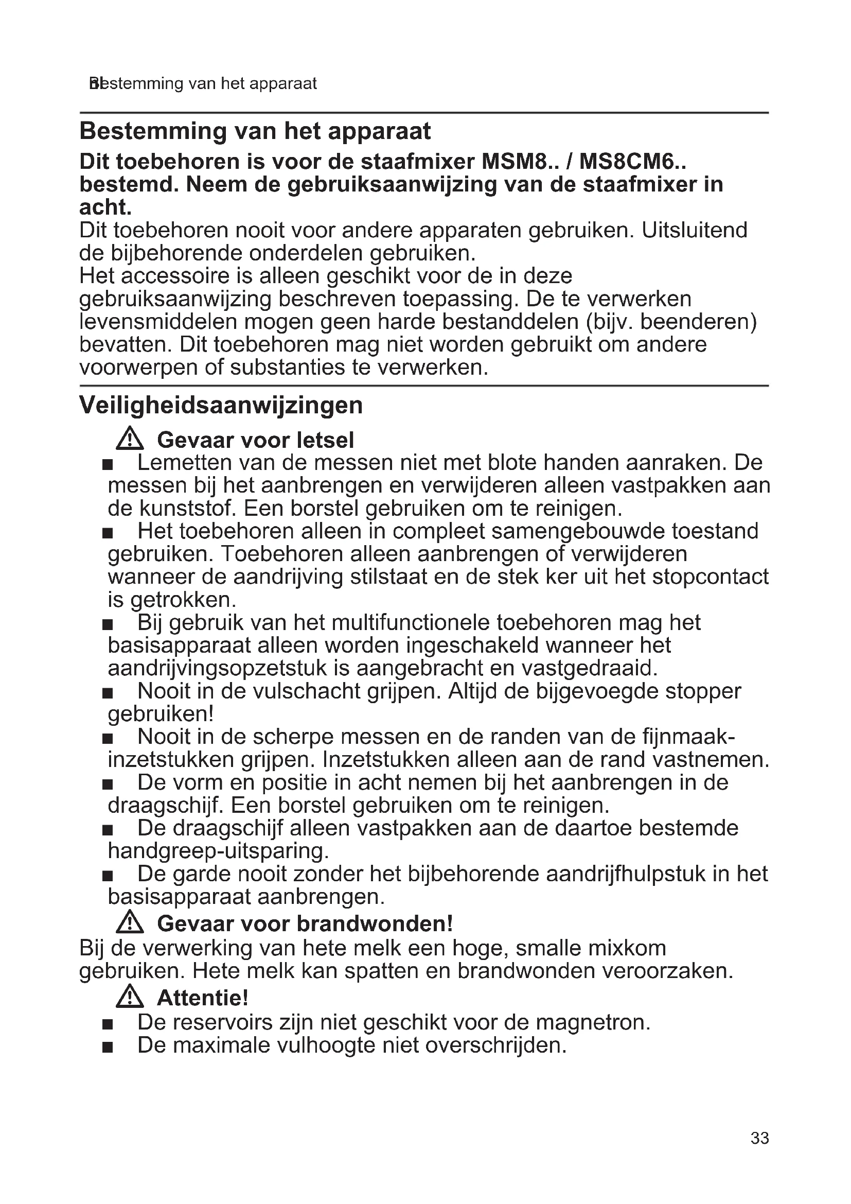 Bestemming van het apparaat Bestemming van het apparaat Dit toebehoren is voor de staafmixer MSM8.. / MS8CM6.. bestemd. Neem de gebruiksaanwijzing van de staafmixer in acht. Dit toebehoren nooit voor andere apparaten gebruiken. Uitsluitend de bijbehorende onderdelen gebruiken. Het accessoire is alleen geschikt voor de in deze gebruiksaanwijzing beschreven toepassing. De te verwerken levensmiddelen mogen geen harde bestanddelen (bijv. beenderen) bevatten. Dit toebehoren mag niet worden gebruikt om andere voorwerpen of substanties te verwerken. Veiligheidsaanwijzingen W Gevaar voor letsel ■ Lemetten van de messen niet met blote handen aanraken. De messen bij het aanbrengen en verwijderen alleen vastpakken aan de kunststof. Een borstel gebruiken om te reinigen. ■ Het toebehoren alleen in compleet samengebouwde toestand gebruiken. Toebehoren alleen aanbrengen of verwijderen wanneer de aandrijving stilstaat en de stek ker uit het stopcontact is getrokken. ■ Bij gebruik van het multifunctionele toebehoren mag het basisapparaat alleen worden ingeschakeld wanneer het aandrijvingsopzetstuk is aangebracht en vastgedraaid. ■ Nooit in de vulschacht grijpen. Altijd de bijgevoegde stopper gebruiken! ■ Nooit in de scherpe messen en de randen van de fijnmaak- inzetstukken grijpen. Inzetstukken alleen aan de rand vastnemen. ■ De vorm en positie in acht nemen bij het aanbrengen in de draagschijf. Een borstel gebruiken om te reinigen. ■ De draagschijf alleen vastpakken aan de daartoe bestemde handgreep-uitsparing. ■ De garde nooit zonder het bijbehorende aandrijfhulpstuk in het basisapparaat aanbrengen. W Gevaar voor brandwonden! Bij de verwerking van hete melk een hoge, smalle mixkom gebruiken. Hete melk kan spatten en brandwonden veroorzaken. W Attentie! ■ De reservoirs zijn niet geschikt voor de magnetron. ■ De maximale vulhoogte niet overschrijden.34 nl Veiligheidsaanwijzingen ■ Let op dat er zich geen vreemde voorwerpen in de vulschacht of in het reservoir bevinden. Niet met voorwerpen (bijv. messen, lepels) in de vulschacht of in het reservoir komen. ■ Nooit met de staafmixer (mixervoet) in het reservoir werken. ■ Volgende onderdelen nooit in vloeistoffen dompelen of onder stromend water houden en niet in de afwasmachine reinigen: aandrijvingsopzetstuk, aandrijfhulpstuk, deksel met drijfwerk. W Belangrijk! Na elk gebruik of als u het apparaat langere tijd niet hebt gebruikt, dient u de toebehoren altijd grondig te reinigen. X “Reiniging en verzorging” zie pagina 39 Lees deze gebruiksaanwijzing met belangrijke veiligheids- en bedieningsaanwijzingen over het apparaat vóór de ingebruikneming zorgvuldig door. De gebruiksaanwijzing bewaren a.u.b. Ook deze gebruiksaanwijzing overhandigen als u het apparaat aan derden doorgeeft. In één oogopslag X Afb. A 1 Universele fijnsnijder L * a Fles b Universeel mes (L) c IJscrushmes (L) d Aandrijvingsopzetstuk e Deksel 2 Universele fijnsnijder XL * a Fles b Universeel mes (XL) c Aandrijvingsopzetstuk d Deksel 3 Multifunctioneel toebehoren a Fles b Knethaken c Universeel mes d Deksel met aandrijving e Stopper f Draagschijf voor schijfinzetstukken Schijfinzetstukken * g Snij-inzetstuk – grof h Snij-inzetstuk – fijn i Rasp-inzetstuk – gemiddeld j Rasp-inzetstuk - grof 4 Garde * a Aandrijfhulpstuk