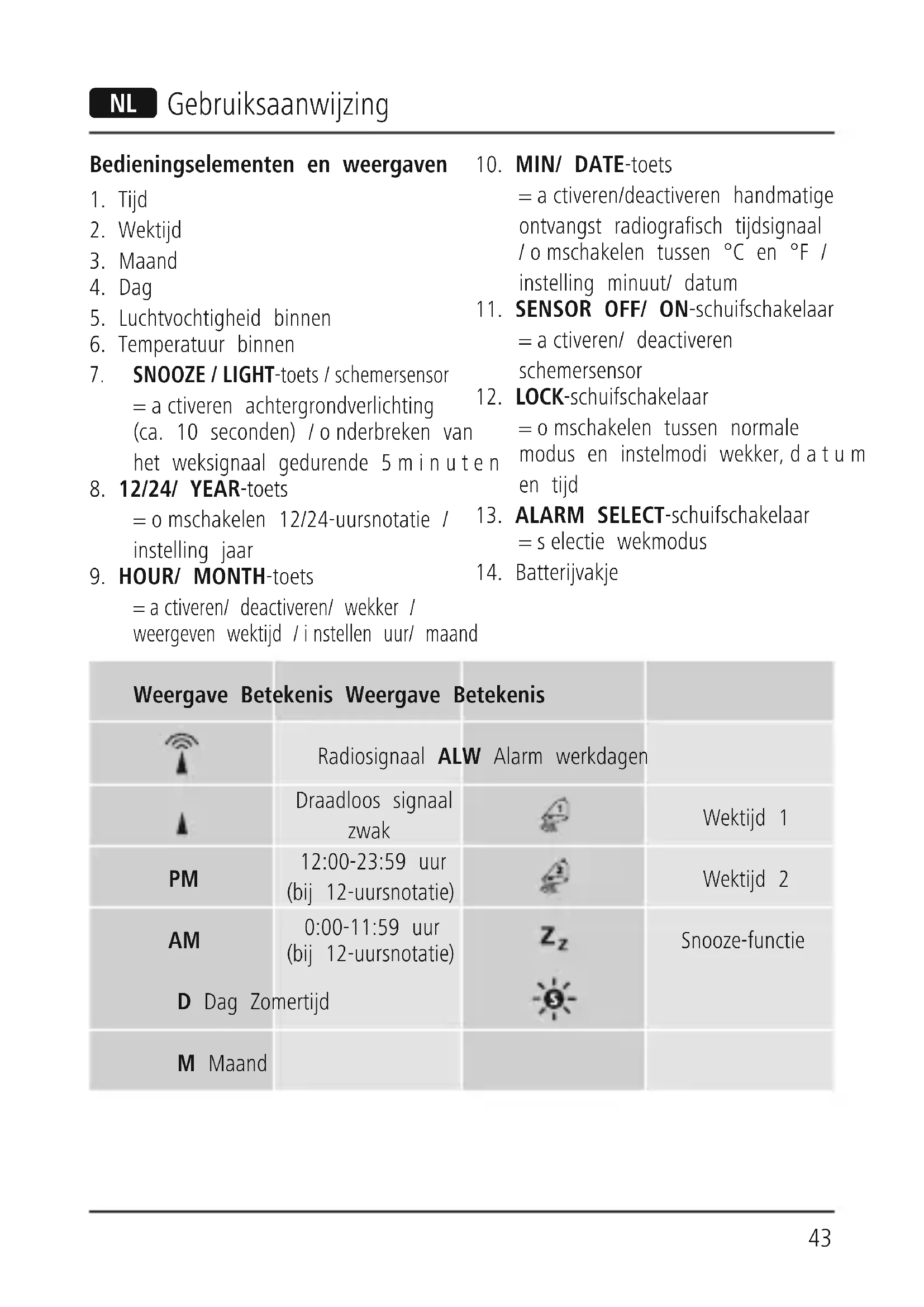0:00-11:59 uur (bij 12-uursnotatie) Snooze-functie D Dag Zomertijd M Maand44