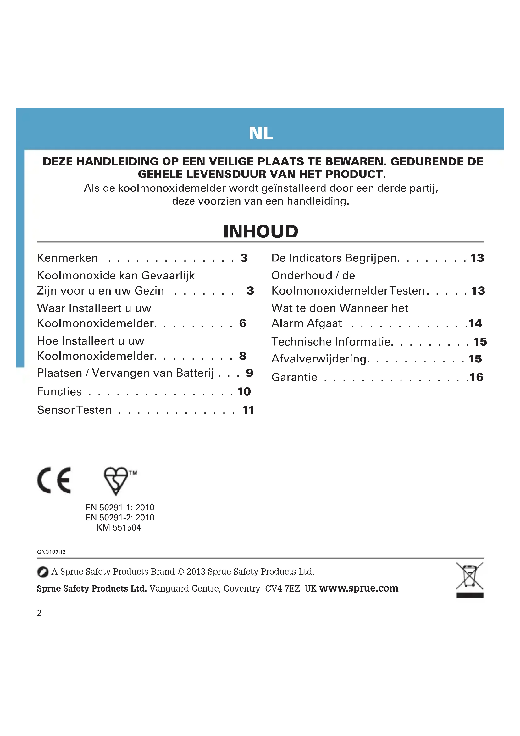 - Gebruik de apparaten niet meer tot ze zijn gecontroleerd door een deskundige. Een technicus die een gasapparaat controleert moet daartoe bevoegd zijn. TECHNISCHE INFORMATIE Specificaties van de koolmonoxidemelder: CO-AE-9B-BNL Type sensor: Elektrochemisch Levensduur van sensor: 7 jaar Geluidsniveau van het alarm: 85 dB op 1 meter afstand Aanbevolen batterijen: Formaat AA Alkaline - Duracell LR6, Energizer LR6, Gold Peak 15A Levensduur batterij: Langer dan 1 jaar bij normale gebruik- somstandigheden, te vervangen Temperatuurbereik: -10 ºC tot 40 ºC16 Als u het deactiveringsclipje niet meer hebt, kan de clip worden nagemaakt door een dunne, metalen papierclip in een U-vorm te buigen. WAARSCHUWING: Niet proberen te openen - niet verbranden. GARANTIE Sprue Safety Products Ltd garandeert de oorspronkelijke koper dat, bij normaal huishoudelijk gebruik en onderhoud, de bijgevoegde koolmonoxidedectector vrij zal zijn van defecten in materiaal en werkmanschap gedurende een periode van 7 (zeven) jaar vanaf de datum van aankoop. Op voorwaarde dat het product samen met het aankoopbewijs wordt terugbezorgd aan de winkelier, verklaart Sprue Safety Products Ltd zich akkoord om tijdens de periode van 7 (zeven) jaar vanaf de datum van aankoop het product gratis te vervangen. De garantie van de CO-AE-9B-BNL koolmonoxidemelder zal blijven gelden gedurende de resterende periode van de garantie van de oorspronkelijk gekochte koolmonoxidemelder - m.a.w. vanaf de datum van de oorspronkelijke aankoop en niet vanaf de datum van ontvangst van het vervangingsproduct. Sprue Safety Products Ltd behoudt zich het recht voor om een alternatief product aan te bieden dat gelijkaardig is aan het te vervangen product, indien het oorspronkelijke model niet meer beschikbaar of op voorraad is. Deze garantie geldt voor de originele koper vanaf de datum van de originele winkelaankoop en kan niet worden overgedragen. Een bewijs van aankoop is vereist. Deze garantie dekt geen schade die is veroorzaakt door een ongeluk, verkeerd gebruik, demontage, misbruik of onvoldoende redelijke zorg voor het product, of door toepassingen die niet overeenstemmen met de handleiding. De garantie dekt geen gebeurtenissen en toestanden die buiten de controle van Sprue Safety Products Ltd vallen, zoals natuurrampen (brand, noodweer, etc.). De garantie geldt niet voor winkels, onderhoudscentra, verdelers of agenten. Sprue Safety Products Ltd erkent geen wijzigingen aan deze garantie door derde partijen. Sprue Safety Products Ltd kan niet aansprakelijk worden gehouden voor bijkomende of gevolgschade veroorzaakt door een inbreuk op de expliciete of impliciete garantie. Uitgezonderd de wettelijk verboden mate, is elke impliciete garantie op verkoopbaarheid of geschiktheid voor een bepaald doel beperkt tot een periode van 7 (zeven) jaar. Deze garantie is niet van invloed op uw wettelijke rechten. Uitgezonderd voor dood of verwondingen, kan Sprue Safety Products Ltd niet aansprakelijk worden gehouden voor gebruiksverlies, schade, kosten of uitgaven met betrekking tot dit product of voor indirecte of gevolgverlies, - schade of -kosten opgelopen door u of door andere gebruikers van dit product. Voor het vervangen van het product onder garantie dient u dit terug te brengen naar uw leverancier/winkelier.17 Caractéristiques . . . . . . . . . . . .18 Le Monoxyde de Carbone et ses Effets sur vous et votre Famille . . .18 Où Installer votre Détecteur . . . . .21 Comment Installer votre Détecteur .23 Installation et Remplacement des Piles . . . . . . . . . . . . . . . .24 Caractéristiques de Fonctionnement et Test . . . . . . . .25 Test du Capteur . . . . . . . . . . . .25 Comprendre les Indications du Produit . . . . . . . . . . . . . . .27 L’Entretien de votre Détecteur . . . .28 Que Faire quand l’Alarme se Déclenche . . . . . . . . . . . . .29 Information Technique . . . . . . . .29 Mise au Rebut . . . . . . . . . . . . .30 Garantie de 7 Ans . . . . . . . . . . .30 CONSERVEZ CE MODE D’EMPLOI EN LIEU SÛR. PENDANT TOUTE LA DURÉE DE VIE DU PRODUIT. Si le détecteur-avertisseur de monoxyde de carbone que vous installez doit être utilisé par un tiers, remettez ce mode d’emploi, ou sa copie, à l’utilisateur final.