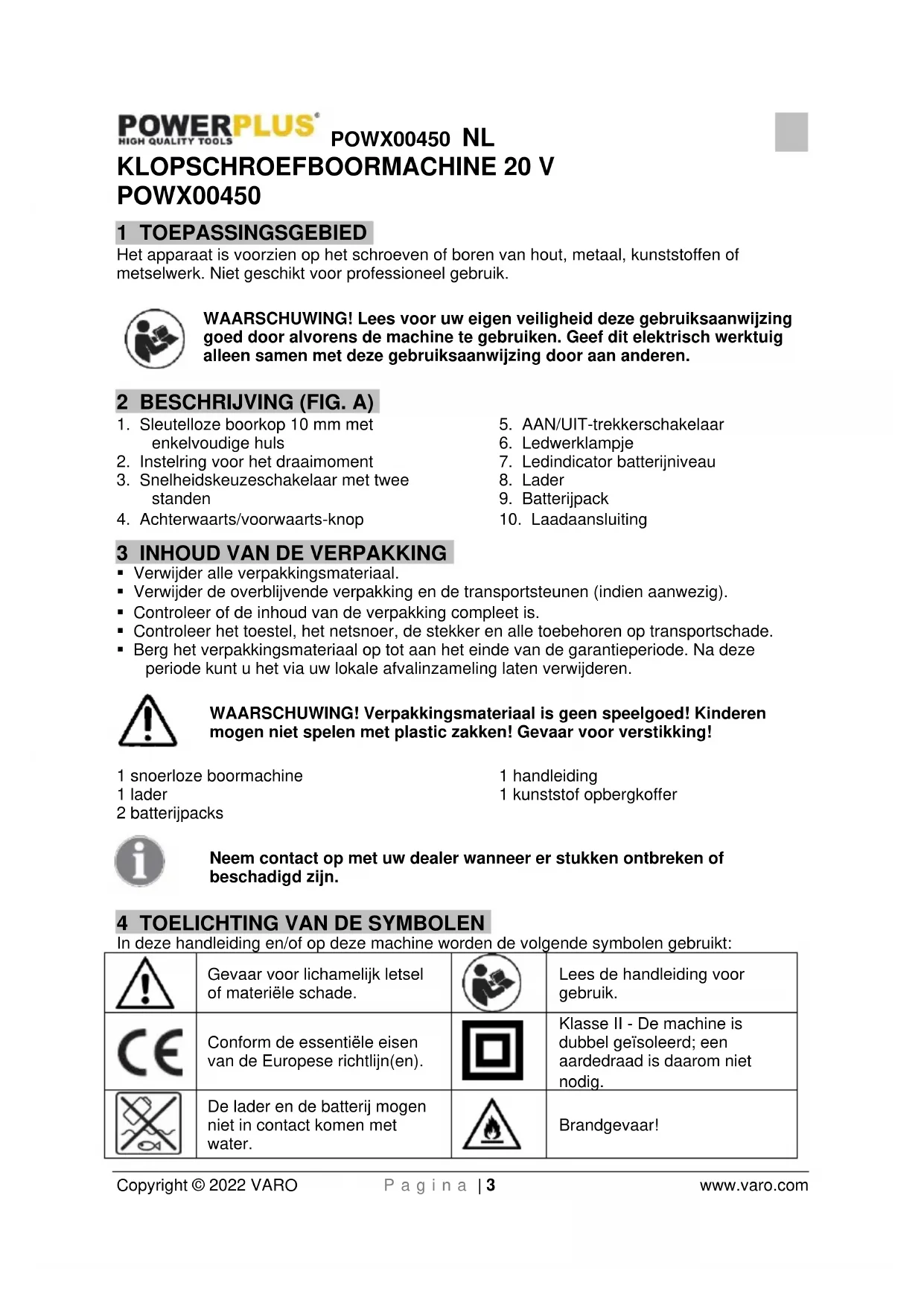 Dit product bevat Lithiumionen. Recycleer of verwijder de batterij op passende wijze om het milieu te sparen. Lokale, regionale of nationale wetgeving kan het wegwerpen van Lithium-ion batterijen bij het gewone huisvuil verbieden. Neem contact op met uw lokale afvalverwerker voor informatie m.b.t. recyclage- en verwijderingsmogelijkheden. 16 CONFORMITEITSVERKLARING VARO N.V. -– Vic. Van Rompuy N.V. Joseph Van Instraat 9 - BE2500 Lier - BELGIUM, verklaart dat, Product: Klopschroefboormachine Handelsmerk: POWERplus Model: POWX00450 voldoet aan de essentiële eisen en aan de overige relevante bepalingen van de van toepassing zijnde Europese Richtlijnen, gebaseerd op de toepassing van Europese geharmoniseerde normen. Elke niet-toegelaten modificatie van het apparaat maakt deze verklaring nietig. Europese Richtlijnen (inclusief, indien van toepassing, hun wijzigingen tot op de datum van ondertekening): 2011/65/EU 2006/42/EC 2014/30/EU Europese geharmoniseerde normen (inclusief, indien van toepassing, hun wijzigingen tot op de datum van ondertekening): EN62841-1 : 2015 EN62841-2-1 : 2018 EN55014-1 : 2017 EN55014-2 : 2015 Beheerder van de technische documentatie: Philippe Vankerkhove, VARO – Vic. Van Rompuy N.V. Ondergetekende handelt in opdracht van de bedrijfsleider, Ludo Mertens Regelgevings- en compliancemanager 18/01/2022, Lier - BelgiumPOWX00450 FR Copyright © 2022 VARO P a g e | 1 www.varo.com 1 UTILISATION .................................................................................. 3