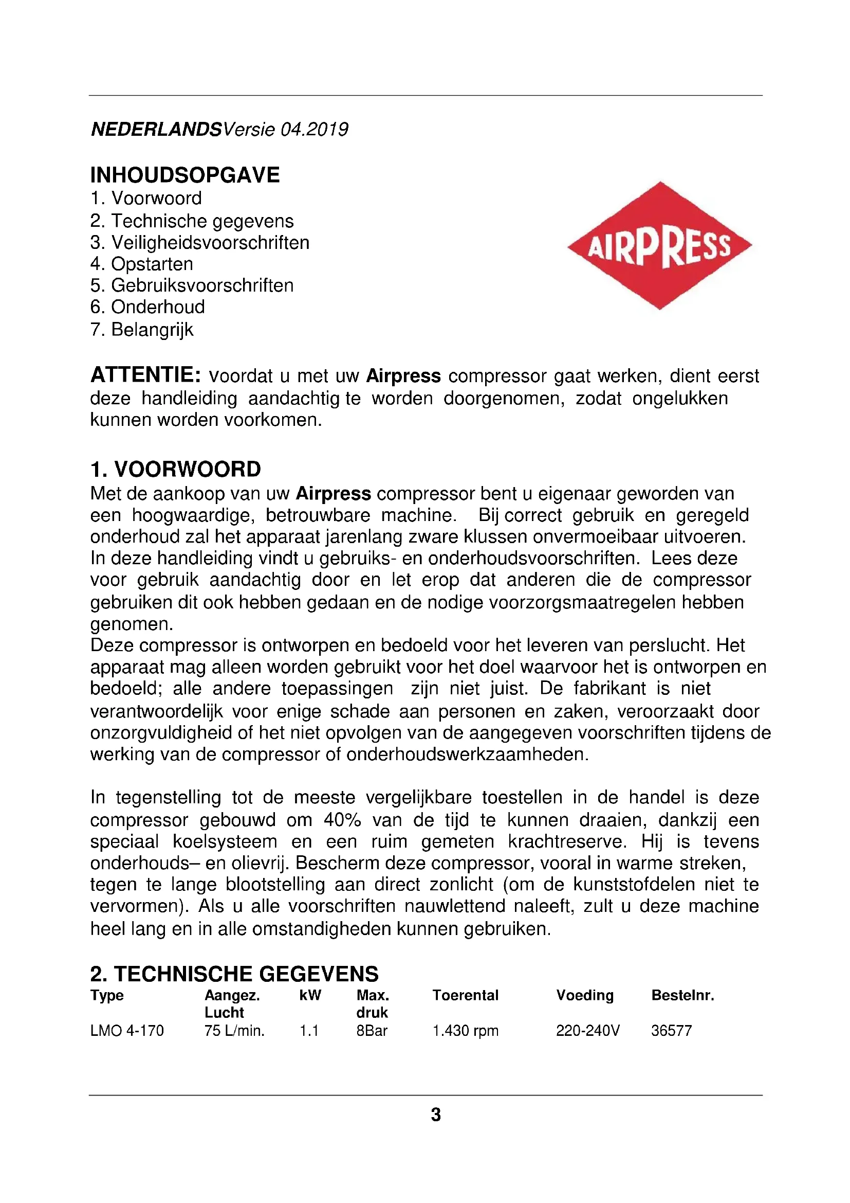 Met de aankoop van uw Airpress compressor bent u eigenaar geworden van een hoogwaardige, betrouwbare machine. Bij correct gebruik en geregeld onderhoud zal het apparaat jarenlang zware klussen onvermoeibaar uitvoeren. In deze handleiding vindt u gebruiks- en onderhoudsvoorschriften. Lees deze voor gebruik aandachtig door en let erop dat anderen die de compressor gebruiken dit ook hebben gedaan en de nodige voorzorgsmaatregelen hebben genomen. Deze compressor is ontworpen en bedoeld voor het leveren van perslucht. Het apparaat mag alleen worden gebruikt voor het doel waarvoor het is ontworpen en bedoeld; alle andere toepassingen zijn niet juist. De fabrikant is niet verantwoordelijk voor enige schade aan personen en zaken, veroorzaakt door onzorgvuldigheid of het niet opvolgen van de aangegeven voorschriften tijdens de werking van de compressor of onderhoudswerkzaamheden. In tegenstelling tot de meeste vergelijkbare toestellen in de handel is deze compressor gebouwd om 40% van de tijd te kunnen draaien, dankzij een speciaal koelsysteem en een ruim gemeten krachtreserve. Hij is tevens onderhouds– en olievrij. Bescherm deze compressor, vooral in warme streken, tegen te lange blootstelling aan direct zonlicht (om de kunststofdelen niet te vervormen). Als u alle voorschriften nauwlettend naleeft, zult u deze machine heel lang en in alle omstandigheden kunnen gebruiken.