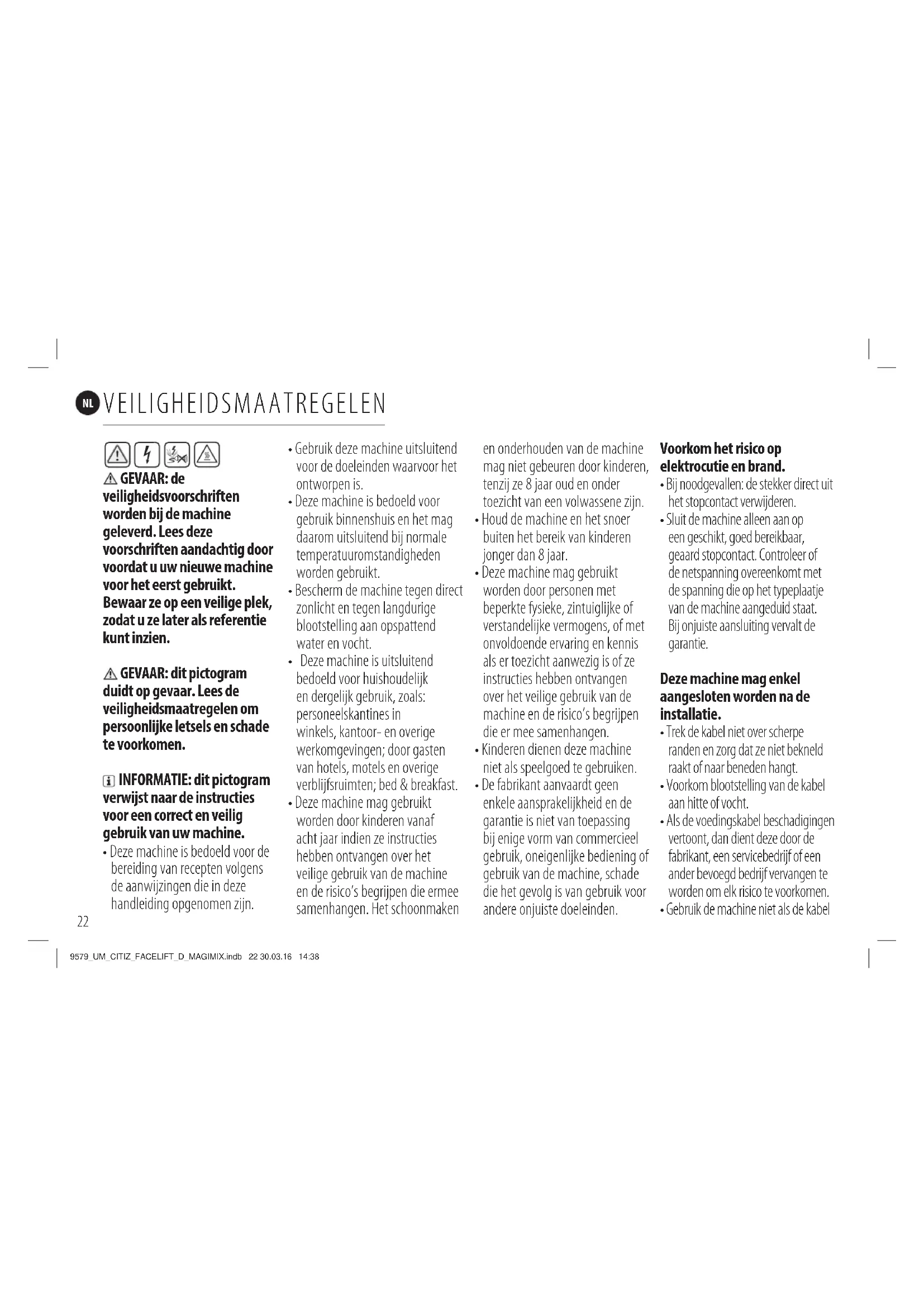 CITIZ */)06%401("7& 9579_UM_CITIZ_FACELIFT_D_MAGIMIX.indb 21 30.03.16 14:38GEVAAR: de veiligheidsvoorschriften worden bij de machine geleverd. Lees deze voorschriften aandachtig door voordat u uw nieuwe machine voor het eerst gebruikt. Bewaar ze op een veilige plek, zodat u ze later als referentie kunt inzien. GEVAAR: dit pictogram duidt op gevaar. Lees de veiligheidsmaatregelen om persoonlijke letsels en schade te voorkomen. INFORMATIE: dit pictogram verwijst naar de instructies voor een correct en veilig gebruik van uw machine. r%F[FNBDIJOFJTCFEPFMEWPPSEF bereiding van recepten volgens de aanwijzingen die in deze handleiding opgenomen zijn. rGebruik deze machine uitsluitend voor de doeleinden waarvoor het ontworpen is. r%F[FNBDIJOFJTCFEPFMEWPPS gebruik binnenshuis en het mag daarom uitsluitend bij normale temperatuuromstandigheden worden gebruikt. rBescherm de machine tegen direct zonlicht en tegen langdurige blootstelling aan opspattend water en vocht. r%F[FNBDIJOFJTVJUTMVJUFOE bedoeld voor huishoudelijk en dergelijk gebruik, zoals: personeelskantines in winkels, kantoor- en overige werkomgevingen; door gasten van hotels, motels en overige WFSCMJKGTSVJNUFOCFECSFBLGBTU r%F[FNBDIJOFNBHHFCSVJLU worden door kinderen vanaf acht jaar indien ze instructies hebben ontvangen over het veilige gebruik van de machine en de risico’s begrijpen die ermee TBNFOIBOHFO)FUTDIPPONBLFO en onderhouden van de machine mag niet gebeuren door kinderen, tenzij ze 8 jaar oud en onder toezicht van een volwassene zijn. r)PVEEFNBDIJOFFOIFUTOPFS buiten het bereik van kinderen jonger dan 8 jaar. r%F[FNBDIJOFNBHHFCSVJLU worden door personen met beperkte fysieke, zintuiglijke of verstandelijke vermogens, of met onvoldoende ervaring en kennis als er toezicht aanwezig is of ze instructies hebben ontvangen over het veilige gebruik van de machine en de risico’s begrijpen die er mee samenhangen. r,JOEFSFOEJFOFOEF[FNBDIJOF niet als speelgoed te gebruiken. r%FGBCSJLBOUBBOWBBSEUHFFO enkele aansprakelijkheid en de garantie is niet van toepassing bij enige vorm van commercieel gebruik, oneigenlijke bediening of gebruik van de machine, schade die het gevolg is van gebruik voor andere onjuiste doeleinden. Voorkom het risico op elektrocutie en brand. rBij noodgevallen: de stekker direct uit het stopcontact verwijderen. rSluit de machine alleen aan op een geschikt, goed bereikbaar, geaard stopcontact. Controleer of de netspanning overeenkomt met de spanning die op het typeplaatje van de machine aangeduid staat. Bij onjuiste aansluiting vervalt de garantie. Deze machine mag enkel aangesloten worden na de installatie. rTrek de kabel niet over scherpe randen en zorg dat ze niet bekneld raakt of naar beneden hangt. rVoorkom blootstelling van de kabel aan hitte of vocht. rAls de voedingskabel beschadigingen vertoont, dan dient deze door de fabrikant, een servicebedrijf of een ander bevoegd bedrijf vervangen te worden om elk risico te voorkomen. rGebruik de machine niet als de kabel