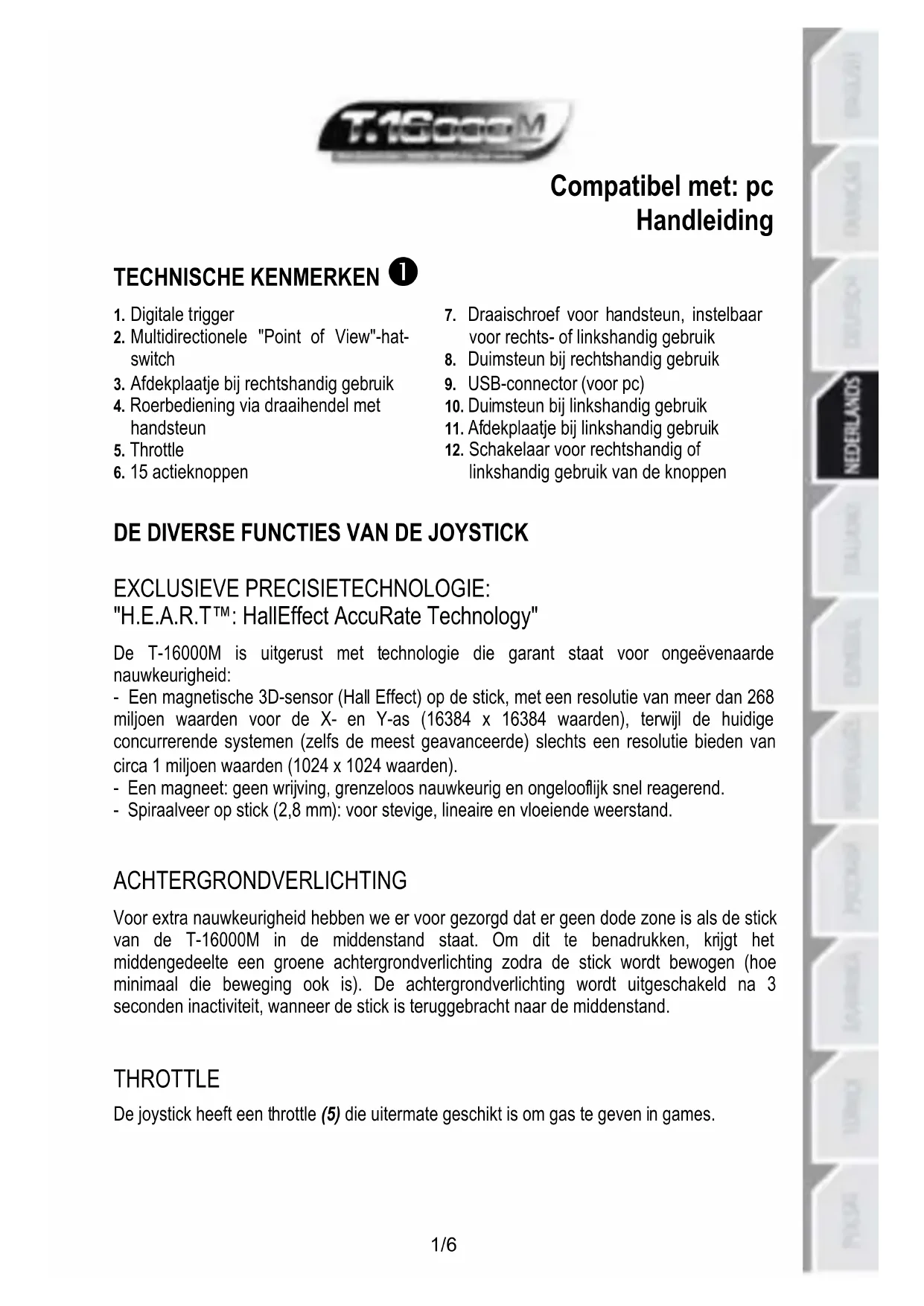 - De achtergrondverlichting in het midden van de joystick gaat niet automatisch uit: - Beweeg de stick een heel klein beetje zodat deze precies in het midden staat. De achtergrondverlichting wordt dan uitgeschakeld na 3 seconden inactiviteit.5/6 Informatie met betrekking tot kopersgarantie Wereldwijd garandeert Guillemot Corporation S.A. (“Guillemot”) de koper dat dit Thrustmaster-product vrij zal zijn van materiaal- en fabricagefouten gedurende een garantieperiode gelijk aan de tijd maximaal vereist om een restitutie/vervanging voor dit product te claimen. In landen van de Europese Unie komt dit overeen met een periode van twee (2) jaar vanaf het moment van levering van het Thrustmaster-product. In andere landen komt de garantieperiode overeen met de tijd maximaal vereist om een restitutie/vervanging voor dit Thrustmaster-product te claimen zoals wettelijk is vastgelegd in het land waarin de koper woonachtig was op de datum van aankoop van het Thrustmaster-product. Indien een dergelijk claimrecht niet wettelijk is vastgelegd in het betreffende land, geldt een garantieperiode van één (1) jaar vanaf datum aankoop van het Thrustmaster-product. Ongacht het hierboven gestelde, geldt voor oplaadbare batterijen een garantieperiode van zes (6) maanden vanaf datum aankoop. Indien u in de garantieperiode een defect meent te constateren aan dit product, neem dan onmiddellijk contact op met Technical Support die u zal informeren over de te volgen procedure. Als het defect wordt bevestigd, dient het product te worden geretourneerd naar de plaats van aankoop (of een andere locatie die wordt opgegeven door Technical Support). Binnen het gestelde van deze garantie wordt het defecte product van de koper gerepareerd of vervangen, zulks ter beoordeling van Technical Support. Indien toegestaan door van toepassing zijnde wetgeving, beperkt de volledige aansprakelijkheid van Guillemot en haar dochterondernemingen (inclusief de aansprakelijkheid voor vervolgschade) zich tot het repareren of vervangen van het Thrustmaster-product. Indien toegestaan door van toepassing zijnde wetgeving, wijst Guillemot elke garantie af met betrekking tot verhandelbaarheid of geschiktheid voor enig doel. De wettelijke rechten van de koper die van toepassing zijn op de verkoop van consumentproducten worden op generlei wijze door deze garantie beperkt. Deze garantie is niet van kracht: (1) indien het product aangepast, geopend of gewijzigd is, of beschadigd is ten gevolge van oneigenlijk of onvoorzichtig gebruik, verwaarlozing, een ongeluk, normale slijtage, of enige andere oorzaak die niet gerelateerd is aan een materiaal- of fabricagefout (inclusief maar niet beperkt tot het combineren van het Thrustmaster-product met enig ongeschikt element waaronder in het bijzonder voedingsadapters, oplaadbare batterijen, opladers of enig ander element niet geleverd door Guillemot voor dit product); (2) indien u zich niet houdt aan de instructies zoals verstrekt door Technical Support; (3) op software die onder een specifieke garantie valt; (4) op verbruiksartikelen (elementen die tijdens de levensduur van het product worden vervangen zoals bijvoorbeeld batterijen of pads van een headset of koptelefoon); (5) op accessoires (zoals bijvoorbeeld kabels, behuizingen, hoesjes, etui's, draagtassen of polsbandjes); (6) indien het product werd verkocht op een openbare veiling. Deze garantie is niet overdraagbaar. Aansprakelijkheid Indien toegestaan door van toepassing zijnde wetgeving, wijzen Guillemot Corporation S.A. (hierna te noemen “Guillemot”) en haar dochterondernemingen alle aansprakelijkheid af voor enige schade veroorzaakt door één van de volgende oorzaken: (1) indien het product aangepast, geopend of gewijzigd is; (2) de montage-instructies niet zijn opgevolgd; (3) oneigenlijk of onvoorzichtig gebruik, verwaarlozing, een ongeluk (bijvoorbeeld stoten); (4) normale slijtage. Indien toegestaan onder van toepassing zijnde wetgeving, wijzen Guillemot en haar dochterondernemingen alle aansprakelijkheid af voor enige schade aan dit product niet gerelateerd aan een materiaal- of fabricagefout (inclusief maar niet beperkt tot enige schade direct of indirect veroorzaakt door enige software, of door het combineren van het Thrustmaster- product met enig ongeschikt element waaronder in het bijzonder voedingsadapters, oplaadbare batterijen, opladers of enig ander element niet geleverd door Guillemot voor dit product).6/6 COPYRIGHT © 2015 Guillemot Corporation S.A. Alle rechten voorbehouden. Thrustmaster® is een geregistreerd handelsmerk van Guillemot Corporation S.A. Windows® is een geregistreerd handelsmerk van Microsoft Corporation in de Verenigde Staten en/of andere landen. Alle andere handelsmerken zijn eigendom van de respectieve eigenaren. Afbeeldingen zijn niet bindend. Inhoud, ontwerp en specificaties kunnen zonder kennisgeving vooraf worden gewijzigd en kunnen per land verschillen. Geproduceerd in China. AANBEVELINGEN VOOR DE BESCHERMING VAN HET MILIEU Gooi dit product na het einde van de levensduur niet weg met het normale afval, maar breng het naar het door uw gemeente aangewezen inzamelpunt voor elektrische en/of computerapparatuur. Ter herinnering is hiertoe op het product, de gebruikshandleiding of de verpakking een symbool aangebracht. De meeste materialen kunnen worden gerecycled. Door recycling en andere methoden voor verantwoorde verwerking van afgedankte elektrische en elektronische apparaten kunt u een belangrijke bijdrage leveren aan de bescherming van het milieu. Neem contact op met uw gemeente voor informatie over een inzamelpunt bij u in de buurt. Bewaar deze informatie. De kleuren en decoraties kunnen variëren. Dit product voldoet aan alle normen voor kinderen van 14 jaar en ouder. Dit product is niet geschikt voor gebruik door kinderen jonger dan 14 jaar. www.thrustmaster.com TECHNISCHE ONDERSTEUNING http://ts.thrustmaster.com