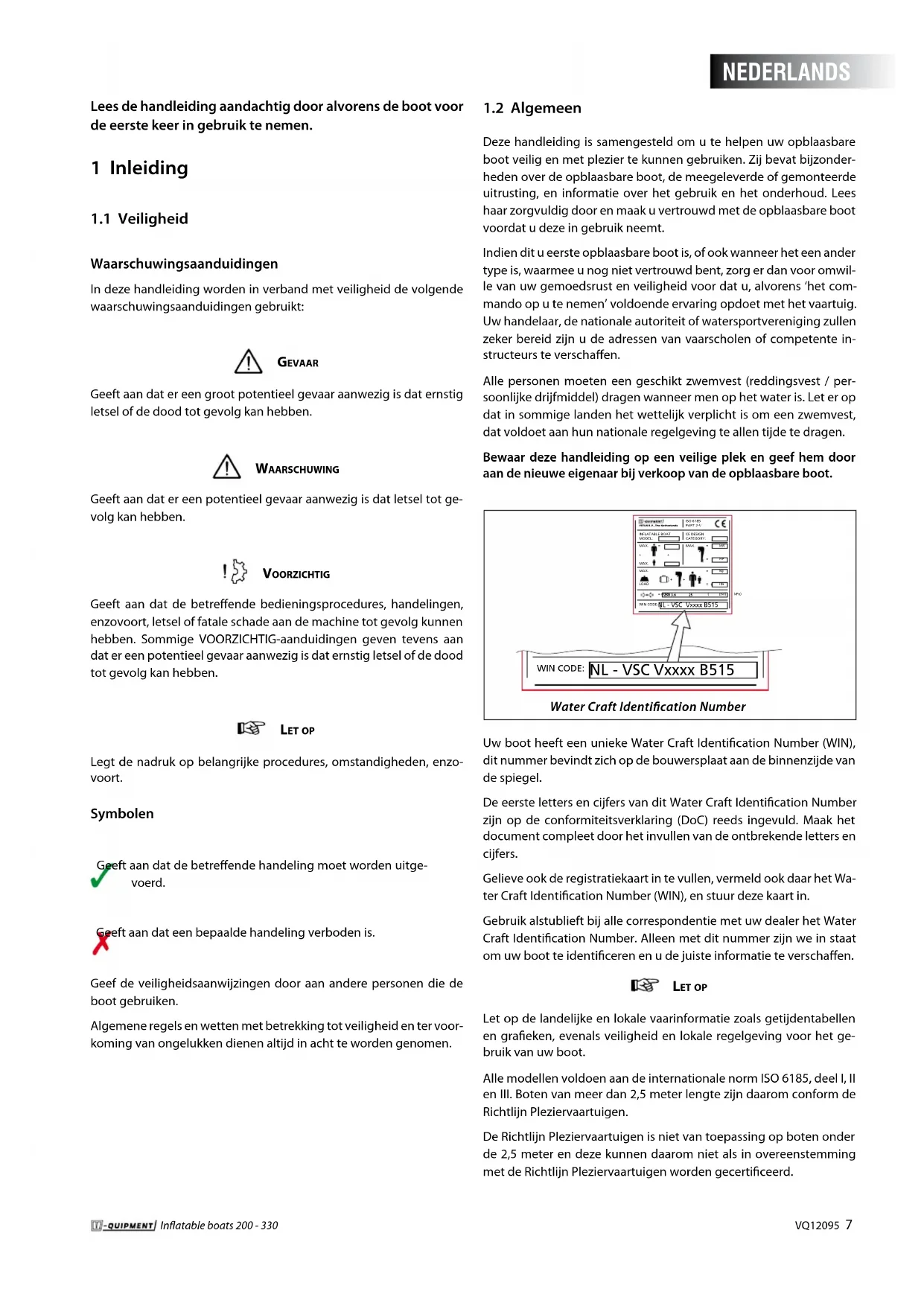 Denities: C. Een vaartuig van ontwerpcategorie C wordt geacht te zijn ontwor-pen voor de vaart bij ten hoogste windkracht 6 en een signicante golfhoogte van maximaal 2 m.D. Een vaartuig van ontwerpcategorie D wordt geacht te zijn ontwor-pen voor de vaart bij ten hoogste windkracht 4 en een signicante golfhoogte van maximaal 0,3 m, waarbij incidenteel golven van maximaal 0,5 m kunnen voorkomen.De vaartuigen van elke ontwerpcategorie moeten zodanig ontwor-pen en gebouwd zijn dat zij bestand zijn tegen de parameters voor stabiliteit, drijfvermogen en andere relevante essentiële eisen opge-somd in deze bijlage, en goed bestuurbaar zijn. Let op Gebruik de boot alleen als de te verwachten windkracht en golf-hoogte minder zijn dan in bovenstaande denities is aangegeven. Zorg er voor dat u en uw bemanning de boot onder controle kunnen houden onder de meest ongunstige omstandighedenVQ12095 9 Inatable boats 200 - 330 Standaard accessoires (niet afgebeeld) - Reparatieset - Draagtas - Voetpomp 3 Gebruik van de boot