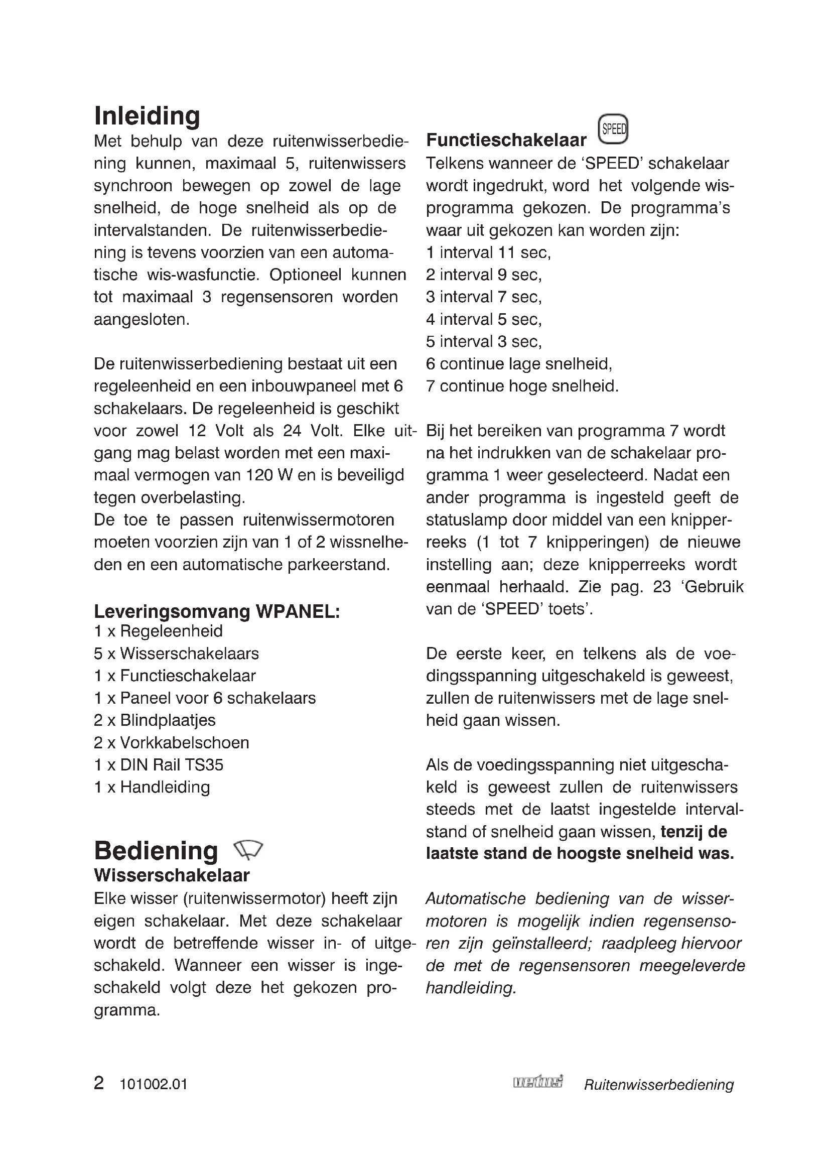 STATUSTSKRWTSKRWTSKRWTSKRWTS NEDERLANDS4 101002.01 Ruitenwisserbediening In de plus draad van de regeleenheid dient een hoofdzekering en een schake- laar te worden opgenomen. Pas eventu- eel een kleinere zekering toe, afgestemd op de totale maximale stroom van de 5 ruitenwissermotoren. Pas aansluitdraden toe met een voldoen- de grote doorsnede. Zie het aansluitsche- ma voor de aanbevolen minimale draad- doorsnede. Sluit de voedingsspanning aan op de meegeleverde kabelschoenen (ø 5 mm). Wissermotoren Pas uitsluitend wissermotoren toe van hetzelfde type; de wissermo- toren moeten voorzien zijn van een automatische parkeerstand. Om van zowel lage als hoge snelheid gebruik te kunnen maken moeten de toegepaste ruitenwissermotoren 2 snel- heden hebben. Bijvoorbeeld Vetus type RWS en HDMC. Het Vetus type ORW is niet geschikt. Sluit de ruitenwissermotoren aan op de regeleenheid zoals in het schema is aan- geven. Pas aansluitdraden toe met een voldoende grote doorsnede. Zie het aan- sluitschema voor de aanbevolen draad- doorsnede op pagina 24.). Schakelaars Sluit de schakelaars aan op de regeleen- heid zoals in het schema is aangeven. Pas aansluitdraden toe met een door- snede zoals is aangeven. Ruitensproeier Voor een ruitensproeier kan op de aan- sluiting ‘WASHER’ een waterpomp of een magneetklep worden aangesloten. De spanning waarvoor de water- pomp of magneetklep geschikt is moet overeenkomen met de boord- spanning (12 Volt of 24 Volt). Regensensoren Raadpleeg de met de regensensoren meegeleverde handleiding hoe deze te installeren. Beveiligingen Elke wissermotor afzonderlijk is beveiligd met een zekering. Ook de sproeierpomp is beveiligd met een zekering. Deze zekeringen bevinden zich onder het deksel van de regeleenheid (zie afbeel- ding hoe het deksel te verwijderen) Zie ‘Technische gegevens’ voor de waar- den van de zekeringen.101002.01 5 Windscreen wiper controller Technische gegevens Voedingsspanning 12 Volt of 24 Volt gelijkspanning Opgenomen stroom *) : ca 10 mA Aantal wissers: maximaal 5 Maximaal vermogen ruitenwissermotor: 120 Watt Interne zekeringen Ruitenwissermotoren : 10 A (5 x ) Ruitensproeierpomp of –klep : 5 A (1 x ) Schakelaars Wisserschakelaar: Functie: ON – OFF (1 x maakcontact) Functieschakelaar: Functie: MOM – OFF – MOM (2 x maakcontact, terugverend naar de middenstand) + lamp *) N.B. Alleen de regeleenheid, exclusief het stroomverbruik van de ruitenwisser- motoren. Introduction Using this windscreen wiper controller, a maximum of 5 wipers can be synchroni- sed at low and high speed as well as in interval settings. The windshield wiper controller is also equipped with an auto- matic wipe/wash function. A maximum of 3 rain sensors can also be optionally connected. The windshield wiper controller consists of a controller unit and a 6-switch panel to be built in. The controller unit is suitable for both 12 and 24 volts. Each output can have a maximum load of 120 W and is protected against overloading. The windshield wiper motors to be used must have 1 or 2 wipe speeds and an automatic park setting. WPANEL is delivered with: 1 x Controller unit 5 x Wiper switches 1 x Function switch 1 x Panel for 6 switches 2 x Blind panels 2 x Cable spade 1 x DIN Rail TS35 1 x Manual Operation Wiper switch Each wiper (windshield wiper motor) has its own switch. The switch is used to turn the relevant wiper on or off. When a wiper is switched on, it follows the selected programme. NEDERLANDS ENGLISH6 101002.01 Windscreen wiper controller SPEED function switch Whenever the SPEED switch is pressed, the next wipe programme is selected. The available programmes are: 1 interval 11 sec, 2 interval 9 sec, 3 interval 7 sec, 4 interval 5 sec, 5 interval 3 sec, 6 continuous low speed, 7 continuous high speed. Once programme 7 is reached, pressing the switch selects programme 1 again. After a different programme is selected, the status lamp indicates the new setting by means of a series of flashes (1 to 7); this series is repeated once. See p. 23 ‘Using the SPEED button’. On first use and each time after the cur- rent is switched off, the windshield wipers will wipe at low speed. If the current has not been switched off, the wipers will wipe at the last interval set- ting or speed selected, unless the last setting was the highest speed. The wiper motors can be operated auto- matically if rain sensors have been instal- led; consult the manual supplied with the rain sensors. Windscreen spray switch Pressing the switch once will run the wipe/wash programme completely auto- matically: - 3 seconds of spraying - at least 3 wipes with simultaneousspray- ing, - 3 final wipes. Pressing the switch and keeping it pressed will maintain wiping with simul- taneous spraying. All wipers will wipe, regardless of the position of the wiper switch. Status light The status light of the function switch indica- tes the wiper controller status: On: wiper controller is active, Off: wiper controller is not active, Fast flashing: current is too low or there is an internal fault, Two series of flashes: selected program- me indicated. This is shown if a different programme is set and after the wiper controller is swit- ched on. Status LED The status LED on the con- troller unit (between the + and – battery terminals) shows the status of the wiper controller: - Green: the wiper controller is active, - Flashing green: the current is too low, - Red: internal fault, - Off: the wiper controller is not active. SPEED SPEED DNG DNG DNGDNG