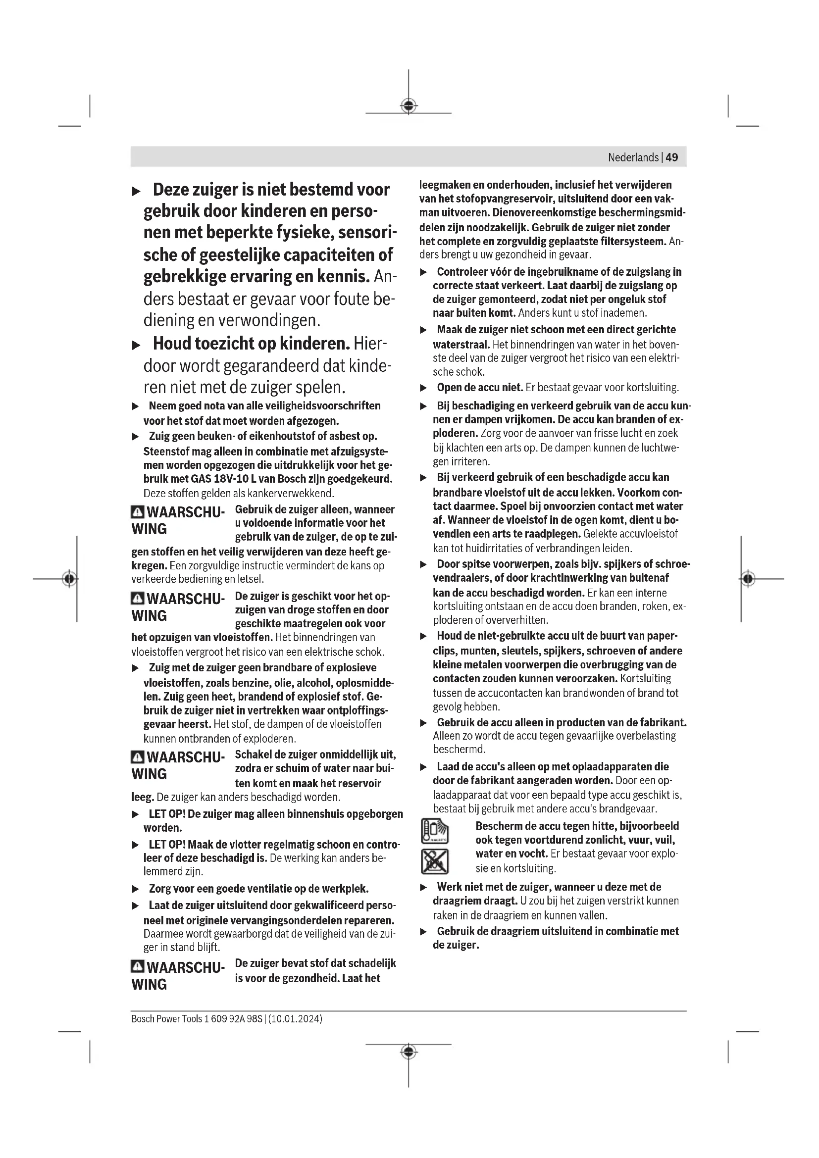 Accu Bosch verkoopt accustofzuigers ook zonder accu. Of bij de levering van uw stofzuiger een accu inbegrepen is, kunt u zien op de verpakking. Accu opladen u Gebruik alleen de in de technische gegevens vermelde oplaadapparaten. Alleen deze oplaadapparaten zijn af- gestemd op de bij uw zuiger gebruikte Li-Ion-accu. Aanwijzing: lithium-ion-accu's worden vanwege internatio- nale transportvoorschriften gedeeltelijk geladen geleverd. Om het volledige vermogen van de accu te waarborgen, laadt u vóór het eerste gebruik de accu volledig op. Accu plaatsen of verwijderen (zieafbeeldingenA1−A2) u Gebruik bij het inzetten van de accu geen geweld. De accu is zo geconstrueerd dat deze alleen in de juiste posi- tie in het product kan worden gestoken. u Houd het accuvak en de accuschacht altijd schoon en droog, om goed en veilig te werken. – Druk op de ontgrendelingstoets (11) om het accuvakdek- sel (12) te openen. – Schuif de accu (20) in de accuschacht (19) tot deze hoorbaar vastklikt. – Voor het verwijderen van de accu (20) drukt u op de ont- grendelingstoets (21) op de accu en trekt u deze uit de accuschacht (19). – Sluit het accuvakdeksel (12). Accuvakdeksel verwisselen (zieafbeeldingenA3−A5) Wanneer u een accu ProCORE18V 12Ah wilt gebruiken, dan kan het accuvakdeksel(12) niet meer worden gesloten. Het accuvakdeksel(12) kan hier worden vervangen door een voor dit geval ontworpen zichtscherm (23). In een vochtige of natte omgeving mag de zuiger alleen met gesloten accuvakdeksel worden gebruikt. Accuvakdeksel demonteren (zie afbeeldingA3) Verwijder de accu(20) uit de accuschacht(19). Verwijder de beide bevestigingsschroeven(22) (ST4×12) met een kruiskopschroevendraaier PH1 en verwijder het accuvakdeksel(12). Zichtscherm bevestigen (zie afbeeldingA4) Duw de houder(24) van het accuvakdeksel omlaag en schuif het zichtscherm(23) erop. Zichtscherm verwijderen (zie afbeeldingA5) Zet er een platte schroevendraaier tegen, schuif het zichtscherm(23) iets naar achter en trek het zichtscherm eraf. Duw daarbij de houder(24) van het accuvakdeksel om- laag. Accu-oplaadaanduiding Bij geplaatste accu kunt u de laadtoestand op de accu- oplaadaanduiding(4) van de zuiger zien, bij weggenomen accu op de accu zelf. Bosch Power Tools 1 609 92A 98S | (10.01.2024)52 | Nederlands Accu-oplaadaanduiding op de zuiger Na het inschakelen van de zuiger lichten de 5 groene LED's van de accu-oplaadaanduiding(4) afzonderlijk op- en aflo- pend op. Vervolgens geven de LED's de laadtoestand van de accu(20) aan. Accu-oplaadaanduiding op de accu Als de accu uit de zuiger wordt genomen, kan de laadtoe- stand door de groene LED's van de oplaadaanduiding op de accu worden aangegeven. Druk op de toets voor de oplaadaanduiding of , om de laadtoestand aan te geven. Als er na het drukken op de toets voor de oplaadaanduiding geen LED brandt, dan is de accu defect en moet vervangen worden. Aanwijzing: Niet elk accutype beschikt over een oplaadaan- duiding. Accutype GBA 18V... LED's Capaciteit Permanent licht 3× groen 60−100% Permanent licht 2× groen 30−60% Permanent licht 1× groen 5−30% Knipperlicht 1× groen 0−5% Accutype ProCORE18V... LED's Capaciteit Permanent licht 5× groen 80−100 % Permanent licht 4× groen 60−80 % Permanent licht 3× groen 40−60 % Permanent licht 2× groen 20−40 % Permanent licht 1× groen 5−20 % Knipperlicht 1× groen 0−5 % Aanwijzingen voor de optimale omgang met de accu Bescherm de accu tegen vocht en water. Bewaar de accu alleen bij een temperatuur tussen –20 °C en 50 °C. Laat de accu bijvoorbeeld in de zomer niet in de auto liggen. Reinig de ventilatieopeningen van de accu af en toe met een zachte, schone en droge doek. Een duidelijk kortere gebruiksduur na het opladen duidt erop dat de accu versleten is en moet worden vervangen. Neem de aanwijzingen met betrekking tot afvalverwijdering in acht. Montage u Verwijder de accu, voordat u de zuiger onderhoudt of reinigt, apparaatinstellingen uitvoert, accessoires verwisselt of de zuiger opbergt. Deze voorzorgsmaatre- gel voorkomt onbedoeld starten van de zuiger. Houders voor zuigaccessoires monteren (zieafbeeldingB) – Schuif de houder (25) voor zuigbuis en spleetzuigmond stevig van bovenaf in de daarvoor bestemde opname (10) tot deze vastklikt. – Schuif de houder (27) voor zuigslang en vloerzuigmond stevig van bovenaf in de daarvoor bestemde opname (7) en draai de vastzetschroef (26) vast. Zuigslang monteren (zie afbeelding C) – Steek de zuigslang (13) in de slangopname (8) tot de bei- de drukknoppen (28) van de afzuigslang vastklikken. Aanwijzing: Bij het zuigen ontstaat door de wrijving van het stof in de zuigslang en -accessoires een elektrostatische op- lading die de gebruiker in de vorm van statische ontlading kan voelen (afhankelijk van invloeden van buitenaf en licha- melijke gesteldheid). Zuigaccessoires monteren De zuigslang (13) is voorzien van een clipsysteem waarmee zuigaccessoires (afzuigadapter (14), gebogen zuigmond (15)) kunnen worden aangesloten. Afzuigadapter of gebogen zuigmond monteren (zieafbeeldingD) Steek de afzuigadapter(14) of de gebogen zuigmond(15) op de zuigslang(13) tot de beide drukknoppen(28) van de zuigslang hoorbaar vastklikken. Voor demonteren drukt u de drukknoppen(28) naar binnen en trekt u de onderdelen uit elkaar. Zuigmonden en buizen monteren – Steek indien nodig de zuigbuizen (18) stevig in elkaar en vervolgens stevig op de gebogen zuigmond (15). – Steek de vloerzuigmond (17) of de spleetzuigmond (16) stevig op de zuigbuis (18) of de gebogen zuigmond (15). Draagriem bevestigen (accessoire) (zieafbeeldingE) u De draagriem is uitsluitend geschikt voor het dragen en vastzetten van de zuiger! Klik de karabijnhaak van de draagriem(29) in de bevestigingsogen(9) van de zuiger. Loopwielen monteren (accessoire) (zieafbeeldingF) Steek de 4 bevestigingspennen van de loopwielen(30) in de loopwielopnamen(31) tot deze hoorbaar vastklikken. Er kunnen ook andere loopwielen conform Norm EN12529 (dia