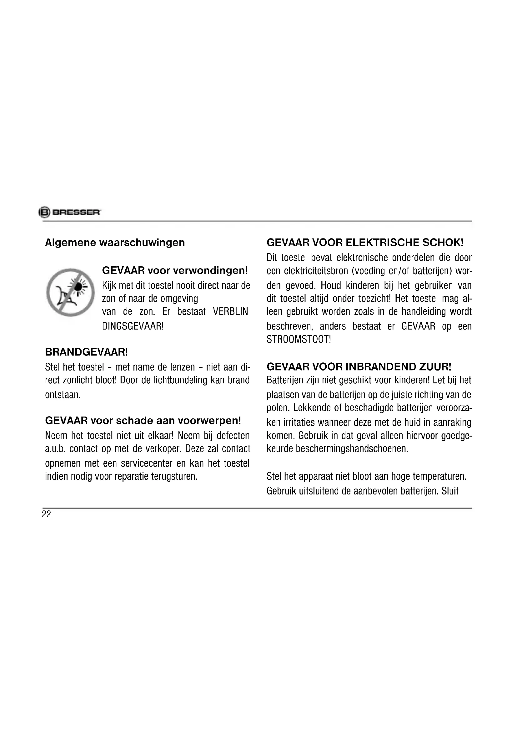 La durée normale de la garantie est de 2 ans à compter du jour de l’achat. Afi n de pouvoir profi ter d’une prolongation facultative de la garantie, comme il est indiqué sur le carton d’emballage, vous devez vous enregistrer sur notre site Internet. Vous pouvez consulter l’intégralité des conditions de garantie ainsi que les informations concernant la prolongation de la garantie et les prestations de service sur www.bresser.de/warranty_terms.22 Algemene waarschuwingen GEVAAR voor verwondingen! Kijk met dit toestel nooit direct naar de zon of naar de omgeving van de zon. Er bestaat VERBLIN- DINGSGEVAAR! BRANDGEVAAR! Stel het toestel – met name de lenzen – niet aan di- rect zonlicht bloot! Door de lichtbundeling kan brand ontstaan. GEVAAR voor schade aan voorwerpen! Neem het toestel niet uit elkaar! Neem bij defecten a.u.b. contact op met de verkoper. Deze zal contact opnemen met een servicecenter en kan het toestel indien nodig voor reparatie terugsturen. GEVAAR VOOR ELEKTRISCHE SCHOK! Dit toestel bevat elektronische onderdelen die door een elektriciteitsbron (voeding en/of batterijen) wor- den gevoed. Houd kinderen bij het gebruiken van dit toestel altijd onder toezicht! Het toestel mag al- leen gebruikt worden zoals in de handleiding wordt beschreven, anders bestaat er GEVAAR op een STROOMSTOOT! GEVAAR VOOR INBRANDEND ZUUR! Batterijen zijn niet geschikt voor kinderen! Let bij het plaatsen van de batterijen op de juiste richting van de polen. Lekkende of beschadigde batterijen veroorza- ken irritaties wanneer deze met de huid in aanraking komen. Gebruik in dat geval alleen hiervoor goedge- keurde beschermingshandschoenen. Stel het apparaat niet bloot aan hoge temperaturen. Gebruik uitsluitend de aanbevolen batterijen. SluitDE