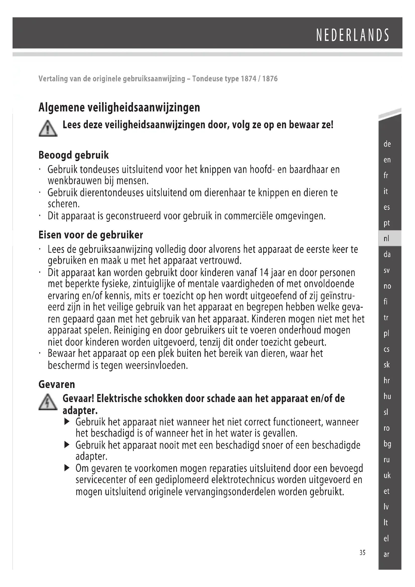 Vertaling van de originele gebruiksaanwijzing – Tondeuse type 1874 / 1876 Algemene veiligheidsaanwijzingen Lees deze veiligheidsaanwijzingen door, volg ze op en bewaar ze! Beoogd gebruik