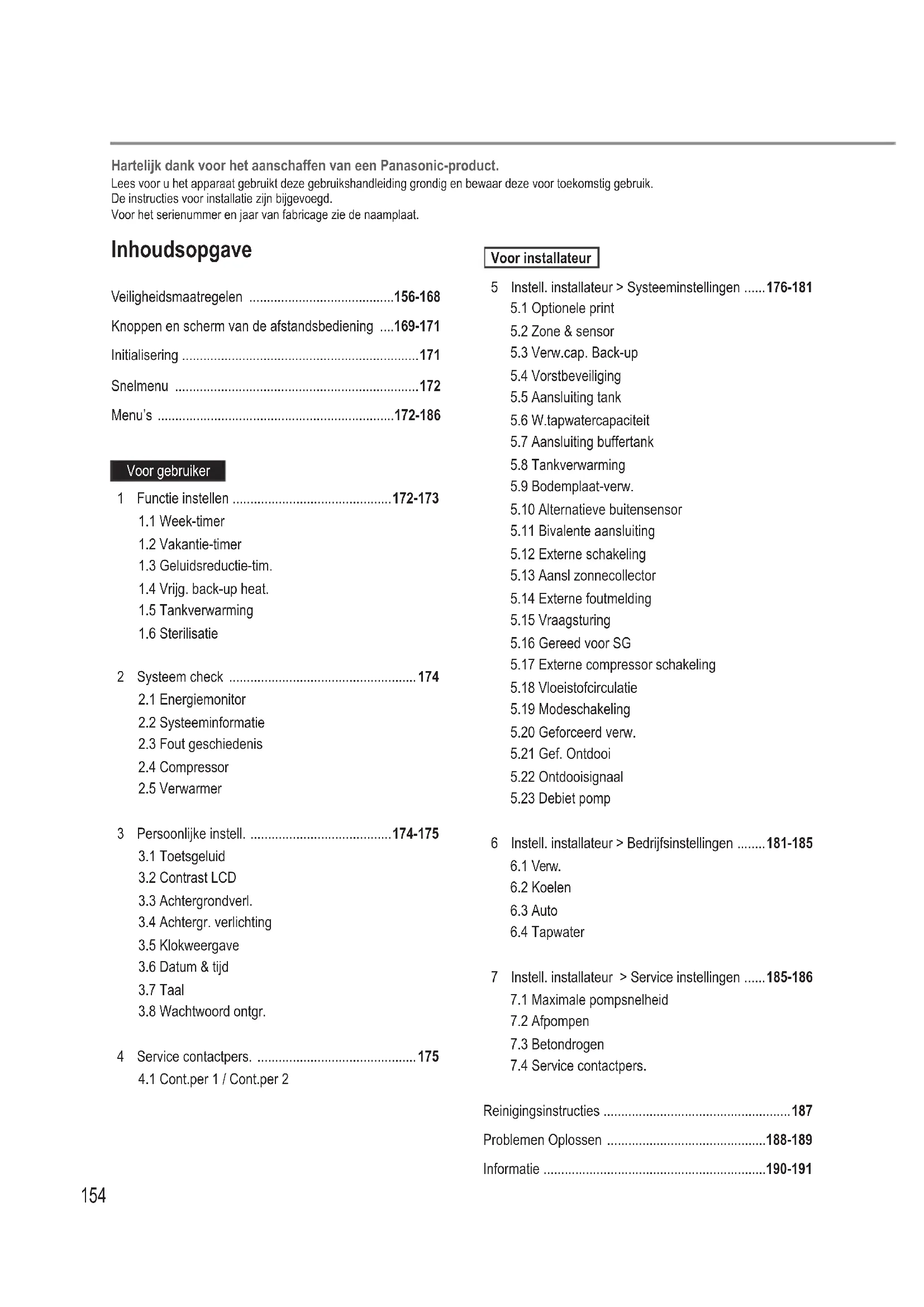 Reinigingsinstructies .....................................................187 Problemen Oplossen .............................................188-189 Informatie ...............................................................190-191 Hartelijk dank voor het aanschaffen van een Panasonic-product. Lees voor u het apparaat gebruikt deze gebruikshandleiding grondig en bewaar deze voor toekomstig gebruik. De instructies voor installatie zijn bijgevoegd. Voor het serienummer en jaar van fabricage zie de naamplaat.NL Zorg ervoor dat het systeem juist is geïnstalleerd door een erkende dealer volgens de verstrekte instructies, voordat u het gaat gebruiken.