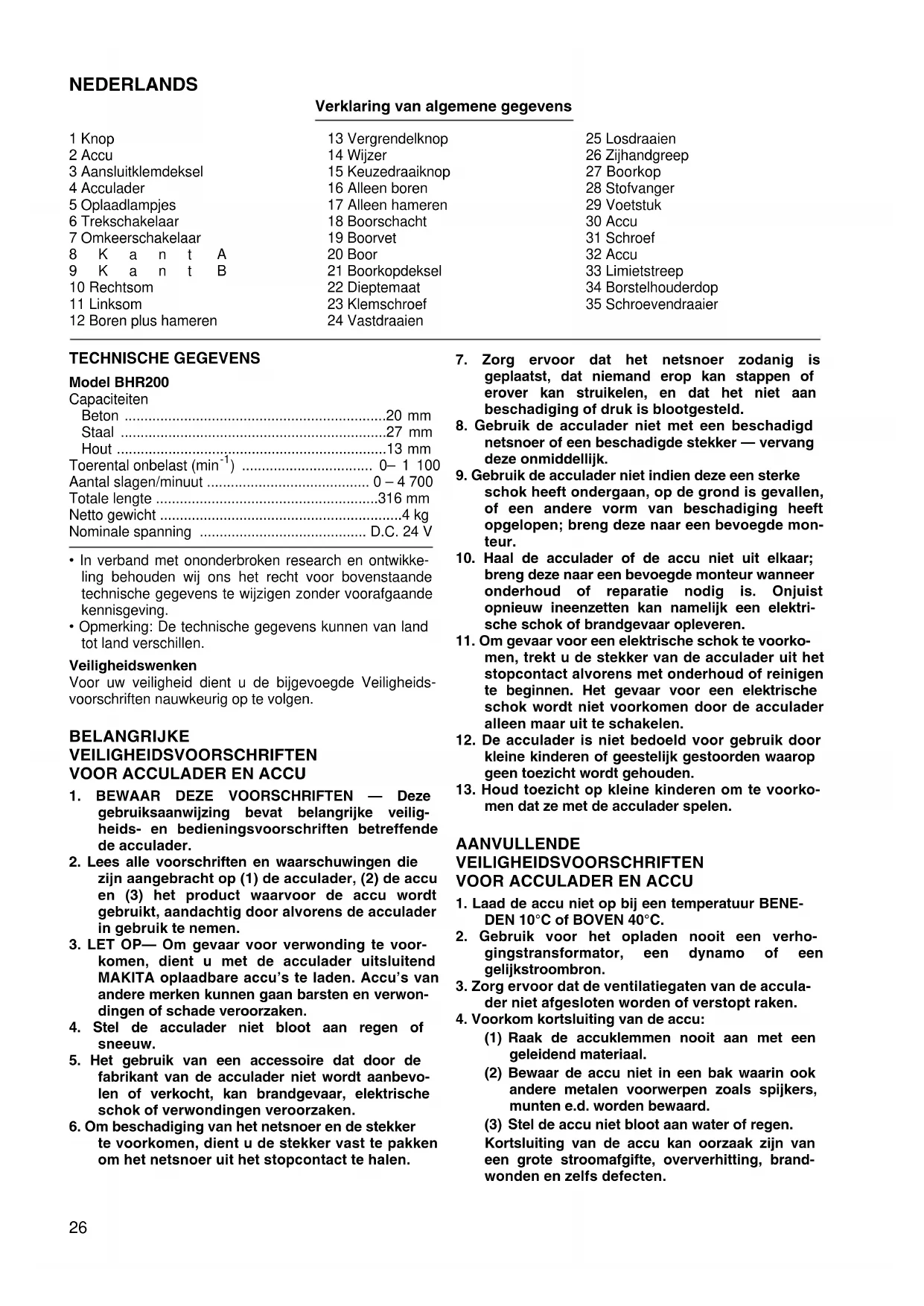 - Gebruik nooit “roteren met hameren” wanneer de boor- kop op het gereedschap is gemonteerd. De boorkop kan hierdoor namelijk beschadigd raken. Blaasbalgje (Fig. 19) Gebruik het blaasbalgje om het gat schoon te maken. Stofvanger (Fig. 20) Gebruik de stofvanger om te voorkomen dat stof op de machine en op uzelf terechtkomt wanneer u boven uw hoofd boort. Bevestig de stofvanger aan de boor. De dia- meter van de boren waaraan de stofvanger kan worden bevestigd, is als volgt. Voetstuk Verwijder het voetstuk wanneer u de accu B2417 gebruikt. Dit maakt het gemakkelijker om het gereedschap stabiel te plaatsen. (Fig. 21) Installeer het voetstuk wanneer u de accu B2430 gebruikt. Dit maakt het gemakkelijker om het gereedschap stabiel te plaatsen. (Fig. 22) ONDERHOUD LET OP: Controleer altijd of het gereedschap is uitgeschakeld en de accu is losgekoppeld vooraleer onderhoud uit te voe- ren aan het gereedschap. Vervangen van koolborstels (Fig. 23 en24) Verwijder en controleer de koolborstels regelmatig. Ver- vang de koolborstels wanneer ze tot aan de limietstreep versleten zijn. Houd de koolborstels schoon zodat ze soepel in de houders glijden. Beide koolborstels dienen tegelijkertijd te worden vervangen. Gebruik uitsluitend identieke koolborstels. Gebruik een schroevendraaier om de borstelhouderdop- pen te verwijderen. Haal de versleten koolborstels eruit, schuif de nieuwe erin en zet de borstelhouderdoppen vast. Opdat het gereedschap veilig en betrouwbaar blijft, die- nen alle reparaties, onderhoud of afstellingen te worden uitgevoerd bij een erkend Makita service centrum. Boordiameter (mm) Stofvanger 5 6 – 14,5 Stofvanger 9 12– 1631 ESPAÑOL Explicación de los dibujos 1Botón 2 Cartucho de batería 3 Tapa del terminal 4 Cargador de batería 5 Luces de carga 6 Interruptor de gatillo 7 Palanca del interruptor de inversión 8 Lado A 9 Lado B 10 Hacia la derecha 11 Hacia la izquierda 12 Giro con percusión 13 Botón de bloqueo 14 Indicador 15 Palanca de cambio 16 Giro solamente 17 Percusión solamente 18 Espiga de la broca 19 Grasa para brocas 20 Broca 21 Cubierta del mandril 22 Tope de profundidad 23 Tornillo de fijación 24 Apretar 25 Aflojar 26 Empuñadura lateral 27 Mandril para taladrar 28 Protector de polvo 29 Pata 30 Cartucho de batería 31 Tornillo 32 Cartucho de batería 33 Marca límite 34 Tapón portaescobillas 35 Destornillador ESPECIFICACIONES Modelo BHR200 Capacidades Hormigón ........................................................... 20mm Acero ................................................................. 27mm Madera .............................................................. 13mm Velocidad en vacío (min