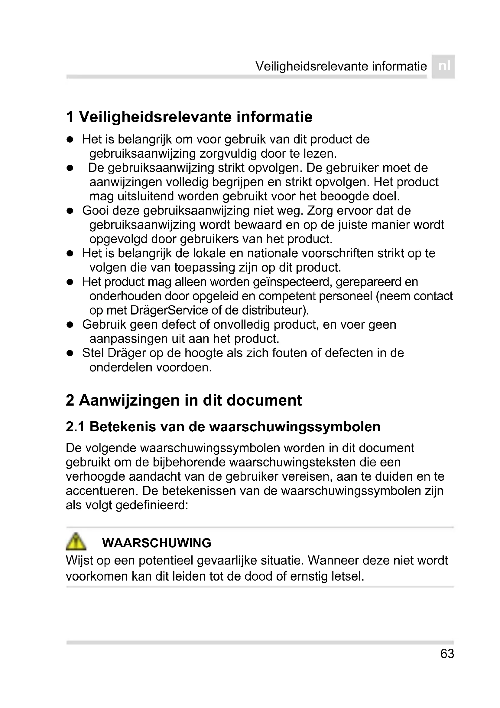 1 Veiligheidsrelevante informatie Het is belangrijk om voor gebruik van dit product de gebruiksaanwijzing zorgvuldig door te lezen. De gebruiksaanwijzing strikt opvolgen. De gebruiker moet de aanwijzingen volledig begrijpen en strikt opvolgen. Het product mag uitsluitend worden gebruikt voor het beoogde doel. Gooi deze gebruiksaanwijzing niet weg. Zorg ervoor dat de gebruiksaanwijzing wordt bewaard en op de juiste manier wordt opgevolgd door gebruikers van het product. Het is belangrijk de lokale en nationale voorschriften strikt op te volgen die van toepassing zijn op dit product. Het product mag alleen worden geïnspecteerd, gerepareerd en onderhouden door opgeleid en competent personeel (neem contact op met DrägerService of de distributeur). Gebruik geen defect of onvolledig product, en voer geen aanpassingen uit aan het product. Stel Dräger op de hoogte als zich fouten of defecten in de onderdelen voordoen. 2 Aanwijzingen in dit document