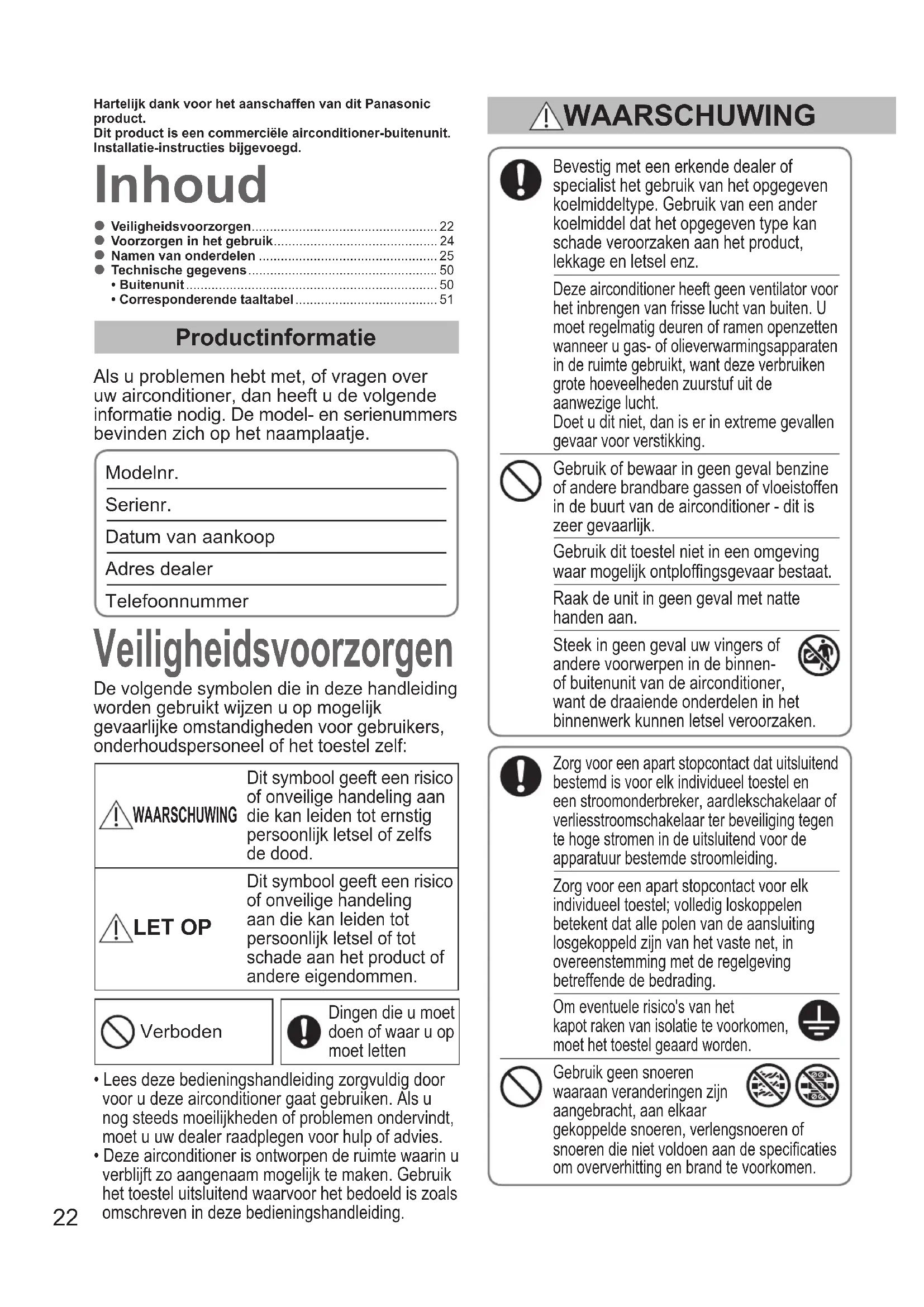 - Corresponderende taaltabel ....................................... 51 Inhoud Veiligheidsvoorzorgen Productinformatie Als u problemen hebt met, of vragen over uw airconditioner, dan heeft u de volgende informatie nodig. De model- en serienummers bevinden zich op het naamplaatje. Modelnr. Serienr. Datum van aankoop Adres dealer Telefoonnummer Bevestig met een erkende dealer of specialist het gebruik van het opgegeven koelmiddeltype. Gebruik van een ander koelmiddel dat het opgegeven type kan schade veroorzaken aan het product, lekkage en letsel enz. Deze airconditioner heeft geen ventilator voor het inbrengen van frisse lucht van buiten. U moet regelmatig deuren of ramen openzetten wanneer u gas- of olieverwarmingsapparaten in de ruimte gebruikt, want deze verbruiken grote hoeveelheden zuurstuf uit de aanwezige lucht. Doet u dit niet, dan is er in extreme gevallen gevaar voor verstikking. Gebruik of bewaar in geen geval benzine of andere brandbare gassen of vloeistoffen in de buurt van de airconditioner - dit is zeer gevaarlijk. Gebruik dit toestel niet in een omgeving waar mogelijk ontplofngsgevaar bestaat. Raak de unit in geen geval met natte handen aan. Steek in geen geval uw vingers of andere voorwerpen in de binnen- of buitenunit van de airconditioner, want de draaiende onderdelen in het binnenwerk kunnen letsel veroorzaken. De volgende symbolen die in deze handleiding worden gebruikt wijzen u op mogelijk gevaarlijke omstandigheden voor gebruikers, onderhoudspersoneel of het toestel zelf: WAARSCHUWING Dit symbool geeft een risico of onveilige handeling aan die kan leiden tot ernstig persoonlijk letsel of zelfs de dood. LET OP Dit symbool geeft een risico of onveilige handeling aan die kan leiden tot persoonlijk letsel of tot schade aan het product of andere eigendommen. Verboden Dingen die u moet doen of waar u op moet letten Hartelijk dank voor het aanschaffen van dit Panasonic product.Dit product is een commerciële airconditioner-buitenunit.Installatie-instructies bijgevoegd.