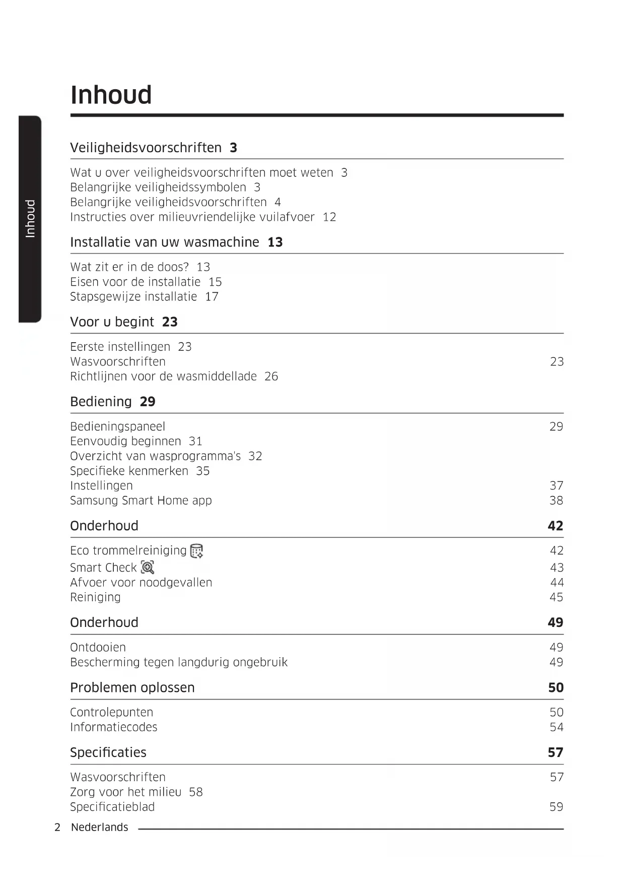 Afvoer voor noodgevallen 44 Reiniging 45 Onderhoud 49 Ontdooien 49 Bescherming tegen langdurig ongebruik 49 Problemen oplossen 50 Controlepunten 50 Informatiecodes 54 Specicaties 57 Wasvoorschriften 57 Zorg voor het milieu 58 Specicatieblad 59Nederlands 3 Veiligheidsvoorschriften Veiligheidsvoorschriften Gefeliciteerd met uw nieuwe Samsung wasmachine. Deze Gebruiksaanwijzing bevat belangrijke informatie over installatie, gebruik en onderhoud van uw apparaat. Neem even de tijd om deze Gebruiksaanwijzing te lezen zodat u volop projt hebt van de vele voordelen en mogelijkheden van uw wasmachine. Wat u over veiligheidsvoorschriften moet weten Lees deze handleiding aandachtig door, zodat u weet hoe u op veilige en efciënte wijze gebruikmaakt van de uitgebreide mogelijkheden en functies van uw nieuwe apparaat. Bewaar de handleiding op een veilige locatie in de buurt van het apparaat voor naslagdoeleinden. Gebruik het apparaat uitsluitend voor het doel.waarvoor het gemaakt is zoals in deze Gebruiksaanwijzing is beschreven. Waarschuwingen en belangrijke veiligheidsinstructies in deze Gebruiksaanwijzing omvatten niet alle mogelijke omstandigheden en situaties die zich kunnen voordoen. Het is uw verantwoordelijkheid om uw gezonde verstand te gebruiken, voorzichtig te zijn en zorgvuldig te werk te gaan bij het installeren, onderhouden en bedienen van uw wasmachine. Omdat deze gebruiksaanwijzing betrekking heeft op verschillende modellen, kunnen de kenmerken van uw wasmachine iets afwijken van de in dit handboek beschrevene en mogelijk zijn niet alle waarschuwingssymbolen op uw machine van toepassing. Indien u nog vragen hebt of problemen neem dan contact op met uw dichtstbijzijnde servicecentrum of zoek online hulp en informatief op www.samsung.com. Belangrijke veiligheidssymbolen De betekenis van de symbolen en tekens in deze gebruiksaanwijzing: WAARSCHUWING Gevaren of onveilige werkwijzen als gevolg waarvan dodelijk of ernstig persoonlijk letsel en/of materiële schade kan ontstaan. VOORZICHTIG Gevaren of onveilige werkwijzen als gevolg waarvan persoonlijk letsel en/of materiële schade kan ontstaan. OPMERKING Geeft aan dat het risico op persoonlijk letsel of materiële schade aanwezig is.4 Nederlands Veiligheidsvoorschriften Veiligheidsvoorschriften Deze waarschuwingstekens staan er om letsel bij uzelf en bij anderen te voorkomen. Houdt u er alstublieft nadrukkelijk aan. Bewaar deze handleiding na het lezen op een veilige plek voor naslagdoeleinden. Lees alle instructies voordat u het apparaat in gebruik neemt. Net als bij alle andere elektrische apparatuur met bewegende delen, bestaan er altijd mogelijke risico’s. Om dit apparaat veilig te kunnen gebruiken, dient u vertrouwd te raken met de bediening en voorzichtig te zijn bij het gebruik ervan. Belangrijke veiligheidsvoorschriften WAARSCHUWING Om bij gebruik van het apparaat het risico van brand, elektrische schokken of persoonlijk letsel te beperken, dient u de algemene voorzorgsmaatregelen na te leven waaronder: