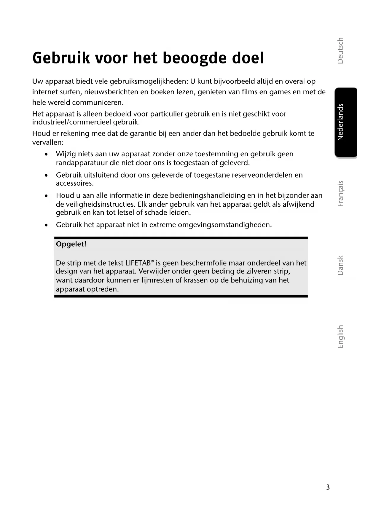Copyright © 2012 Alle rechten voorbehouden. Dit handboek is door de auteurswet beschermd. Handelsmerk: Google, Android en andere merken van Google zijn gedeponeerde merken van Google Inc. Geproduceerd onder licentie van Dolby Laboratories. Dolby en het dubbele D-symbool zijn handelsmerken van Dolby Laboratories. Andere handelsmerken zijn het eigendom van hun desbetreffende houder. Technische wijzigingen voorbehouden.3 Français Nederlands Deutsch Dansk English Gebruik voor het beoogde doel Uw apparaat biedt vele gebruiksmogelijkheden: U kunt bijvoorbeeld altijd en overal op internet surfen, nieuwsberichten en boeken lezen, genieten van films en games en met de hele wereld communiceren. Het apparaat is alleen bedoeld voor particulier gebruik en is niet geschikt voor industrieel/commercieel gebruik. Houd er rekening mee dat de garantie bij een ander dan het bedoelde gebruik komt te vervallen: Wijzig niets aan uw apparaat zonder onze toestemming en gebruik geen randapparatuur die niet door ons is toegestaan of geleverd. Gebruik uitsluitend door ons geleverde of toegestane reserveonderdelen en accessoires. Houd u aan alle informatie in deze bedieningshandleiding en in het bijzonder aan de veiligheidsinstructies. Elk ander gebruik van het apparaat geldt als afwijkend gebruik en kan tot letsel of schade leiden. Gebruik het apparaat niet in extreme omgevingsomstandigheden. Opgelet! De strip met de tekst LIFETAB® is geen beschermfolie maar onderdeel van het design van het apparaat. Verwijder onder geen beding de zilveren strip, want daardoor kunnen er lijmresten of krassen op de behuizing van het apparaat optreden.4 Conformiteitsinformatie Deze tablet-pc ondersteunt de volgende functies: Wireless LAN Bluetooth