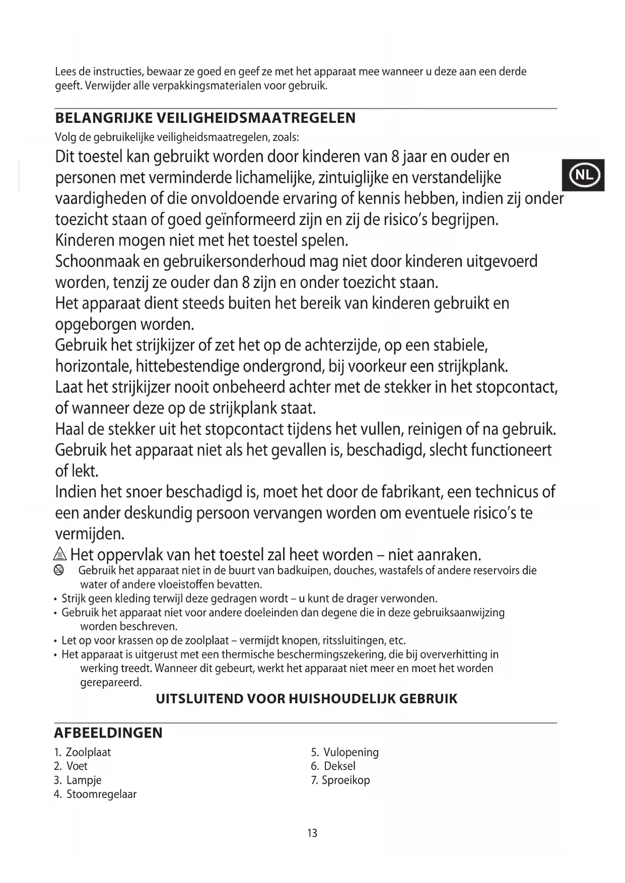 An d’éviter les problèmes occasionnés à l’environnement et à la santé par des substances dangereuses, les appareils et les batteries rechargeables et non rechargeables présentant l’un de ces symboles ne doivent pas être éliminés avec les déchets municipaux non triés. Éliminez dans tous les cas les produits électriques et électroniques et, le cas échéant, les batteries rechargeables et non rechargeables, dans un centre ociel et approprié de collecte/recyclage.13 Lees de instructies, bewaar ze goed en geef ze met het apparaat mee wanneer u deze aan een derde geeft. Verwijder alle verpakkingsmaterialen voor gebruik. BELANGRIJKE VEILIGHEIDSMAATREGELEN Volg de gebruikelijke veiligheidsmaatregelen, zoals: Dit toestel kan gebruikt worden door kinderen van 8 jaar en ouder en personen met verminderde lichamelijke, zintuiglijke en verstandelijke vaardigheden of die onvoldoende ervaring of kennis hebben, indien zij onder toezicht staan of goed geïnformeerd zijn en zij de risico’s begrijpen. Kinderen mogen niet met het toestel spelen. Schoonmaak en gebruikersonderhoud mag niet door kinderen uitgevoerd worden, tenzij ze ouder dan 8 zijn en onder toezicht staan. Het apparaat dient steeds buiten het bereik van kinderen gebruikt en opgeborgen worden. Gebruik het strijkijzer of zet het op de achterzijde, op een stabiele, horizontale, hittebestendige ondergrond, bij voorkeur een strijkplank. Laat het strijkijzer nooit onbeheerd achter met de stekker in het stopcontact, of wanneer deze op de strijkplank staat. Haal de stekker uit het stopcontact tijdens het vullen, reinigen of na gebruik. Gebruik het apparaat niet als het gevallen is, beschadigd, slecht functioneert of lekt. Indien het snoer beschadigd is, moet het door de fabrikant, een technicus of een ander deskundig persoon vervangen worden om eventuele risico’s te vermijden. h Het oppervlak van het toestel zal heet worden – niet aanraken. b Gebruik het apparaat niet in de buurt van badkuipen, douches, wastafels of andere reservoirs die water of andere vloeistoen bevatten.
