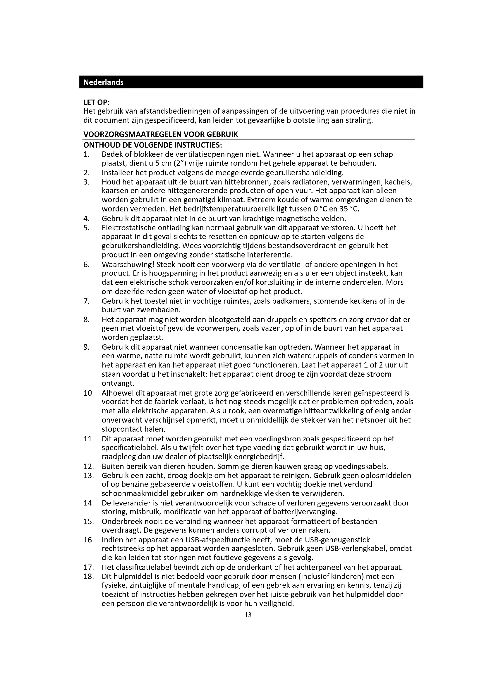 13. Gebruik een zacht, droog doekje om het apparaat te reinigen. Gebruik geen oplosmiddelen