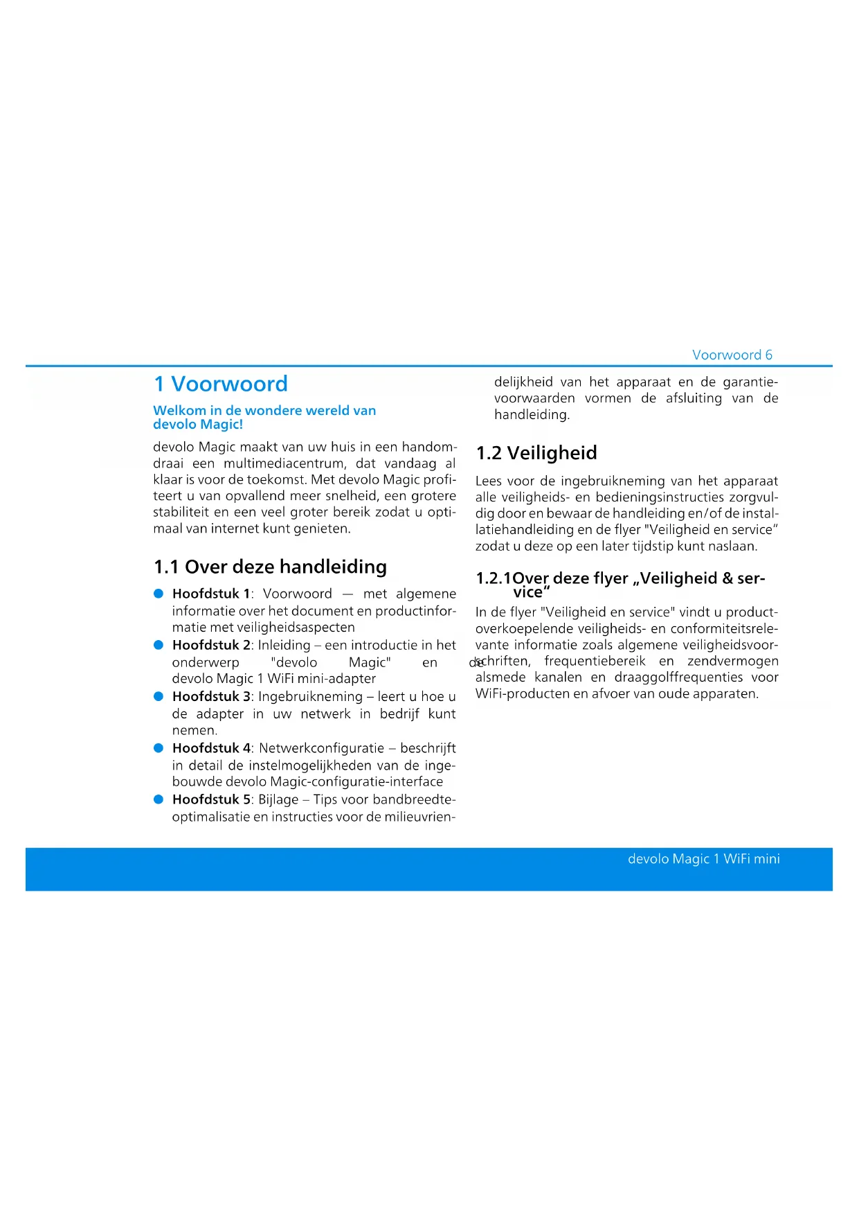 b Hoofdstuk 1: Voorwoord — met algemene informatie over het document en productinfor- matie met veiligheidsaspecten b Hoofdstuk 2: Inleiding – een introductie in het onderwerp "devolo Magic" en de devolo Magic 1 WiFi mini-adapter b Hoofdstuk 3: Ingebruikneming – leert u hoe u de adapter in uw netwerk in bedrijf kunt nemen. b Hoofdstuk 4: Netwerkconfiguratie – beschrijft in detail de instelmogelijkheden van de inge- bouwde devolo Magic-configuratie-interface b Hoofdstuk 5: Bijlage – Tips voor bandbreedte- optimalisatie en instructies voor de milieuvrien- delijkheid van het apparaat en de garantie- voorwaarden vormen de afsluiting van de handleiding.