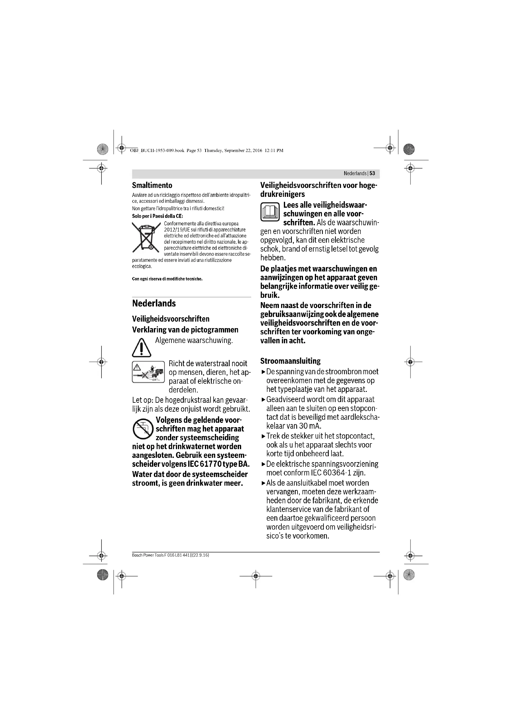 tot max. 50 m lengte Opmerking: Als u een verlengkabel gebruikt, moet deze (zoals bij de veiligheidsvoorschriften beschreven) een aardedraad bezitten die via de stekker met de aardedraad van uw elektri- sche installatie verbonden is. Vraag bij twijfel een vakman voor elektriciteit of de Bosch- klantenservice om advies. VOORZICHTIG: Verlengkabels die niet volgens de voorschriften zijn, kunnen gevaarlijk zijn. Verlengkabels, stekkers en contrastekkers moeten waterdicht uitgevoerd en voor gebruik buitenshuis goedgekeurd zijn. Kabelverbindingen moeten droog zijn en mogen niet op de grond liggen. Voor meer veiligheid gebruikt u een aardlekschakelaar met een foutstroom van maximaal 30 mA. Deze aardlekschake- laar moet voor elk gebruik gecontroleerd worden. Als de aansluitkabel beschadigd is, mag deze alleen door een erkende Bosch-werkplaats worden gerepareerd. Opmerking voor producten die niet in Groot-Brittannië wor- den verkocht: LET OP: Voor uw veiligheid is het noodzakelijk dat de aan de machine aangebrachte stekker met de verlengkabel wordt verbonden. De stekker van de verlengkabel moet tegen spat- water bestemd zijn en uit rubber bestaan of met rubber be- kleed zijn. De verlengkabel moet met een trekontlasting wor- den gebruikt. Let erop dat dit apparaat niet zonder water mag lopen. Gebruik Inschakelen Verbind de waterslang (niet meegeleverd) met de waterkraan en met het apparaat. Zorg ervoor dat de netschakelaar in stand „0” staat en steek de stekker van het apparaat in het stopcontact. Open de waterkraan. De inschakelblokkering (achterste schakelaar op de pistool- greep) bedienen om de trekker vrij te geven. De trekker hele- maal indrukken tot het water gelijkmatig stroomt en zich geen lucht meer in het apparaat en in de hogedrukslang bevindt. De trekker loslaten. De inschakelblokkering (voorste schakelaar op de pistoolgreep) bedienen. Draai de netschakelaar. Het spuitpistool omlaag richten. De inschakelblokkering bedienen om de trekker vrij te geven. De trekker helemaal indrukken. Autostopfunctie De motor van het apparaat wordt uitgeschakeld zodra u de trekker van de pistoolgreep loslaat. Tips voor de werkzaamheden Algemeen Zorg ervoor dat de hogedrukreiniger op een vlakke onder- grond staat. Ga met de hogedrukslang niet te ver naar voren en trek de ho- gedrukreiniger niet aan de slang. Dit kan ertoe leiden dat de hogedrukreiniger niet meer stabiel staat en omvalt. Knik de hogedrukslang niet en rijd er niet over met een voer- tuig. Bescherm de hogedrukslang tegen scherpe randen en hoeken. Gebruik de rotatiesproeier niet voor het wassen van een auto. Waarschuwing! De Patio Cleaners is alleen geschikt voor het gebruik op egale oppervlakken. Gebruik deze niet voor trap- pen en verticale oppervlakken. Gebruik nooit de rotatie- sproeier als deze in bedrijf is. Tips voor de werkzaamheden met reinigingsmid- delen Gebruik alleen reinigingsmiddelen die uitdrukkelijk voor hogedrukreinigers geschikt zijn. Met het oog op het milieu raden wij u een spaarzaam gebruik van reinigingsmiddelen aan. De op de verpakking aange- brachte adviezen over verdunning in acht nemen. Geadviseerde reinigingsmethode Stap 1: Vuil verwijderen Gebruik de hogedruk-schuimsproeier of gebruik de schuimin- stelling van de 3-in-1-sproeier en doseer het reinigingsmiddel spaarzaam. Stap 2: Vuil verwijderen Verwijder het losgemaakte vuil met hoge druk. Opmerking: Begin bij het reinigen van verticale oppervlakken met het reinigingsmiddel onderaan en werk naar boven toe. Bij het afspoelen werkt u van boven naar beneden. Gebruik van alternatieve watertoevoer Deze hogedrukreiniger is zelfaanzuigend en maakt aanzui- ging van water uit reservoirs en natuurlijke bronnen mogelijk. Het is BELANGRIJK dat het Bosch-filter aan de wateringang gereinigd en ingezet is en alleen schoon water wordt aangezo- gen. Open tanks/reservoirs en natuurlijk oppervlakte- water Gebruik de zelf-aanzuigbuis, bestaand uit: – aanzuigzeef met terugslagklep – 3 m versterkte zuigslang – universele koppeling naar hogedrukreiniger Met dit toebehoren kan de hogedrukreiniger water van 0,5 hoogte boven de waterspiegel aanzuigen. Dit kan ongeveer 15 seconden duren. Dompel de 3 m slang volledig onder water om de lucht te ver- dringen. Sluit de 3 m zuigslang op de hogedrukreiniger aan en zorg ervoor dat de aanzuigzeef onder water blijft. OBJ_BUCH-1953-009.book Page 58 Thursday, September 22, 2016 12:11 PMNederlands | 59 Bosch Power Tools F 016 L81 441 | (22.9.16) Laat de hogedrukreiniger met verwijderd spuitpistool lopen tot water gelijkmatig uit de hogedrukslang stroomt. Als er na 25 seconden nog geen water naar buiten komt, schakelt u het gereedschap uit en controleert u alle aansluitingen. Als er wa- ter stroomt, de hogedrukreiniger uitschakelen en voor de werkzaamheden het spuitpistool en de spuitlans aansluiten. Het is belangrijk dat slang en koppelingen van goede kwaliteit en goed sluitend verbonden zijn en de pakkingen onbescha- digd en recht ingelegd zijn. Niet goed sluitende aansluitingen kunnen het aanzuigen belemmeren. Waterreservoirs met aftapkraan Als de hogedrukreiniger moet worden aangesloten op een tank met een passende aftapkraan, moet eerst een watertank (niet meegeleverd) op de kraan worden aangesloten. Open de kraan om alle lucht uit de slang te verdringen en sluit deze vervolgens op de hogedrukreiniger aan. Storingen opsporen Symptomen Mogelijke oorzaak Oplossing Motor start niet Stekker niet aangesloten Sluit de stekker aan Stopcontact defect Gebruik een ander stopcontact Zekering doorgeslagen Vervang de zekering Verlengkabel beschadigd Probeer het zonder verlengkabel Motorbeveiliging aangesproken De motor 15 minuten laten afkoelen Bevroren Pomp, waterslang of toebehoren laten ontdooien Motor blijft stilstaan Zekering doorgeslagen Zekering vervangen Netspanning niet in orde Controleer de netspanning, deze moet met de gege- vens op het typeplaatje overeenkomen Motorbeveiliging aangesproken De motor 15 minuten laten afkoelen Zekering slaat 