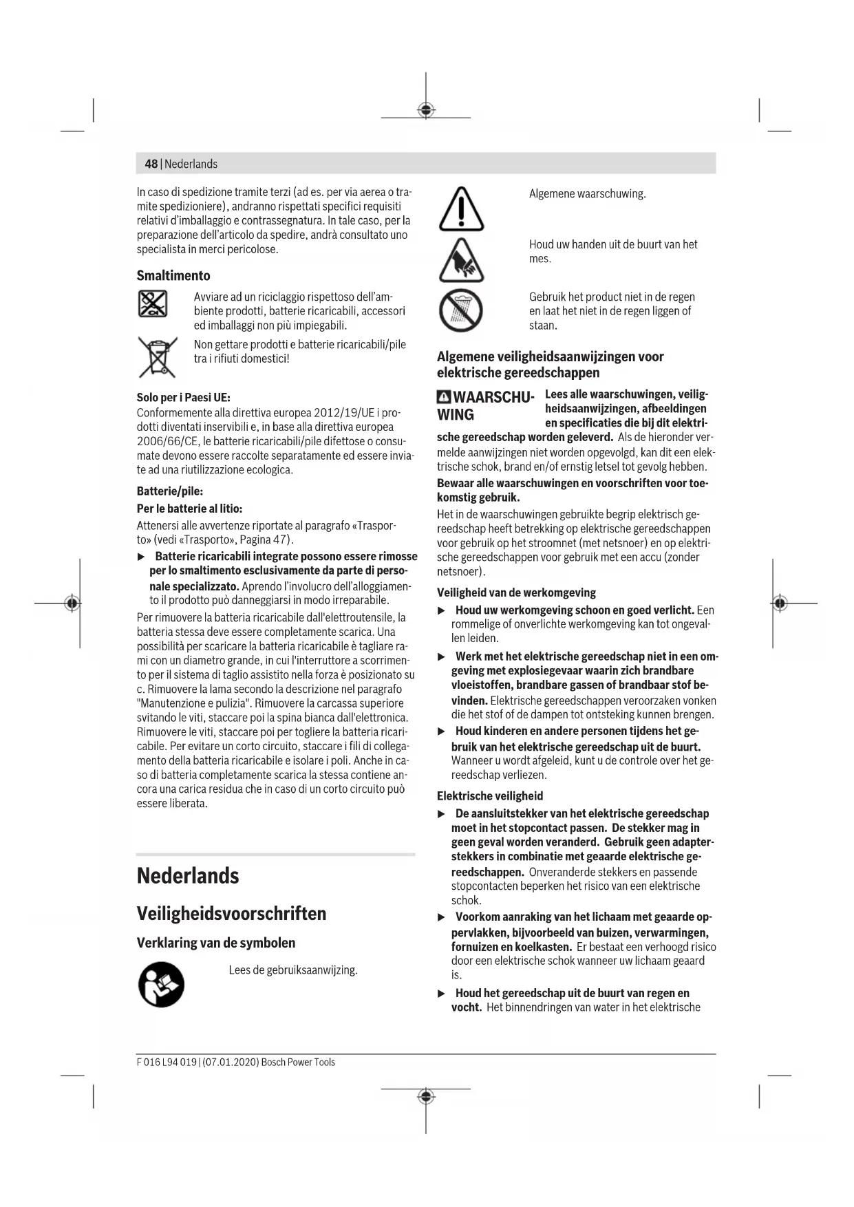 Rimuovere vegetazione sottile o fragile. C10 In linea di massima rimuovere rami morti, danneggia- ti oppure malati. Individuazione dei guasti e rimedi La tabella che segue contiene informazioni generali per l'eliminazione dei difetti. L’indicatore dello stato di carica della batteria fornisce informazioni supplementari che possono essere impiegate per l’identificazione di un errore o di un problema. Problema Possibili cause Rimedi L’apparecchio per il giardi- naggio si ferma durante il taglio Troppa poca pressione sulle impugnature Serrare le impugnature durante il taglio Serrare in modo più saldo le impugnature Le lame si bloccano in un ra- mo grosso Bassa autonomia della batteria ricaricabile Legno troppo duro Diametro troppo grande Posizione di taglio non corretta Tenere l’apparecchio per il giardinaggio solo per l'impugnatura superiore e sbloccarlo muo- vendo avanti e indietro le lame Se necessario, ricaricare la batteria F 016 L94 019 | (07.01.2020) Bosch Power ToolsItaliano | 47 Problema Possibili cause Rimedi Non è possibile attivare il sistema di taglio assistito nella forza se durante il taglio lampeggia il LED: Il LED lampeggia 3 volte in rosso Il legno da tagliare è troppo grosso/duro Cercare di effettuare il taglio in un settore del ramo più sottile Carica della batteria troppo scarsa Ricaricare la batteria Il LED lampeggia 2 volte in rosso Temperatura della batteria ricaricabile troppo alta Temperatura ambiente troppo alta (non espor- re l'apparecchio per il giardinaggio all'irradia- mento solare diretto) Attendere 10-15 minuti per lasciare raffredda- re la batteria ricaricabile Temperatura della batteria ricaricabile troppo bassa Temperatura ambiente troppo bassa (non uti- lizzare l'apparecchio per il giardinaggio con temperature esterne inferiori a –20°C) In caso di non impiego conservare l'apparec- chio per il giardinaggio in ambienti interni Il LED lampeggia 1 volte in rosso Carica della batteria troppo scarsa Ricaricare la batteria Il LED è illuminato in verde e lampeggia poi velocemente in rosso Sistema di taglio assistito nella forza difettoso Contattare il Servizio Assistenza Tecnica Clienti Il LED lampeggia veloce- mente in rosso dopo che è avvenuto il taglio Tempo troppo scarso tra i tagli Lasciare un po’ più di tempo tra due tagli conse- cutivi Manutenzione ed assistenza Manutenzione, pulizia e magazzinaggio u Tenere il prodotto pulito per poter lavorare bene ed in modo sicuro. u Mettere sempre guanti di protezione lavorando con l'ap- parecchio oppure effettuando lavori di manutenzione/pu- lizia. Se la batteria non è più funzionante, contattare un Centro Assistenza Clienti autorizzato per elettroutensili Bosch. La molla (4) tra le impugnature NON è sostituibile e NON DOVREBBE essere tolta. Il mancato rispetto di questa av- vertenza può causare lesioni gravi. Sostituzione della lama (vedi figure D1–D4) Lama di ricambio: F016800475 Sbloccare l'apparecchio per il giardinaggio tramite il blocco di sicurezza (6). Utilizzare la chiave per esagono interno fornita in dotazione con la lama di ricambio per rimuovere la vite (8) insieme alla boccola (11) e di conseguenza per rimuovere la lama. Inserire la lama nuova (1) come illustrato. Inserire quindi la boccola (11) insieme alla vite (8) e serrare saldamente la vi- te con la chiave per esagono interno. Dopo il taglio dei rami/conservazione Pulire accuratamente la parte esterna dell’apparecchio per il giardinaggio con un spazzola morbida ed uno straccio. Non usare acqua, solventi oppure prodotti di lucidatura. Rimuo- vere tutti i depositi. Per la conservazione lubrificare sempre le lame con uno spray per manutenzione. Conservare l’apparecchio per il giardinaggio in un posto sicu- ro ed asciutto, fuori dalla portata dei bambini, con blocco di sicurezza (6) bloccato. In caso di non impiego non lasciare l'apparecchio per il giardinaggio incustodito. Non mettere nessun altro oggetto sull’apparecchio per il giardinaggio. Servizio di assistenza e consulenza tecnica www.bosch-garden.com In caso di richieste o di ordinazione di pezzi di ricambio, co- municare sempre il codice prodotto a 10cifre riportato sulla targhetta di identificazione del prodotto. Svizzera Sul sito www.bosch-pt.com/ch/it è possible ordinare diret- tamente on-line i ricambi. Tel.: (044) 8471513 Fax: (044) 8471553 E-Mail: Aftersales.Service@de.bosch.com Italia Tel.: (02) 3696 2314 E-Mail: pt.hotlinebosch@it.bosch.com Trasporto Le batterie al litio contenute sono soggette ai requisiti di leg- ge relativi a merci pericolose. Le batterie possono essere trasportate su strada tramite l’utente senza ulteriori precau- zioni. Bosch Power Tools F 016 L94 019 | (07.01.2020)48 | Nederlands In caso di spedizione tramite terzi (ad es. per via aerea o tra- mite spedizioniere), andranno rispettati specifici requisiti relativi d’imballaggio e contrassegnatura. In tale caso, per la preparazione dell’articolo da spedire, andrà consultato uno specialista in merci pericolose. Smaltimento Avviare ad un riciclaggio rispettoso dell’am- biente prodotti, batterie ricaricabili, accessori ed imballaggi non più impiegabili. Non gettare prodotti e batterie ricaricabili/pile tra i rifiuti domestici! Solo per i Paesi UE: Conformemente alla direttiva europea 2012/19/UE i pro- dotti diventati inservibili e, in base alla direttiva europea 2006/66/CE, le batterie ricaricabili/pile difettose o consu- mate devono essere raccolte separatamente ed essere invia- te ad una riutilizzazione ecologica. Batterie/pile: Per le batterie al litio: Attenersi alle avvertenze riportate al paragrafo «Traspor- to» (vedi «Trasporto», Pagina47). u Batterie ricaricabili integrate possono essere rimosse per lo smaltimento esclusivamente da parte di perso- nale specializzato. Aprendo l’involucro dell’alloggiamen- to il prodotto può danneggiarsi in modo irreparabile. Per rimuovere la batteria ricaricabile dall'elettroutensile, la batteria stessa deve essere completament