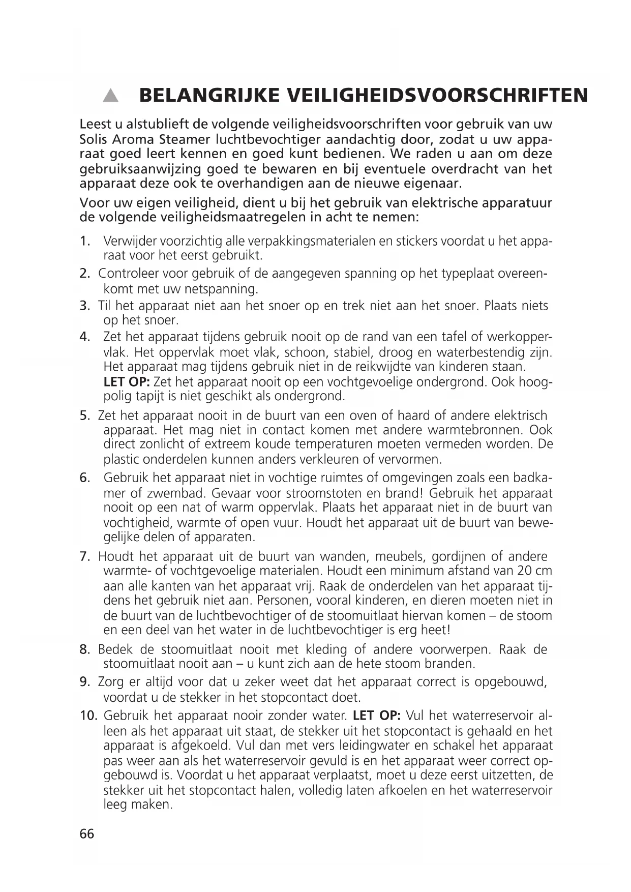 Keep the original packaging in a safe place so that you may use it in the event that transportation or shipping of the product becomes necessary. Solis of Switzerland Ltd Solis-House • CH-8152 Glattbrugg-Zurich • Switzerland Phone +41 44 874 64 54 • Fax +41 44 874 64 99 info@solis.ch • www.solis.ch • www.solis.com6566 BELANGRIJKE VEILIGHEIDSVOORSCHRIFTEN Leest u alstublieft de volgende veiligheidsvoorschriften voor gebruik van uw Solis Aroma Steamer luchtbevochtiger aandachtig door, zodat u uw appa- raat goed leert kennen en goed kunt bedienen. We raden u aan om deze gebruiksaanwijzing goed te bewaren en bij eventuele overdracht van het apparaat deze ook te overhandigen aan de nieuwe eigenaar. Voor uw eigen veiligheid, dient u bij het gebruik van elektrische apparatuur de volgende veiligheidsmaatregelen in acht te nemen: