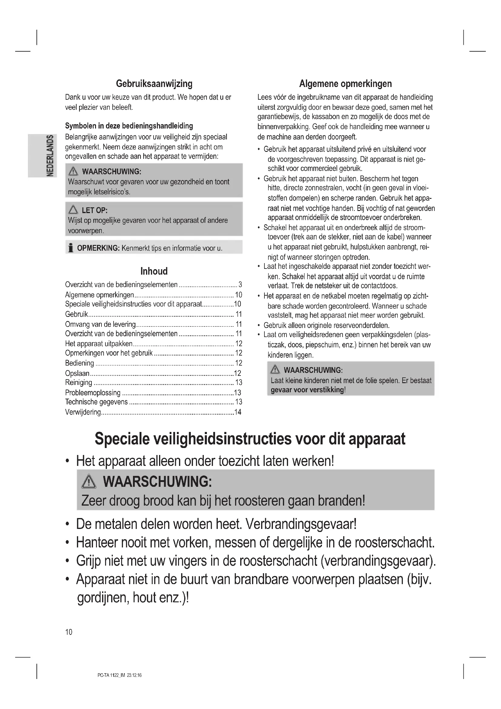 - Trek de kruimellade aan de handgreep naar buiten, ver- wijder de broodresten en schuif de lade weer terug. Probleemoplossing Probleem Mogelijke Oorzaak Oplossing Het apparaat werkt niet. Het apparaat krijgt geen stroom. Controleer het stop- contact met een ander apparaat. Steek de stekker goed in het stopcontact. Controleer de stop. Het apparaat is stuk. Neem contact op met uw leverancier of specialist. Het brood is te donker. De rooster- stand was te hoog. Kies een lagere roosterstand. Het brood is te licht. De rooster- stand was te laag. Kies een hogere roosterstand. Probleem Mogelijke Oorzaak Oplossing De broodlift komt niet langer omhoog. De snee brood zit vast in het apparaat. Trek de stekker uit het stopcontact! Laat het apparaat afkoelen! Verwijder de snee brood met een object dat geen warmte doorgeeft, zoals een houten steel. Draai indien nodig het broodrooster om zodat de snee brood eruit valt. Technische gegevens Model:.....................................................................PC-TA 1122 Spanningstoevoer: ................................ 220 - 240 V~, 50 /60 Hz Opgenomen vermogen: ..................................................550 W Beschermingsklasse: ............................................................... Nettogewicht: .........................................................ong. 0,95 kg Het recht om technische en ontwerpaanpassingen te maken in de loop van voortdurende productontwikkeling blijft voorbehouden. Dit apparaat is gekeurd conform de op dit moment van toepassing zijnde CE-richtlijnen zoals bijvoorbeeld elektro- magnetische compatibiliteit en laagspanningsvoorschriften en is geconstrueerd volgens de nieuwste veiligheidstechnische voorschriften.14 PC-TA 1122_IM 23.12.16 Verwijdering Betekenis van het symbool “vuilnisemmer” Bescherm ons milieu, elektrische apparaten horen niet in het huisafval. Maak voor het afvoeren van elektrische apparaten gebruik van de voorgeschreven verza- melpunten en geef daar de elektrische apparaten af die u niet meer gebruikt. Daardoor helpt u de potentiële effecten te voorkomen die een verkeerde afvoer op het milieu en de menselijke gezondheid kunnen hebben. Op deze wijze levert u uw bijdrage aan het hergebruik, de recycling en andere verwerkingsvormen voor oude elektroni- sche en elektrische apparaten. Voor informatie over verzamelpunten voor uw apparaten kunt u contact opnemen met uw gemeente of gemeenteadminis- tratie.15 PC-TA 1122_IM 23.12.16 Mode d’emploi Merci d’avoir choisi notre produit. Nous espérons que vous saurez proter votre appareil. Symboles de ce mode d’emploi Les informations importantes pour votre sécurité sont particu- lièrement indiquées. Veillez à bien respecter ces indications an d’éviter tout risque d’accident ou d’endommagement de l’appareil :
