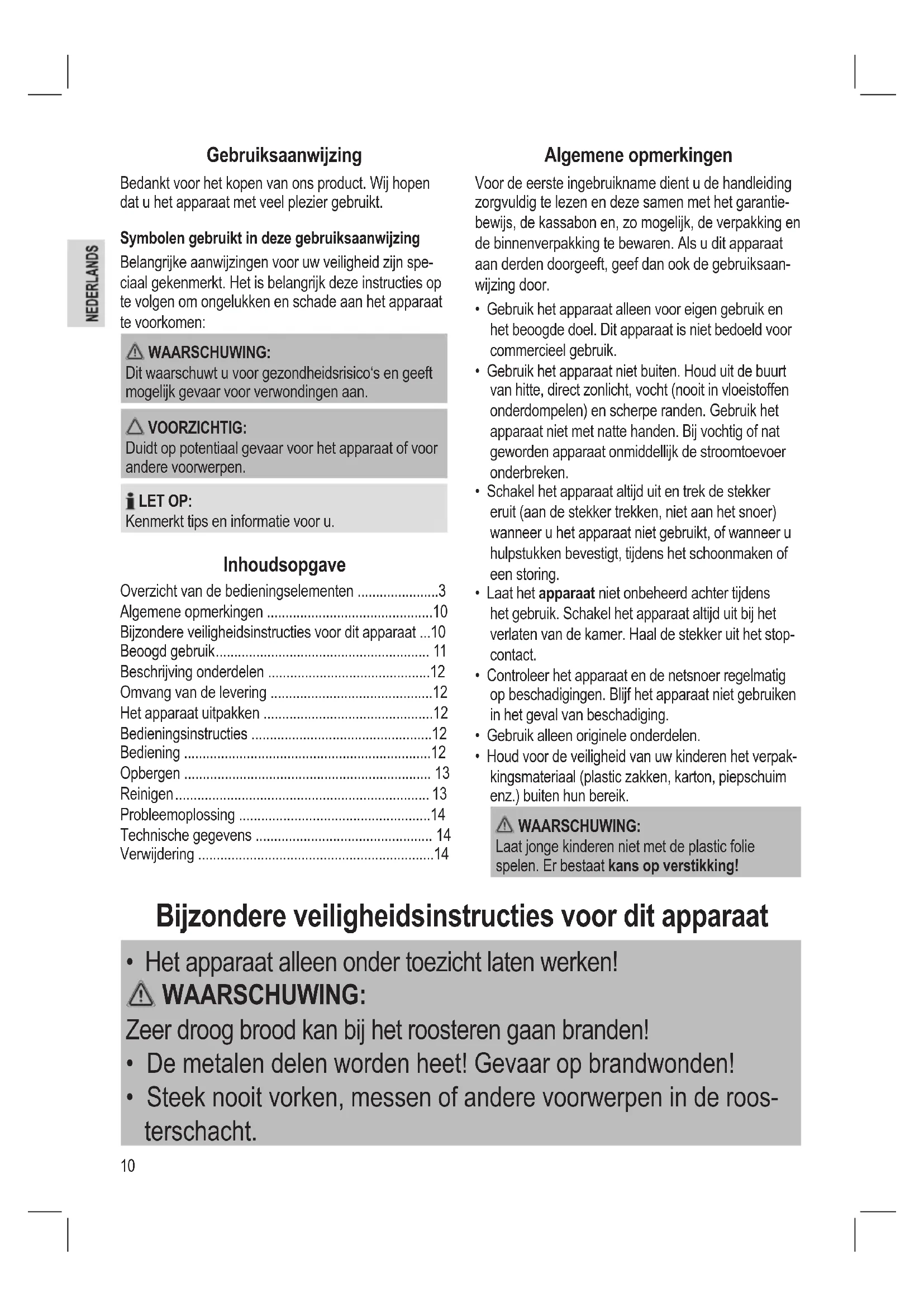 - Het apparaat alleen onder toezicht laten werken! WAARSCHUWING: Zeer droog brood kan bij het roosteren gaan branden!