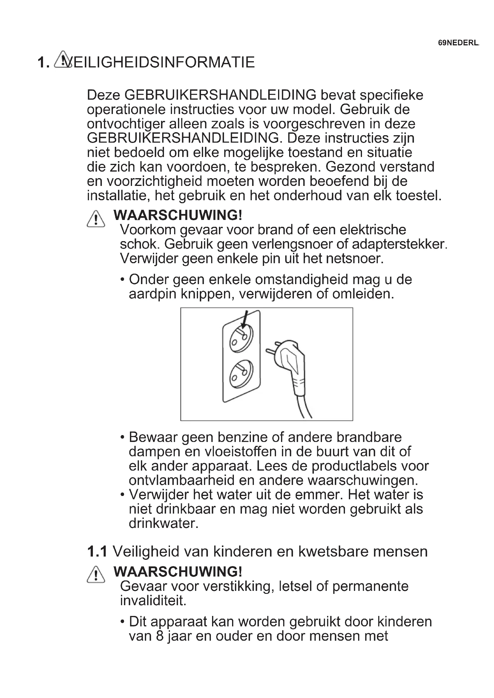 - Trek de stekker van de ontvochtiger nooit uit door aan het netsnoer te trekken. Grijp de stekker algijd stevig vast en trek die rechtstreeks uit het stopcontact.