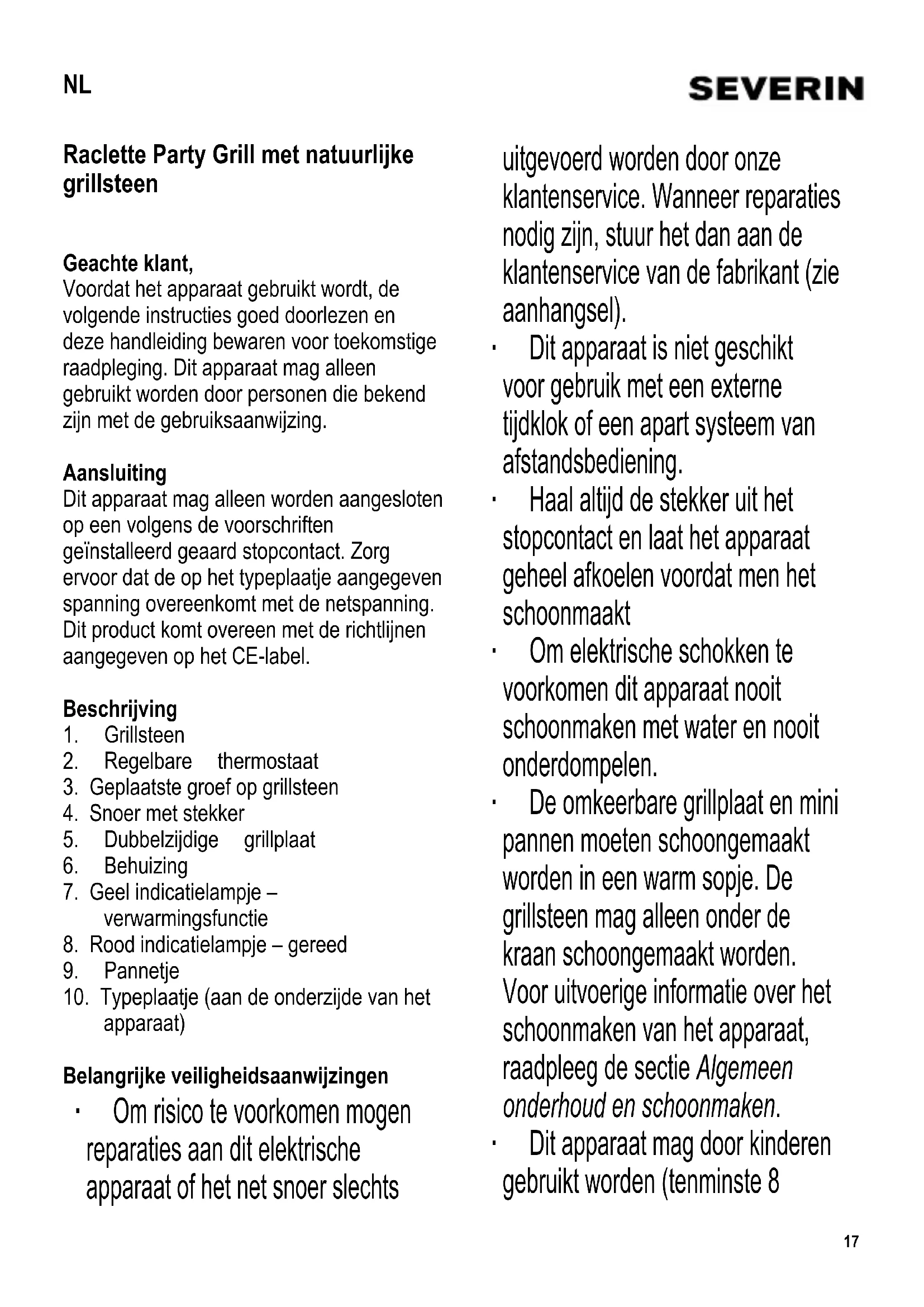 apparaat) Belangrijke veiligheidsaanwijzingen ∙ Om risico te voorkomen mogen reparaties aan dit elektrische apparaat of het net snoer slechts uitgevoerd worden door onze klantenservice. Wanneer reparaties nodig zijn, stuur het dan aan de klantenservice van de fabrikant (zie aanhangsel). ∙ Dit apparaat is niet geschikt voor gebruik met een externe tijdklok of een apart systeem van afstandsbediening. ∙ Haal altijd de stekker uit het stopcontact en laat het apparaat geheel afkoelen voordat men het schoonmaakt ∙ Om elektrische schokken te voorkomen dit apparaat nooit schoonmaken met water en nooit onderdompelen. ∙ De omkeerbare grillplaat en mini pannen moeten schoongemaakt worden in een warm sopje. De grillsteen mag alleen onder de kraan schoongemaakt worden. Voor uitvoerige informatie over het schoonmaken van het apparaat, raadpleeg de sectie Algemeen onderhoud en schoonmaken. ∙ Dit apparaat mag door kinderen gebruikt worden (tenminste 8 NL18 jaar oud) en door personen met verminderde fysische, zintuiglijke of mentale bekwaamheden, of gebrek van ervaring en kennis, wanneer deze onder begeleiding zijn of instructies ontvangen hebben over het gebruik van dit apparaat en de gevaren en veiligheidsvoorschriften volledig begrijpen. ∙ Kinderen mogen niet met het apparaat spelen. ∙ Kinderen mogen in geen geval dit apparaat schoonmaken of onderhoudswerkzaamheden uitvoeren behalve wanneer onder toezicht van een volwassene en ze tenminste 8 jaar oud zijn. ∙ Het apparaat en het snoer moeten altijd goed weggehouden worden van kinderen jonger dan 8 jaar. ∙ Waarschuwing: houdt kinderen weg van inpakmateriaal, daar deze een bron van gevaar zijn bijvoorbeeld door verstikking. ∙ Voordat het apparaat wordt gebruikt moet zowel de hoofdeenheid inclusief het netsnoer evenals elk hulpstuk dat wordt aangebracht, eerst zorgvuldig op eventuele defecten worden gecontroleerd. Indien het apparaat, bijvoorbeeld, op een hard oppervlak is gevallen, of wanneer men met overdadige kracht aan het netsnoer getrokken heeft, mag men het niet meer gebruiken: zelfs onzichtbare beschadiging kan ongewenste effecten hebben op de gebruiksveiligheid van het apparaat. ∙ De oppervlaktes van het apparaat, de dubbelzijdige grillplaat, grillsteen en de mini pannetjes worden heet tijdens gebruik. Waarschuwing: er bestaat gevaar voor verbranding. ∙ Laat dit apparaat nooit onbeheerd achter. ∙ Het snoer moet vrijgehouden worden van hete delen van het apparaat. ∙ Tijdens gebruik moet het apparaat altijd op een hittebestendige ondergrond geplaatst zijn die tevens bestand is tegen spetteren en vlekken. Wanneer men voedsel grilt met een hoog vetgehalte kan spetteren niet altijd voorkomen worden. ∙ De grill niet bij een muur of in een hoek plaatsen, en zorg ervoor dat in de buurt ervan geen ontvlambare materialen worden opgeslagen. ∙ Voor gebruik, moeten de dubbelzijdige grillplaat en de grillsteen op de top van het verwarmingselement van het apparaat geplaatst worden. ∙ Verwijder altijd de stekker uit het stopcontact: - na gebruik, - wanneer het apparaat niet werkt, - wanneer men het apparaat schoonmaakt. ∙ Trek de stekker niet aan het snoer uit het stopcontact, trek aan de stekker zelf. ∙ De fabrikant heeft geen verantwoordelijkheid wanneer dit apparaat verkeerd gebruikt word of wanneer de veiligheidsinstructies niet gevolgd worden. ∙ Dit apparaat is bestemd voor huishoudelijk of gelijkwaardig gebruik,19 zoals - in winkels, kantoren of andere bedrijfsruimtes, - in agrarische instellingen, - door klanten in hotels, motels enz. en gelijkwaardige etablissementen, - in bed-and breakfast gasthuizen. Gebruik Eerste ingebruikname ∙ Verwijder al het verpakkingsmateriaal. ∙ Voordat men de grill voor de eerste keer gebruikt, moeten eerst de dubbelzijdige grillplaat, grillsteen en mini pannetjes schoongemaakt worden met een vochtige doek. ∙ Wij adviseren u om vóór het eerste gebruik, het apparaat en de pannetjes ca. 10 minuten op max. stand zonder vlees te verwarmen zodat de reuk, van het apparaat zelf, kan verdwijnen (hierbij kan een lichte rookontwikkeling ontstaan (zorg voor goede ventilatie). Men moet daarom zorgen voor voldoende ventilatie door ramen en balkon deuren te openen. ∙ Maak het toestel daarna schoon zoals beschreven in het hoofdstuk Algemeen onderhoud en schoonmaken. Steen ∙ Breng de steen op het apparaat aan boven het verwarmingselement, met de gepolijste kant naar boven gericht. Let wel: Een koude steen mag niet op een heet element worden aangebracht. ∙ De steen kan, naar wens, worden gebruikt voor het koken van groenten, van in schijven gesneden vlees of vis, etc. ∙ Deze steen is gemaakt van natuurlijk materiaal. Kleine barsten erin zijn het resultaat van het natuurlijk uitzetten en krimpen ervan tijdens het verwarmen en afkoelen, terwijl ook een verandering in een donkerder kleur normaal is; een en ander heeft echter geen nadelige effecten. ∙ Plaats geen diepgevroren voedsel of voorwerpen die azijn bevatten (zoals zure augurken of mosterd) op de steen. Dubbelzijdige grillplaat ∙ Breng de grillplaat op het apparaat aan boven het verwarmingselement. ∙ Met de geribbelde kant naar boven kan de grillplaat gebruikt worden voor normaal grillen. De grillplaat moet vóór het gebruik lichtjes ingevet worden. De andere kant is geschikt voor het bakken van 4 kleine crêpes of pannenkoeken. Regelbare thermostaat en indicatielampje Wanneer de thermostaat in de hoogste stand gezet is (rechter stand), zal het verwarmingselement de meeste tijd aan staan. Wanneer men de thermostaat knop naar links zet (laagste stand), zal het verwarmingselement van tijd tot tijd uitschakelen en dan weer aan gaan. Het gele indicatielampje zal aanblijven zolang als het verwarmingselement aangezet is. Na het beëindigen van maaltijdbereiding, thermostaat in laagste stand draaien, en stekker uit het stopcontact trekken. Bediening ∙ Plaats de grillsteen en de dubbelzijdige grillplaat op de unit, zorg ervoor dat